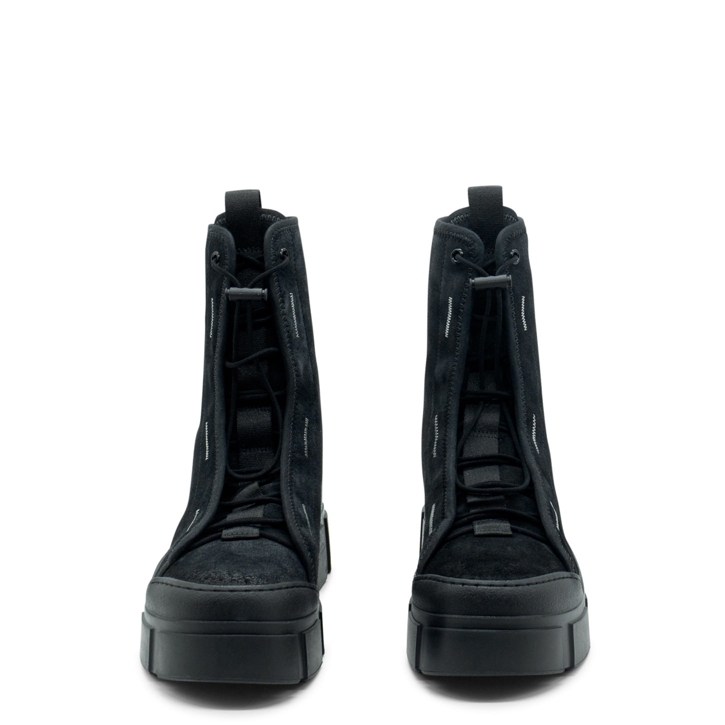 Der schwarze Boot Roccia mit schwarzen Zickzack-Details und Besätzen ist aus Kalbsspaltleder im Used-Look gefertigt und hat eine verstellbare elastische Schnürung mit Kordelzug, eine Ton in Ton gehaltene Grosgrain-Zunge und lässt sich dank des Reißverschlusses mit logoverziertem Zugband an der Rückseite ganz einfach anziehen. TPU-Schalensohle mit Reliefprägungen und weichem TAG-Fußbett mit Kalbslederbezug. Made in Italy.