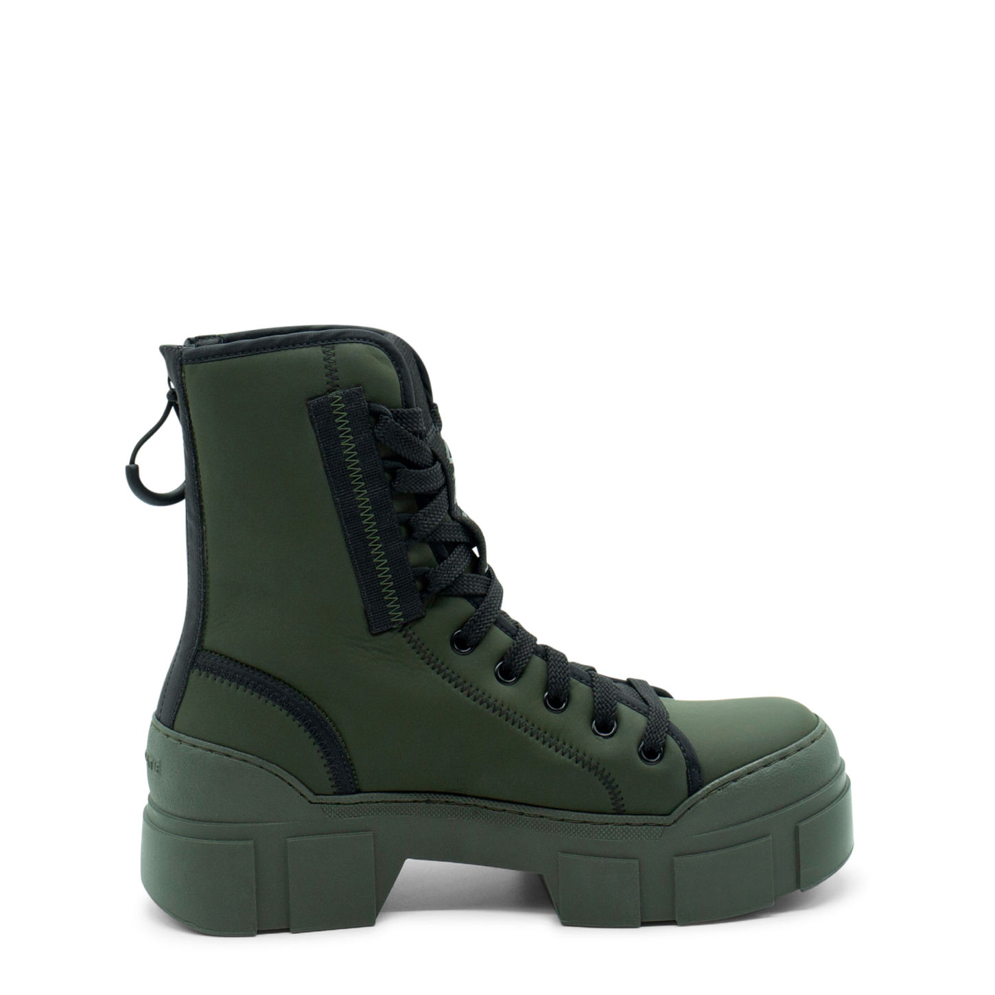 Der Boot Roccia im Military-Look mit Gummistiefel-Effekt und Gummi-Reißverschluss an der Rückseite ist aus technischem Gewebe gefertigt und hat kontrastierende Bordüren, Bänder und Zickzacklinien. TPU-Schalensohle mit Reliefprägungen und weichem TAG-Fußbett mit Kalbslederbezug. Made in Italy.