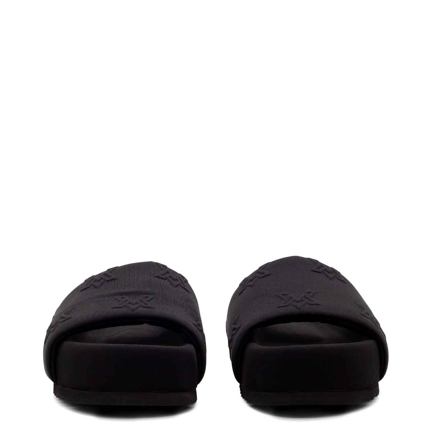 Bubble-Flatform-Slipper aus schwarzem gepolstertem Lycra mit Relief-Monogramen. Mit dem Obermaterial abgestimmten Ton-in-Ton-Lycra überzogenem