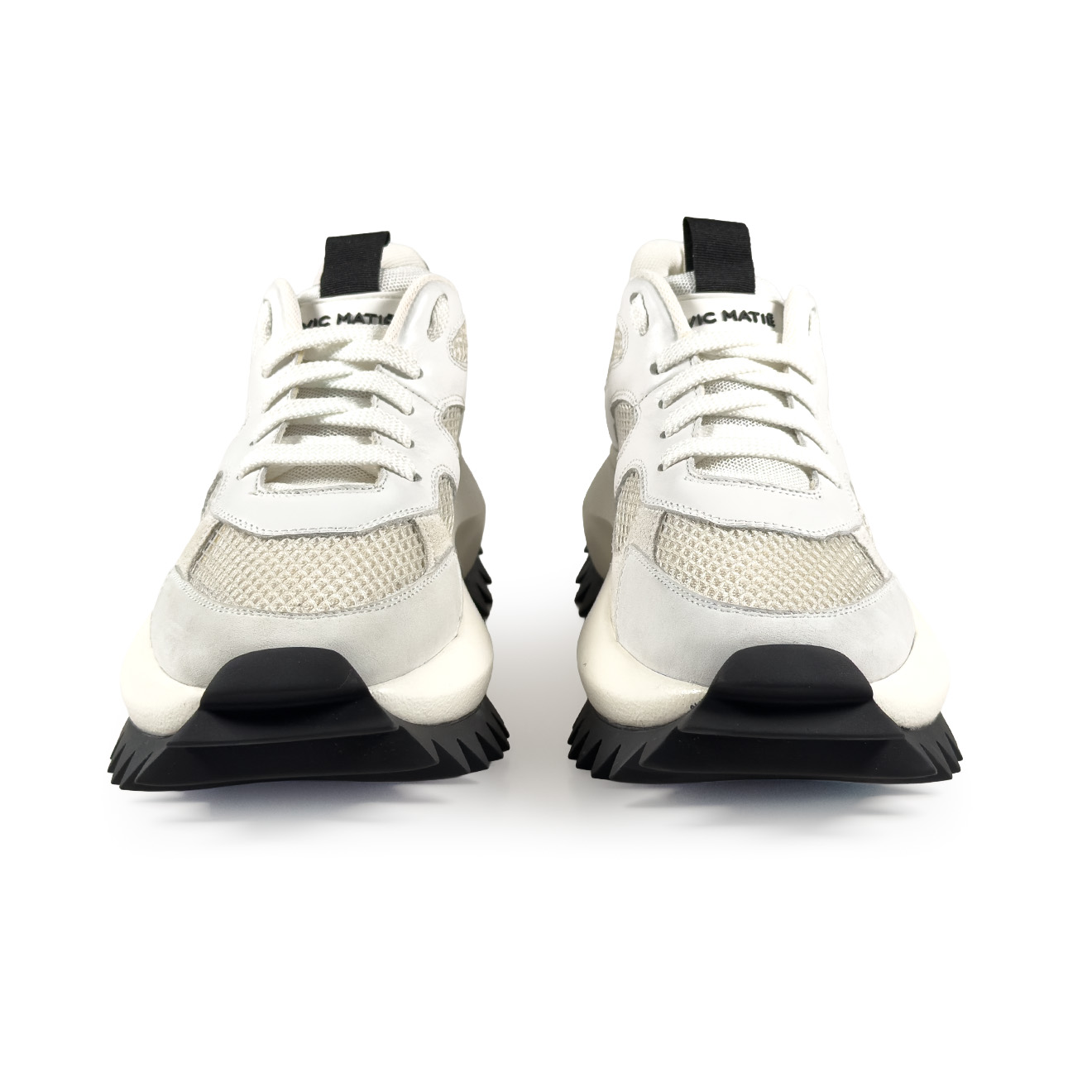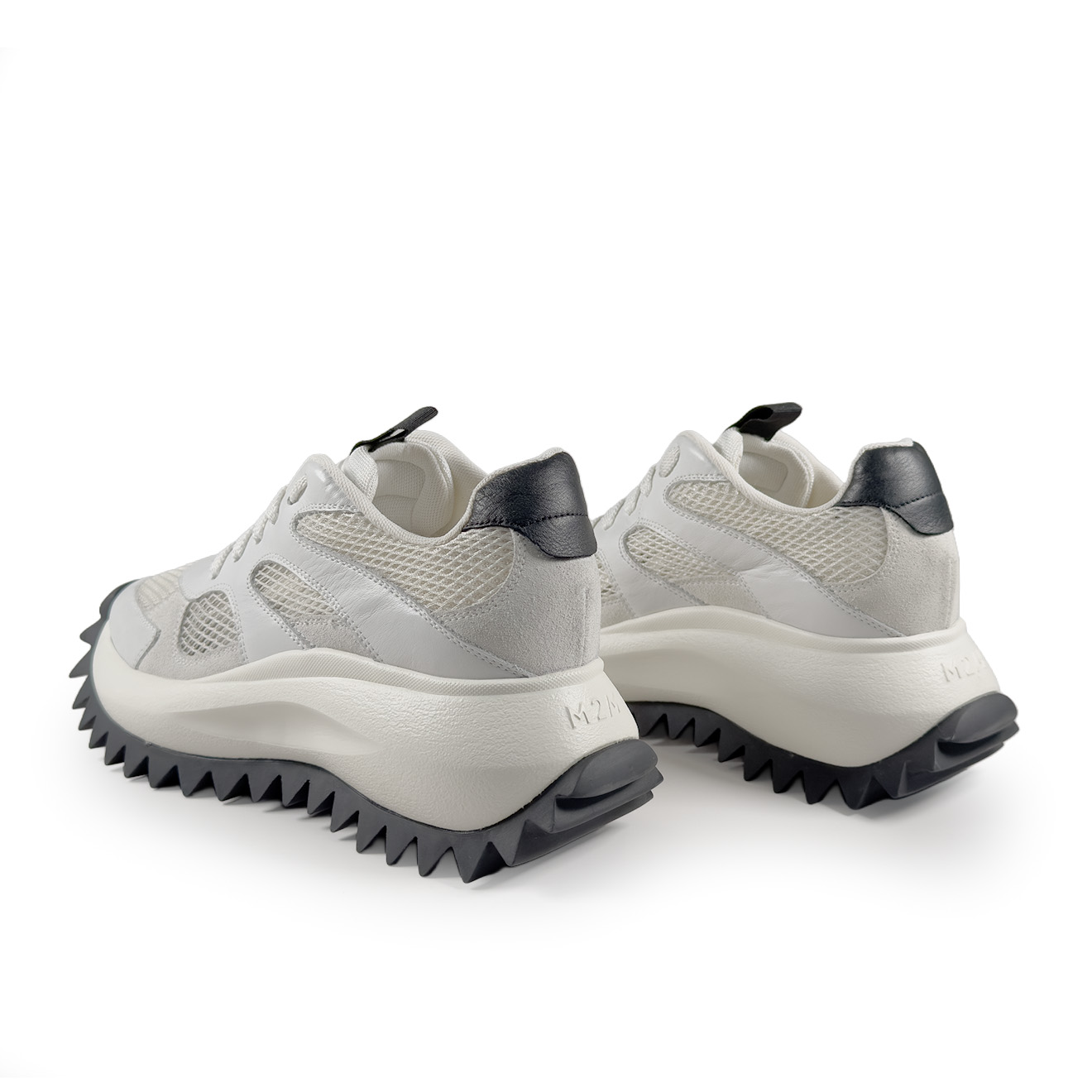D22 Running__Schnürschuh weiß/schwarz,Sneaker aus Mesh, Nubuk und Kalbsleder, komplett in Weiß mit schwarzen Details. Oversize-XL-Extra-Light-Sohle mit gezahntem Profil und Maxi-Spikes. Leicht, bequem und ideal für Streetwear-Looks. Anatomisches Fußbett, mit Baumwolle bezogen.