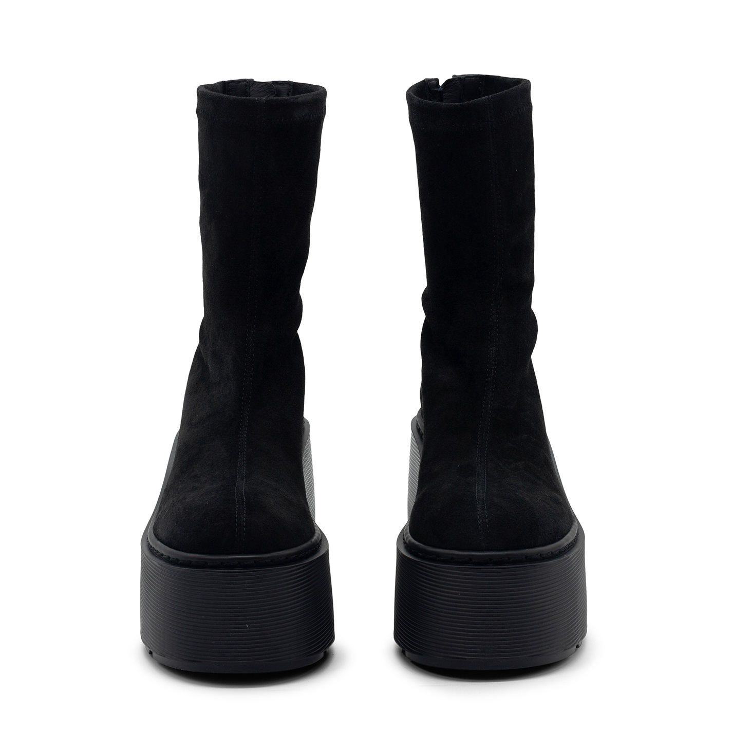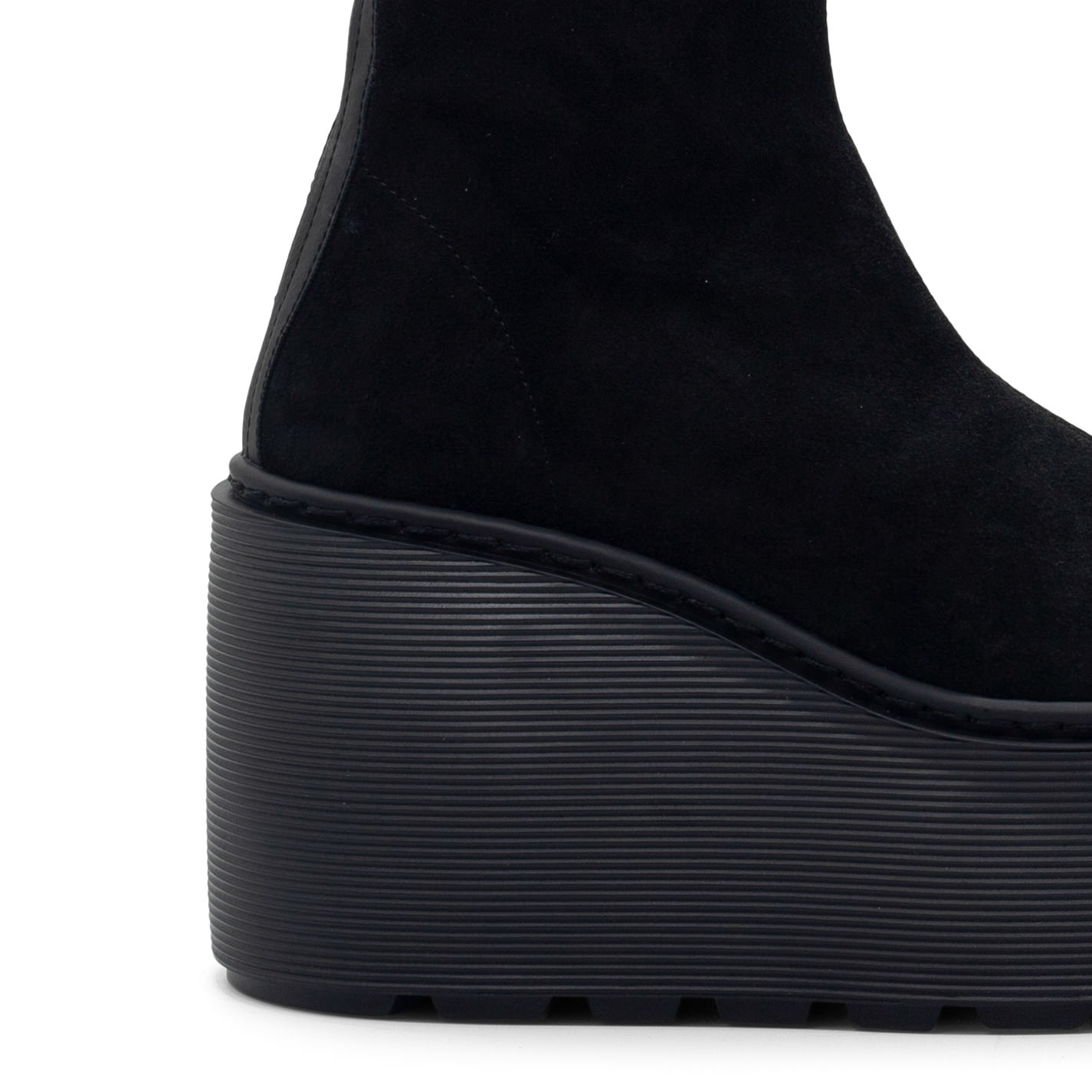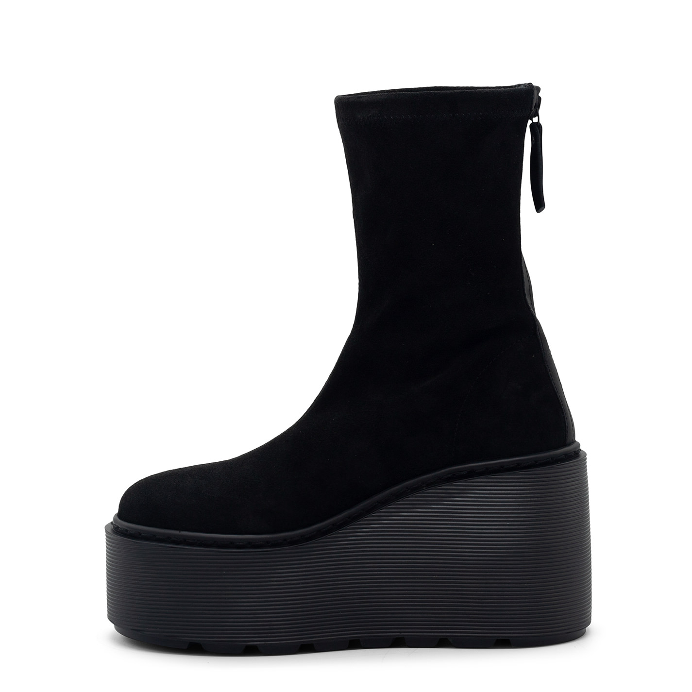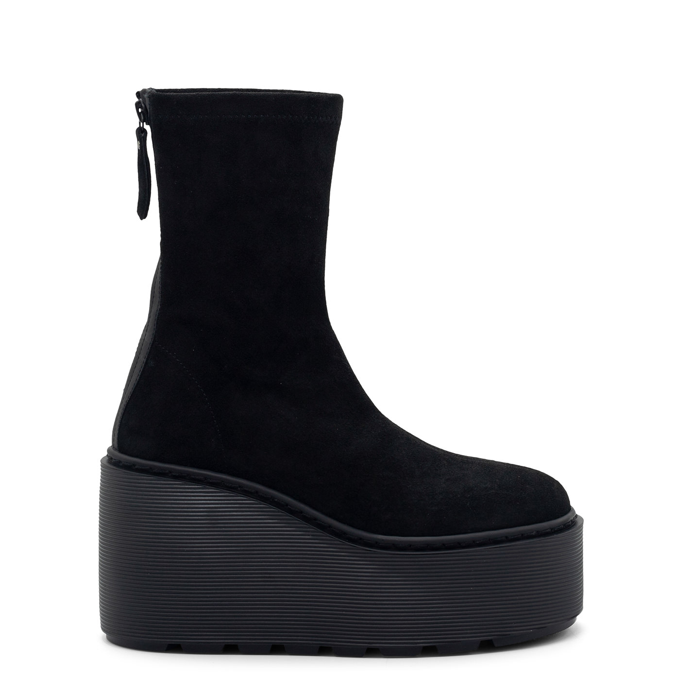 F20 Stripy-Keil-Stiefelette mit Reißverschluss in schwarzem Stretch-Veloursleder, mit tonalem, perlenartigem Reißverschluss hinten. Gummikeilsohle mit Rillenstruktur und rutschfestem Profil. Hergestellt in Italien.