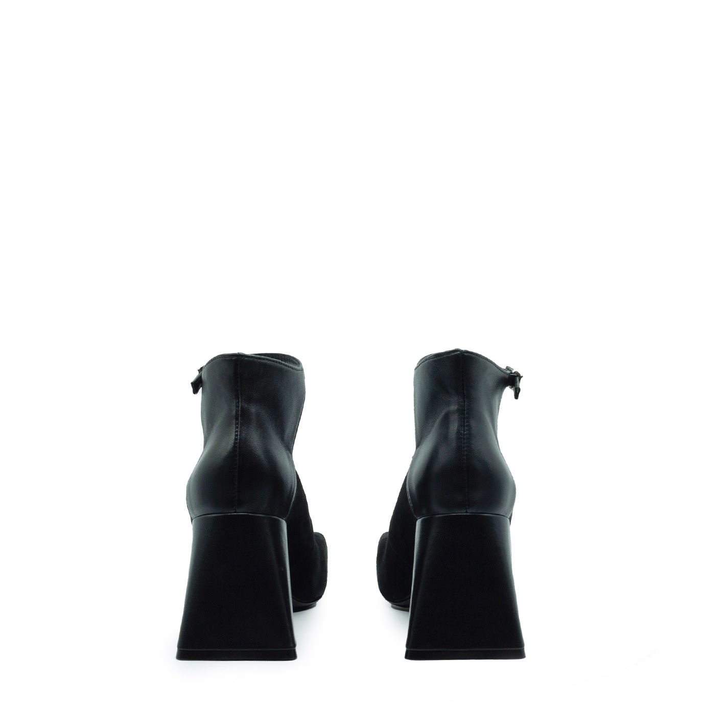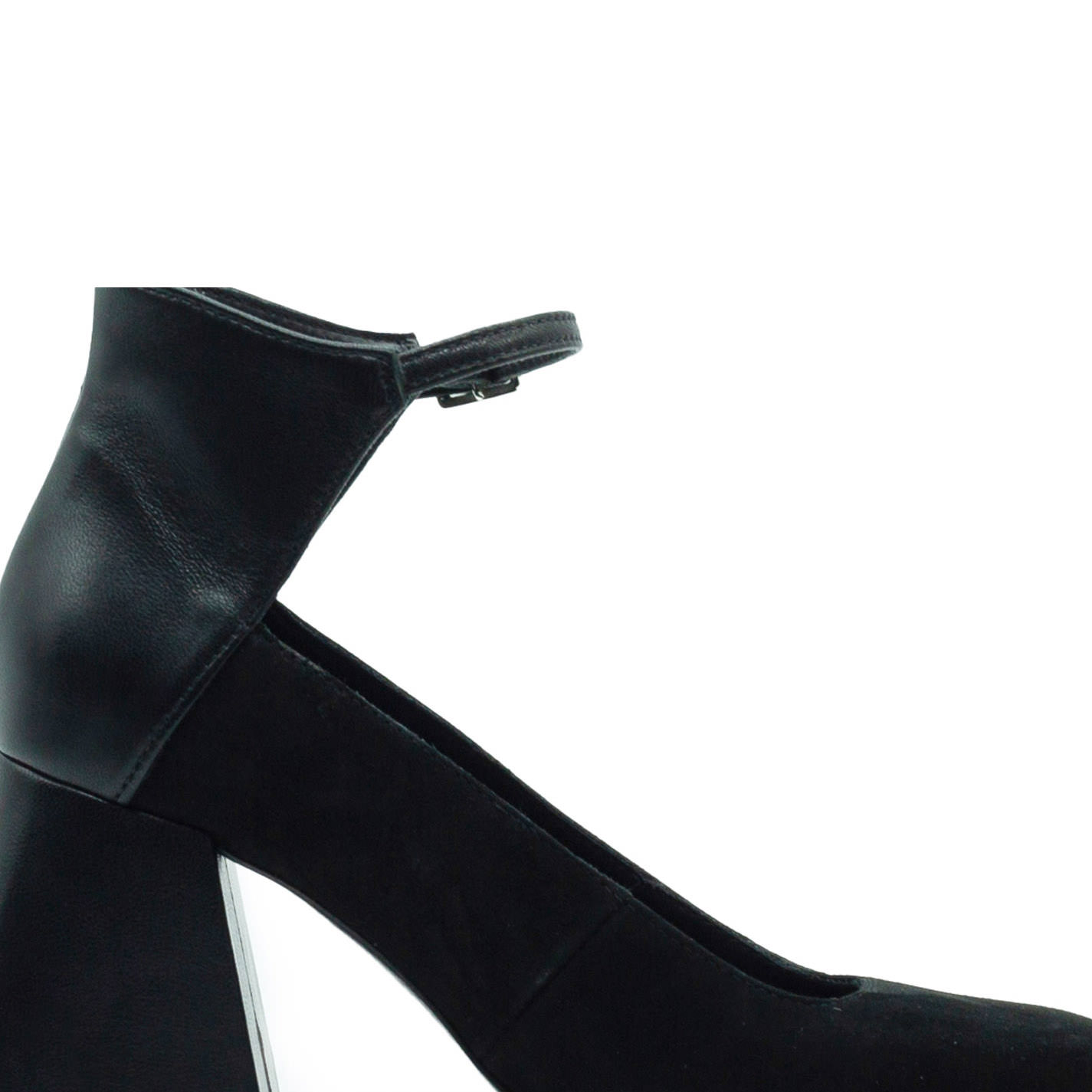 Die schwarze High-Heel-Sandalette Ming aus Wildleder und Nappaleder hat einen verstellbaren Riemen mit Schnalle und einen quadratischer Ausschnitt. Der Schuh besitzt eine Ledersohle und einen quadratischen Blockabsatz, der mit Leder überzogen ist. Made in Italy.