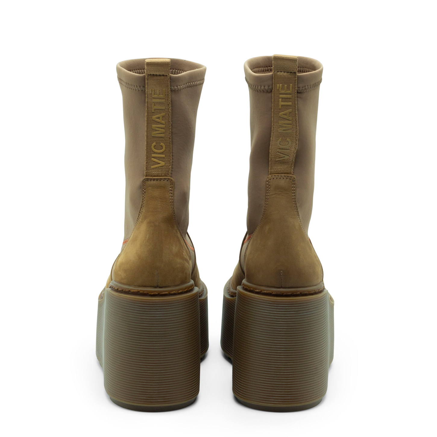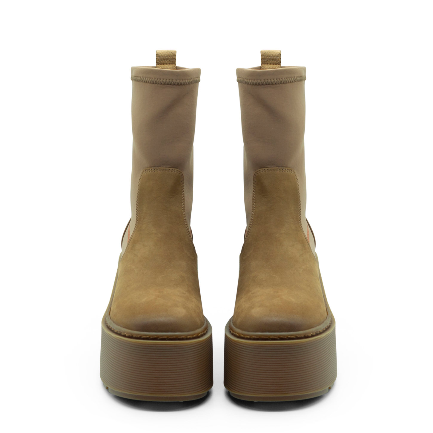 Der Keilabsatz-Boot Stripy in Honig ist aus Nubukleder gefertigt und der Schaft aus elastischem Neopren mit einem Ton in Ton gehaltenen logoverzierten Band an der Rückseite. Der Keilabsatz besteht aus Gummi mit einem Streifen-Effekt und verfügt über ein rutschfestes Profil mit Kerben. Made in Italy.
