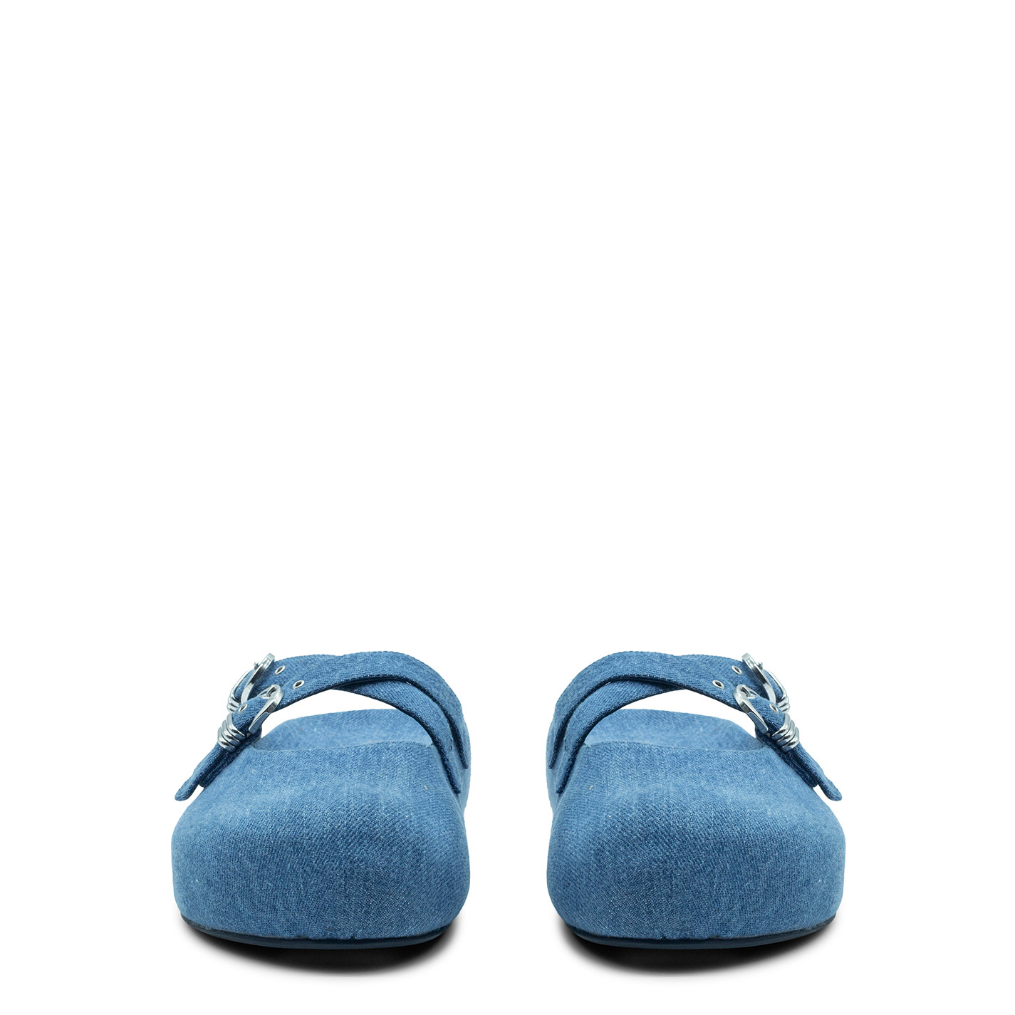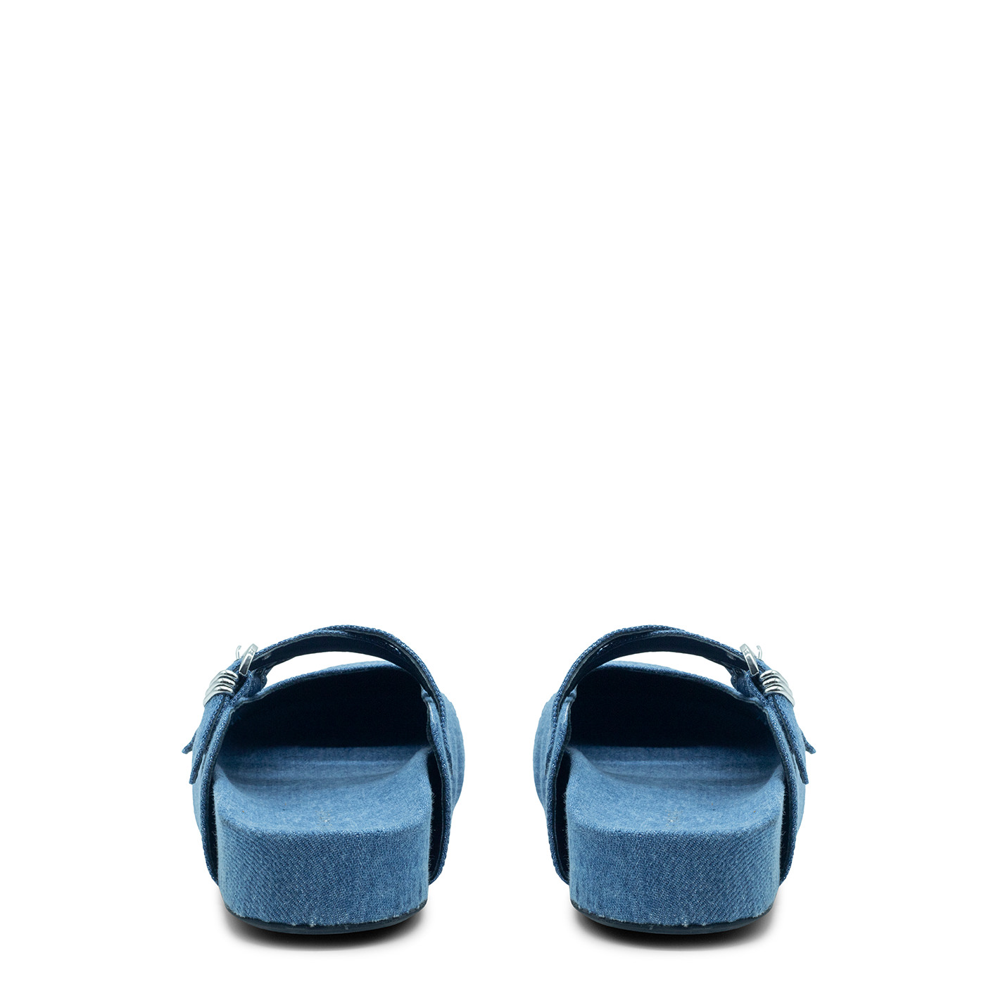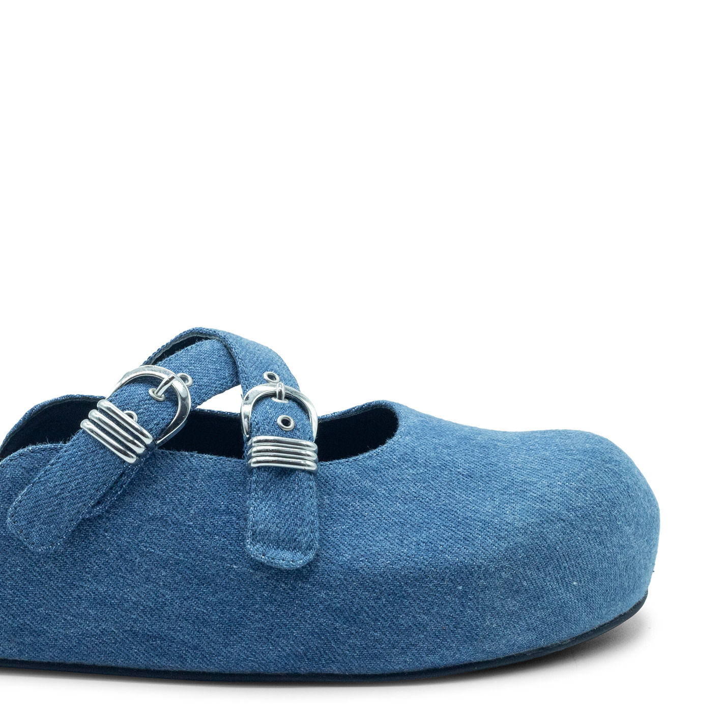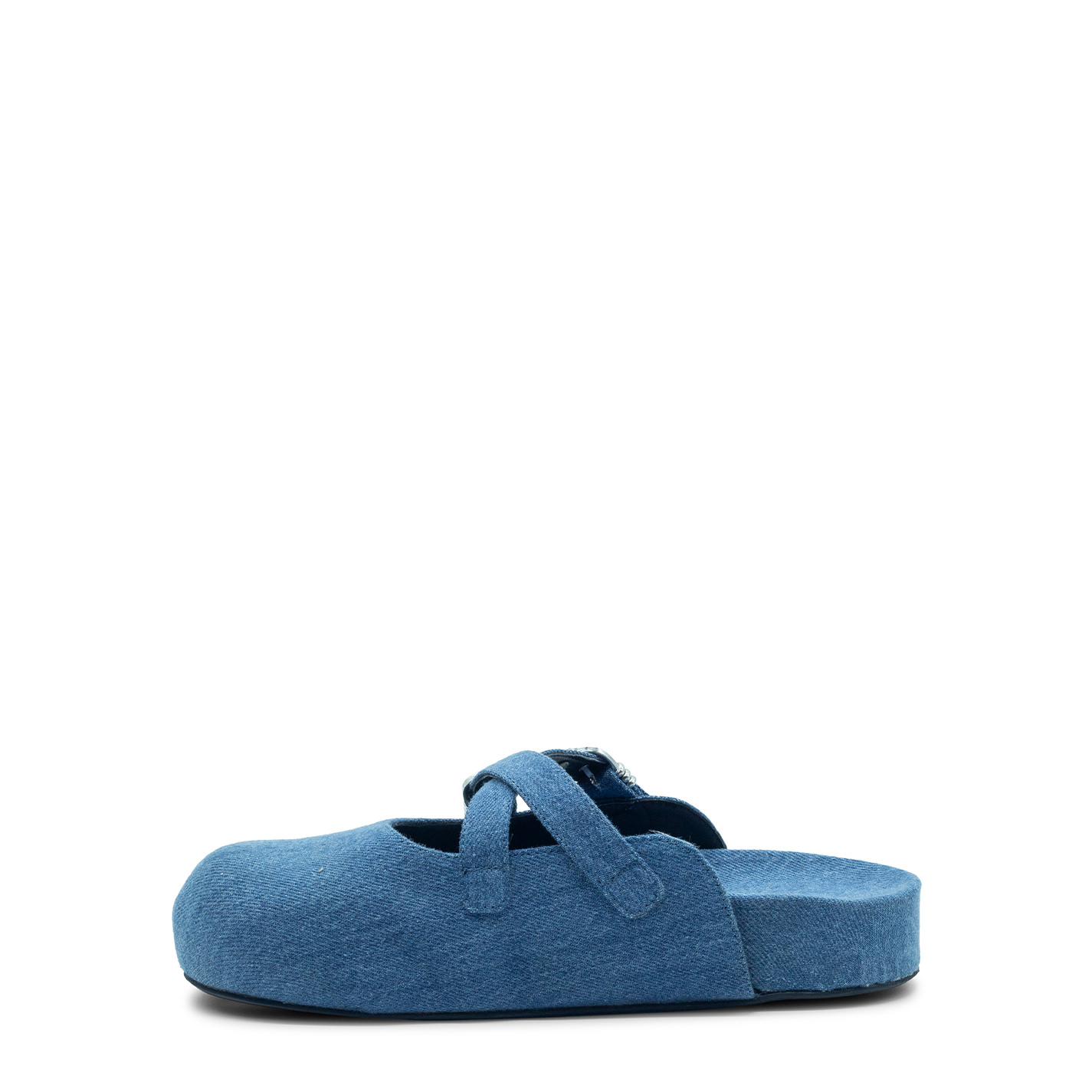 Klompen sabot aus hellblauem Stone-Wash-Denim, mit doppelt gekreuzten Riemen auf der Vorderseite und verziert mit verstellbaren Schnallen mit Metallschlaufen. Anatomischer Fusbett, der mit dem gleichen Material wie das Obermaterial überzogen ist. Geprägtes VM-Monogramm in der Mitte. Dünne Gummisohle. Hergestellt in Italien.