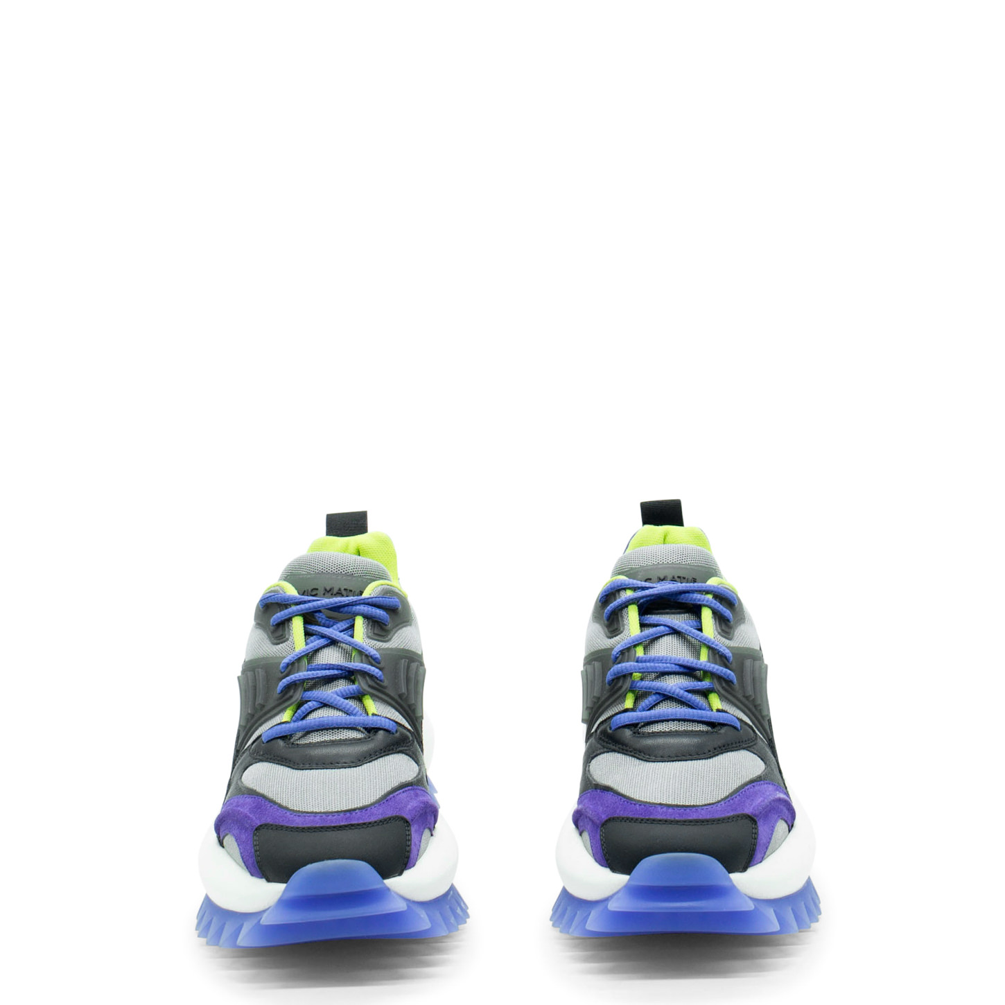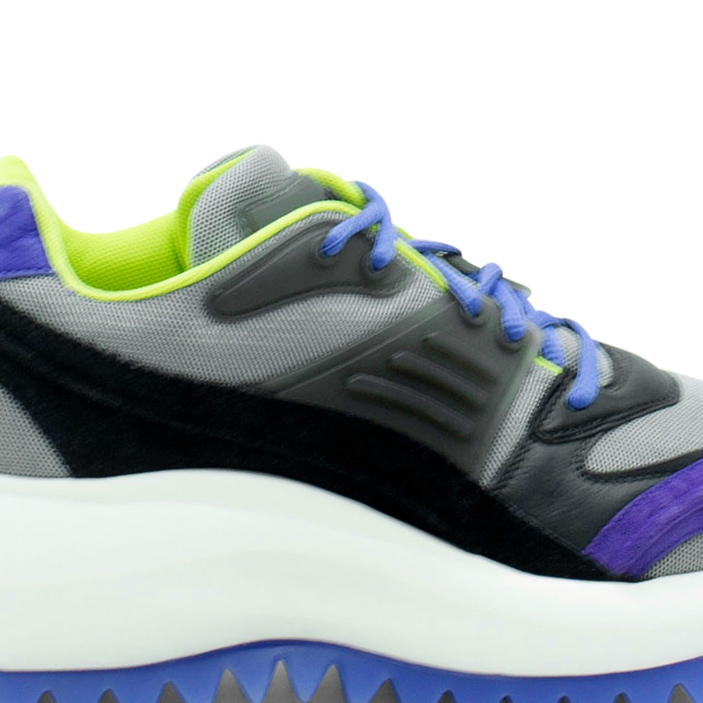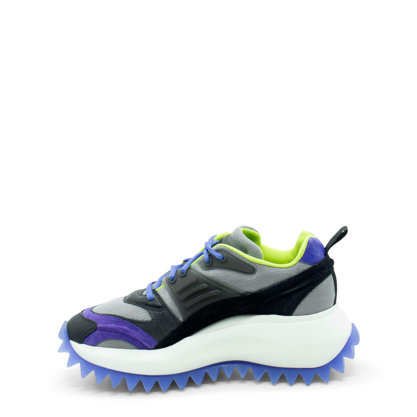 Laufschuh in Schwarz/Lila/Grau aus Nubuk, Leder und Mesh sowie Spaltleder mit Accessoires, Schnürsenkelschlaufen und Pads aus Gummi, die auch das Obermaterial zieren. Einteilige extraleichte XL-Sohle mit Logo, Gummibeschichtung und Profil mit Maxi-Spikes, anatomisches Fußbett aus reiner Baumwolle. Made in Italy.