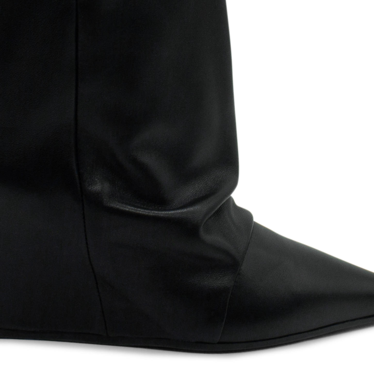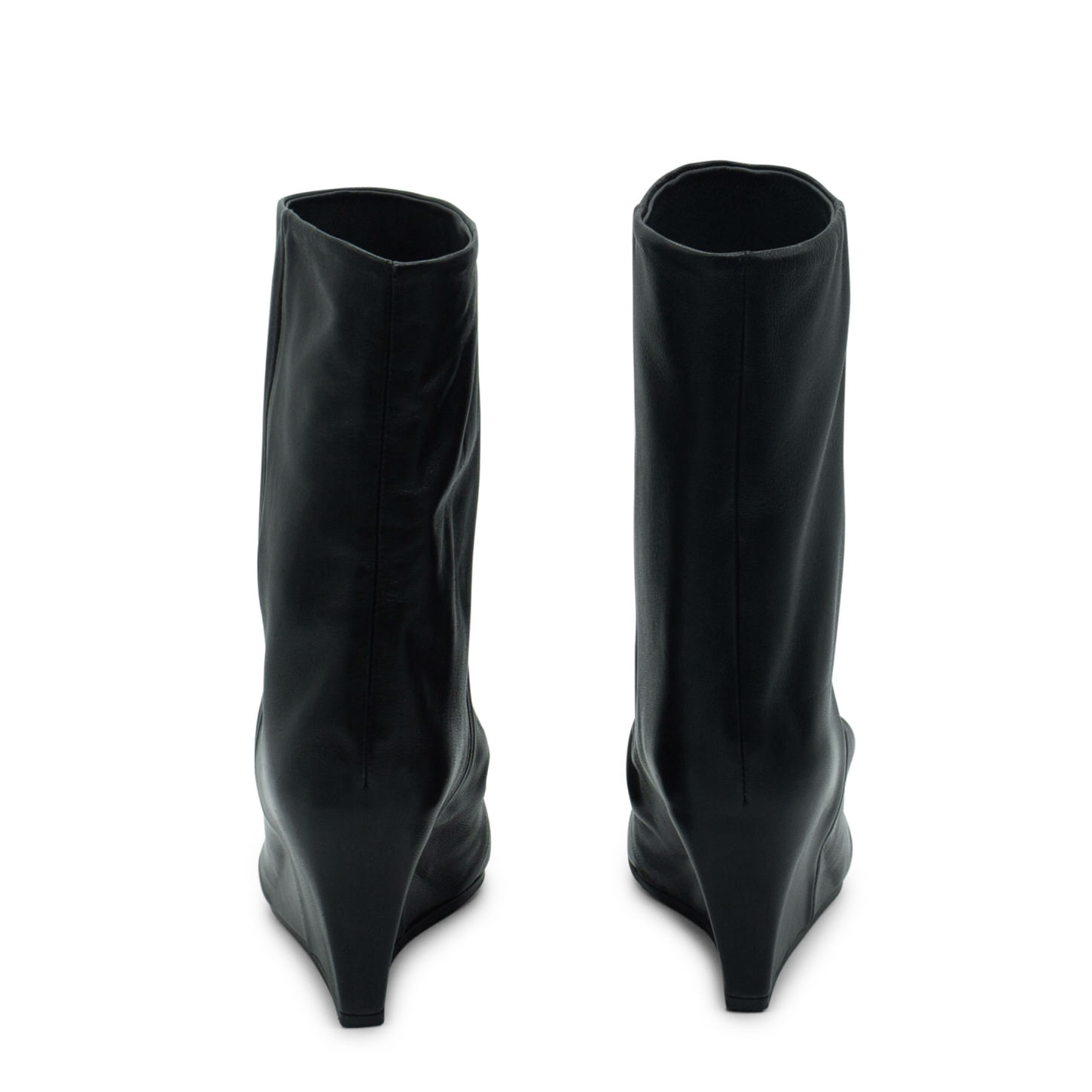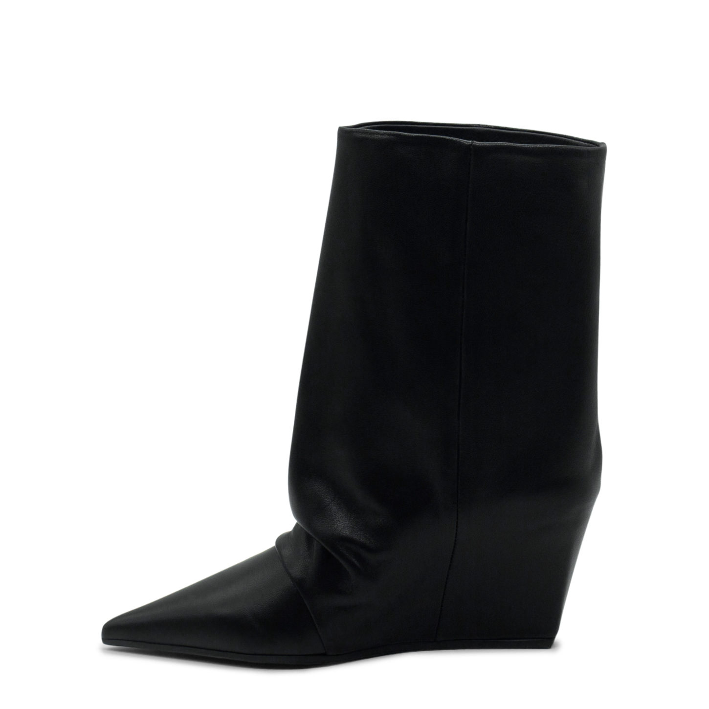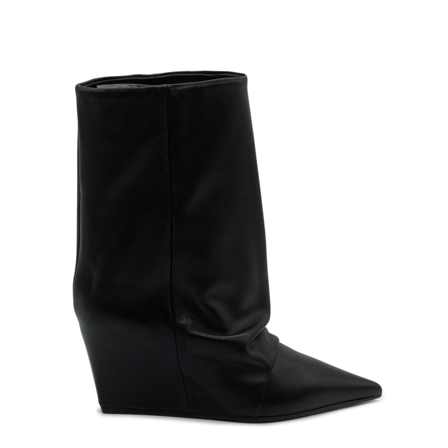Die minimalistische Schlauchstiefelette Cocoon in Schwarz ist aus weichem Nappaleder gefertigt und zeichnet sich durch elegante Falten auf der Vorderseite aus. Die interne Keilsohle ist in Leder eingefasst, die Spitze ist schlank zulaufend gestaltet, und die Sohle aus rutschfestem Gummi bietet sicheren Halt. Made in Italy.