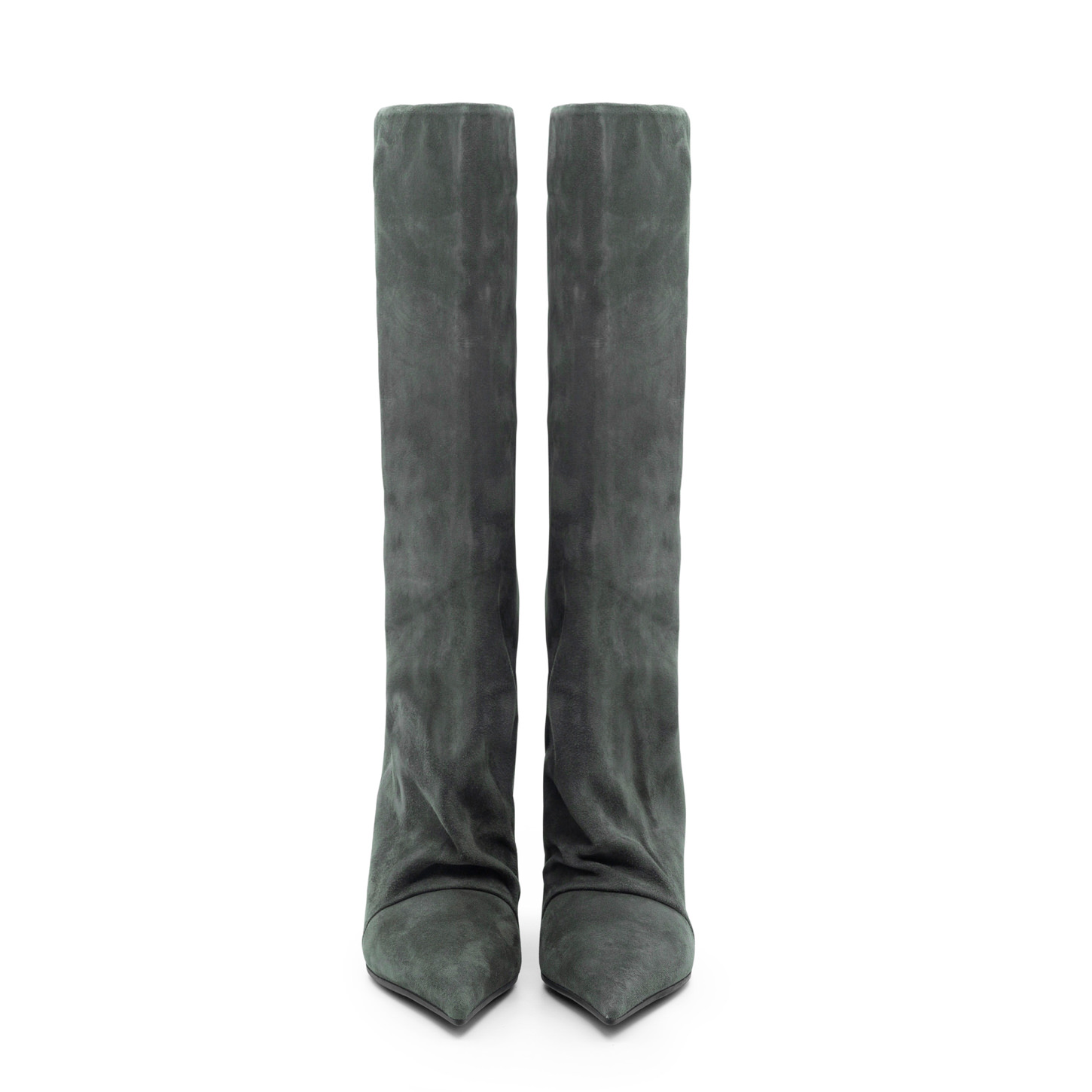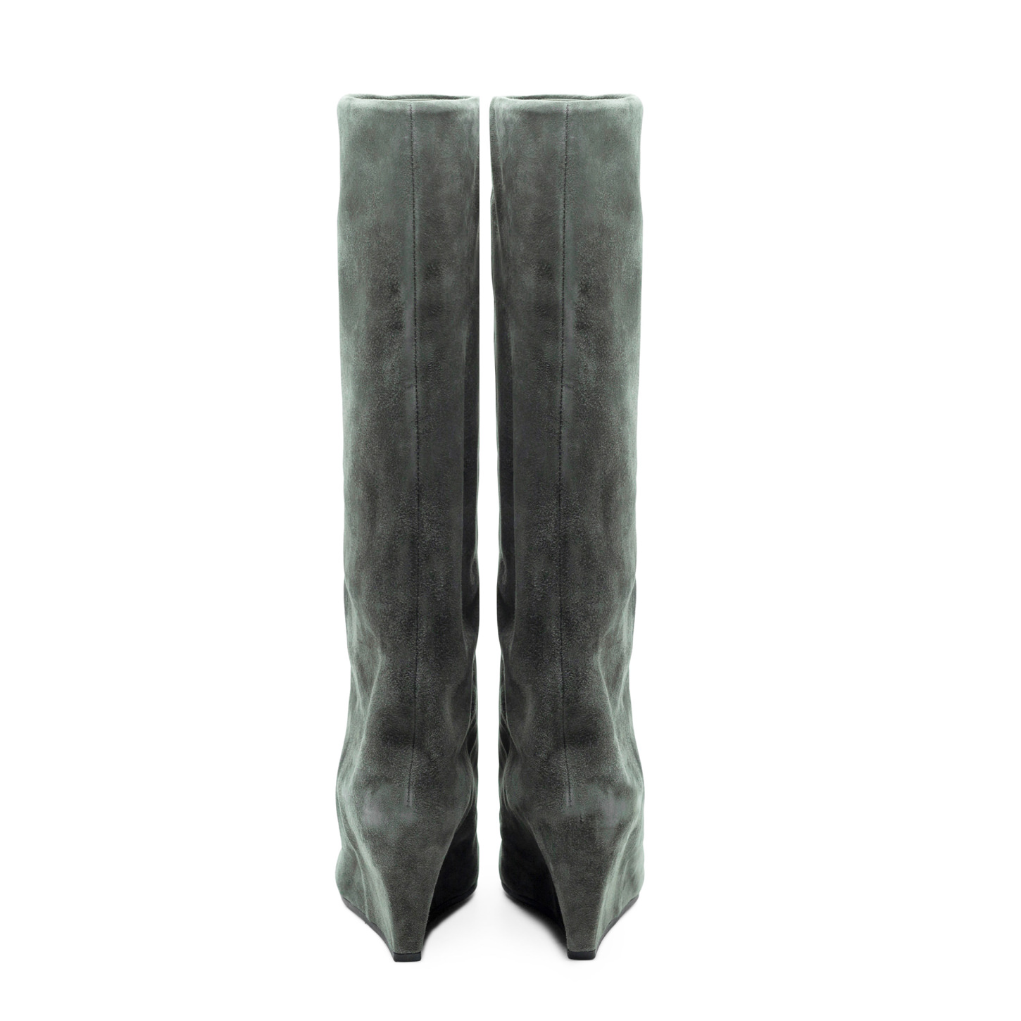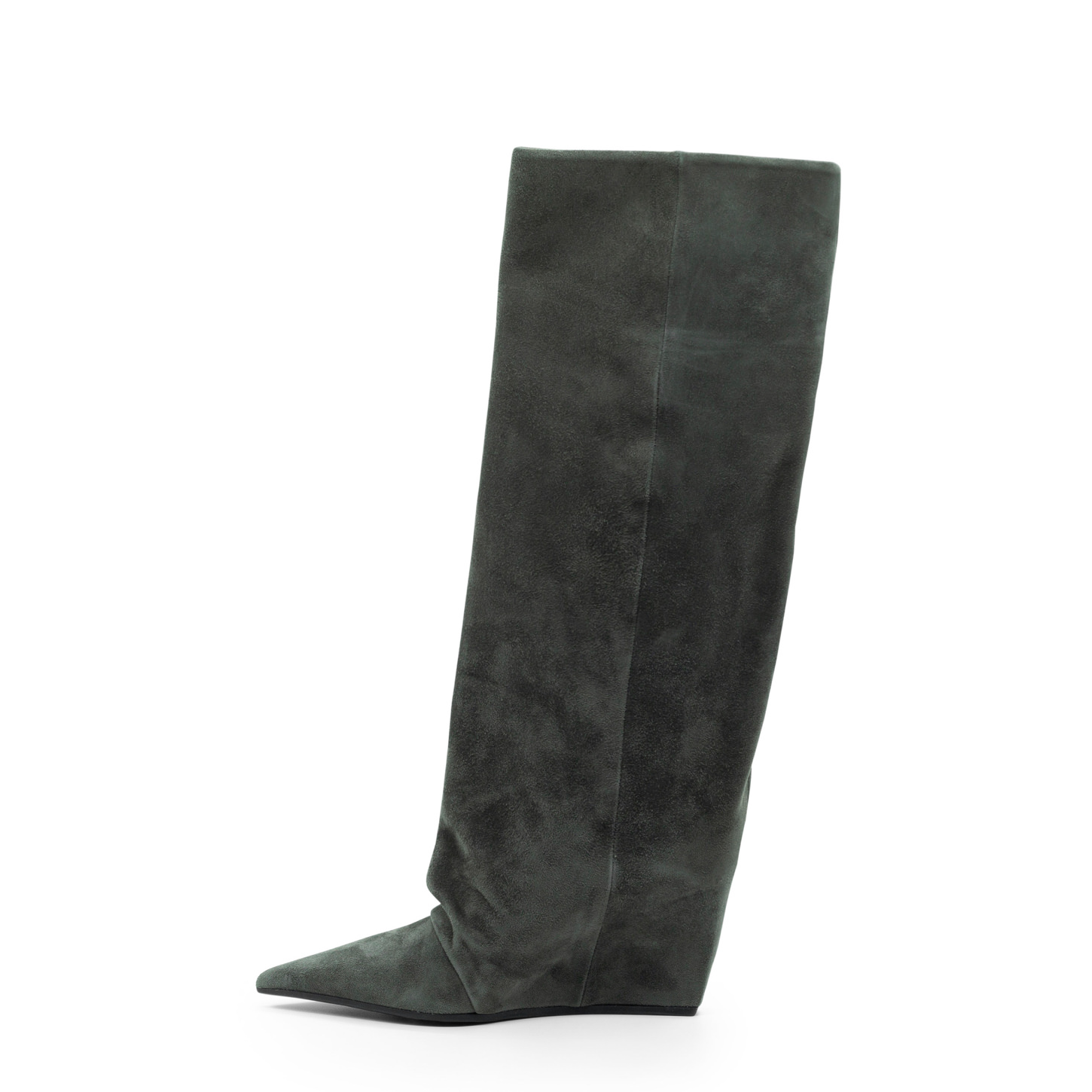 Der minimalistische Schlauchstiefel Cocoon in Schlamm ist aus weichem Wildleder gefertigt und zeichnet sich durch elegante Falten auf der Vorderseite aus. Die interne Keilsohle ist in Leder eingefasst, die Spitze ist schlank zulaufend gestaltet, und die Sohle aus rutschfestem Gummi bietet sicheren Halt. Made in Italy.