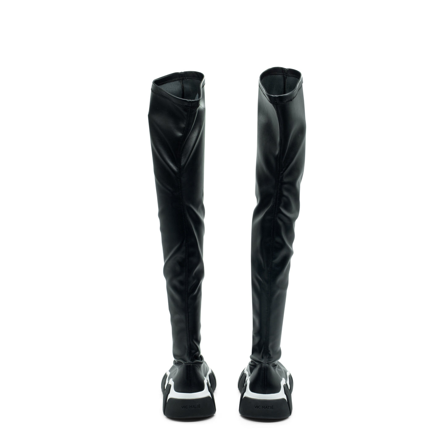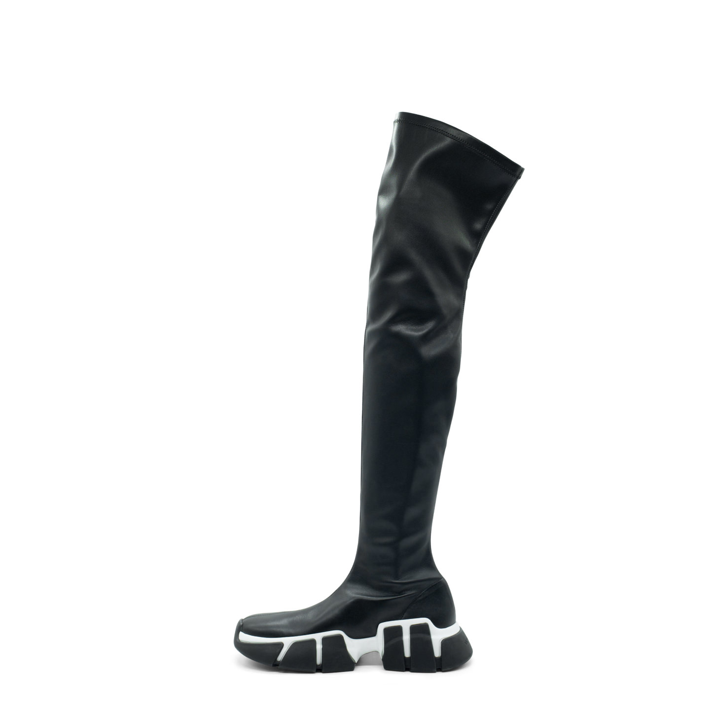 Der schwarze Overknee-Stiefel Mano ist schlank und eng anliegend. Die Monoblock-Gummisohle mit kontrastierenden Stollen ist inspiriert von einer „Hand“, die einen Schuh hält. Das weiche Fußbett ist mit Leder bezogen. Made in Italy.