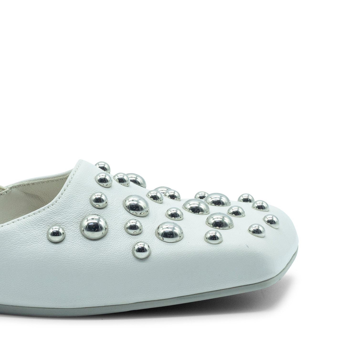 Quadrat closed pantofola Creme, aus weichem Nappaleder, mit silbernen halbkugelförmigen Nieten an der Spitze. Leicht hochgeschlossen, mit einem kleinen Gummizug innen, der eine bessere Passform ermöglicht. Rutschfeste Gummisohle mit Maxi-Logo mit schräger quadratischer Spitze; Komfort-Einlegesohle aus Leder. Hergestellt in Italien.