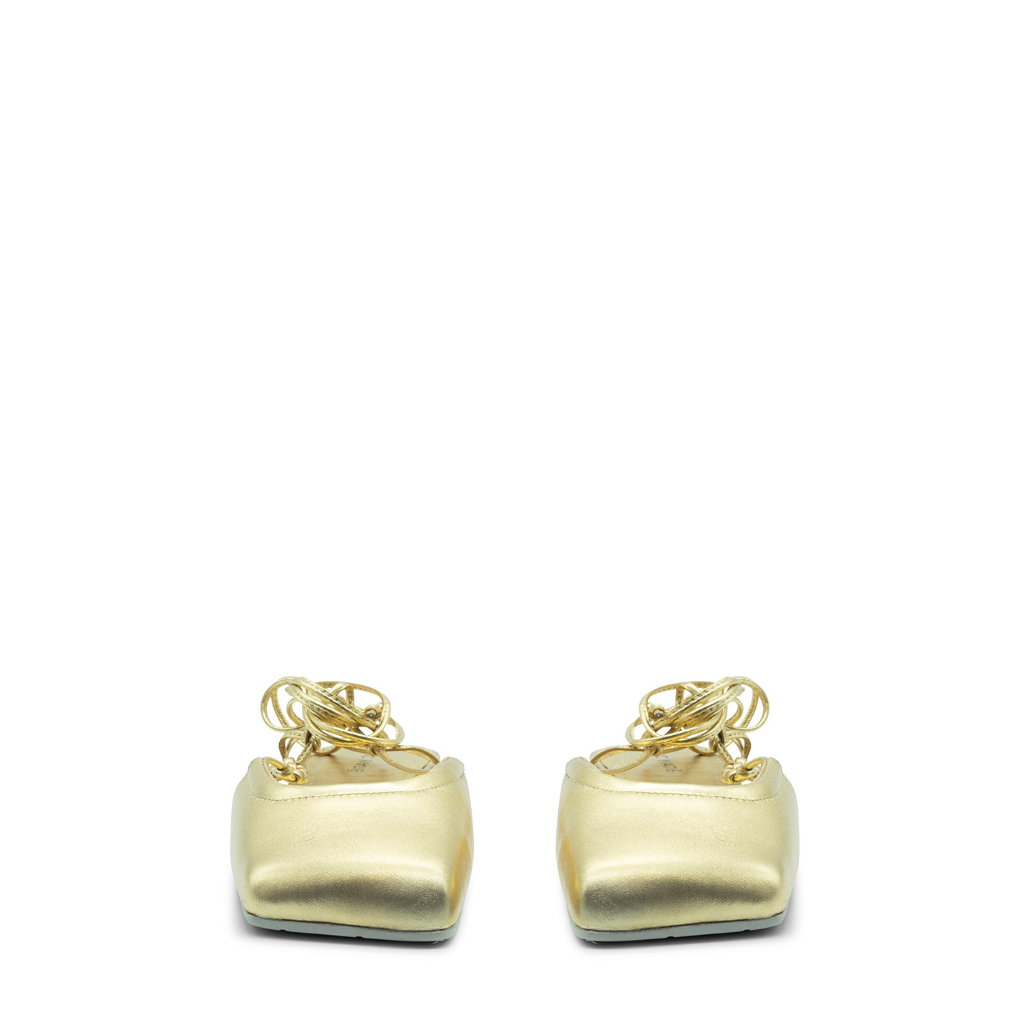 Quadrat closed sabot Gold, aus laminiertem Nappaleder mit asymmetrischem Ausschnitt und Lederspitze, die von demselben ausgeht und die geknoteten Schlaufen aufnimmt und sie dann nach Belieben am Knöchel umwickelt. Rutschfeste Gummisohle mit Maxi-Logo mit schräger quadratischer Spitze; Komfort-Einlegesohle aus Leder. Hergestellt in Italien.