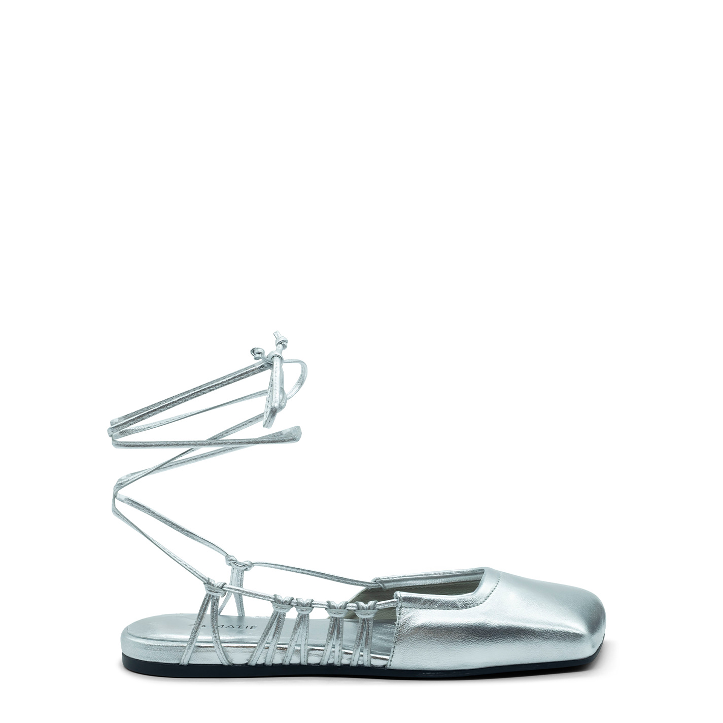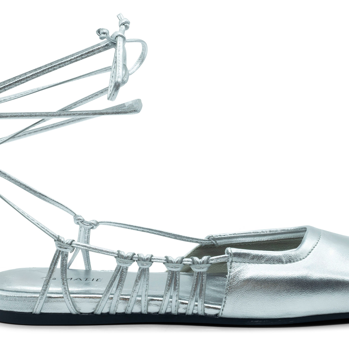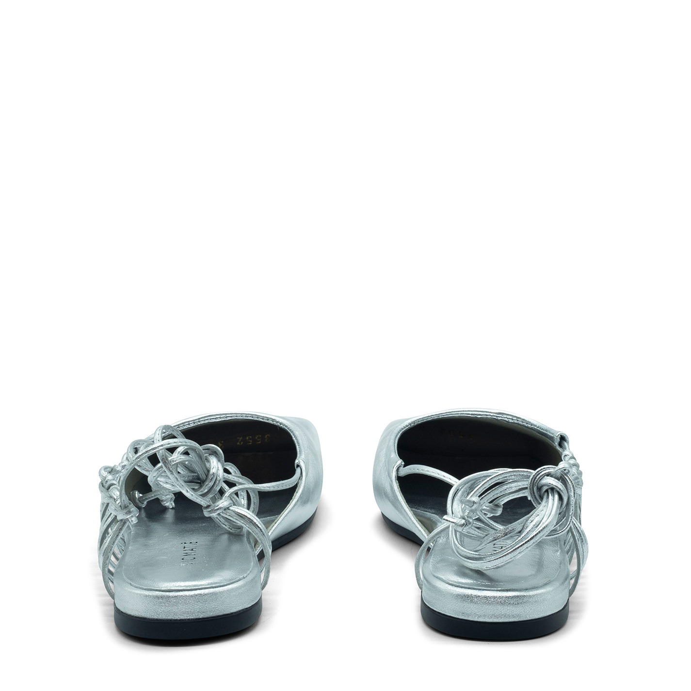 Quadratisch closed sabot Silber aus laminiertem Nappaleder mit asymmetrischem Ausschnitt und Lederspitze, die von diesem ausgeht und die geknoteten Schlaufen aufnimmt und sie dann nach Belieben um den Knöchel wickelt. Rutschfeste Gummisohle mit Maxi-Logo mit schräger quadratischer Spitze; Komfort-Einlegesohle aus Leder. Hergestellt in Italien.