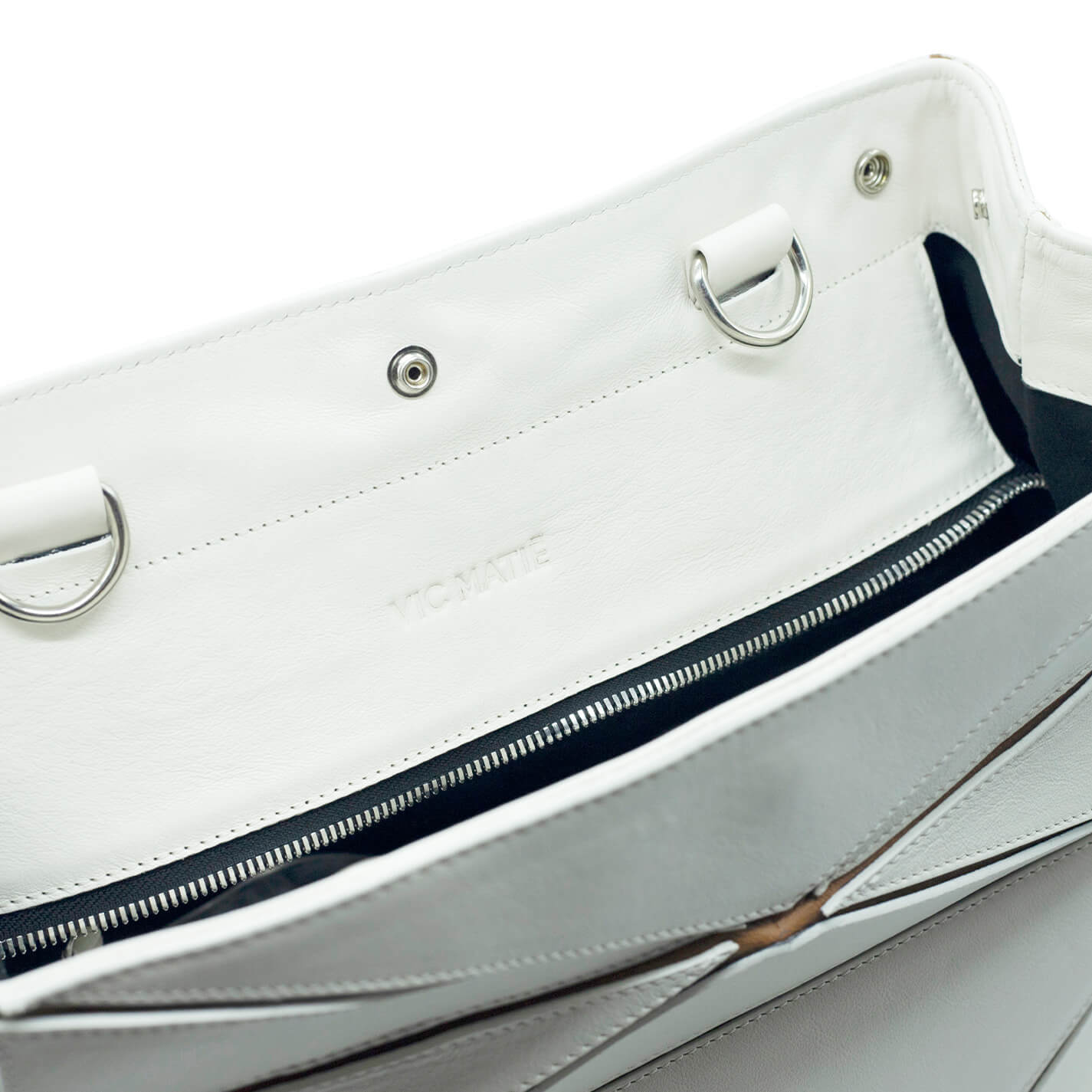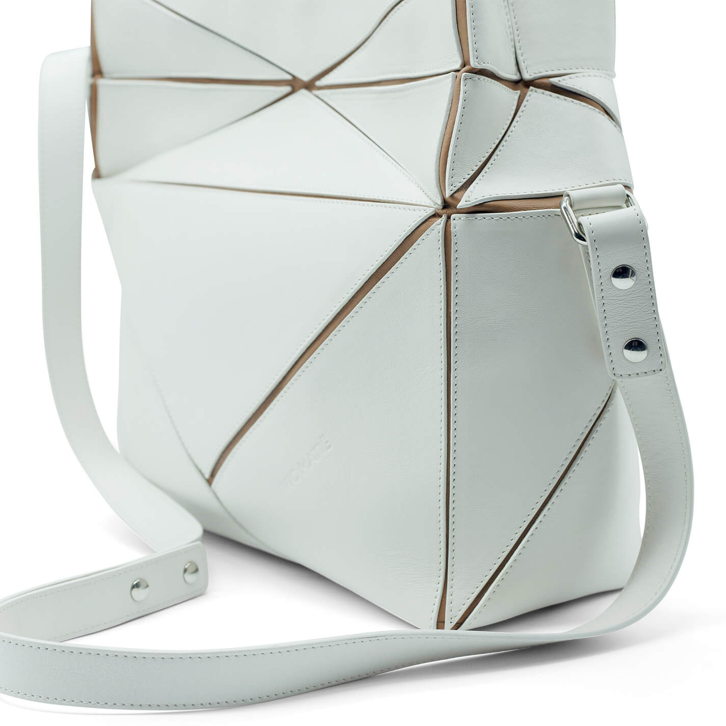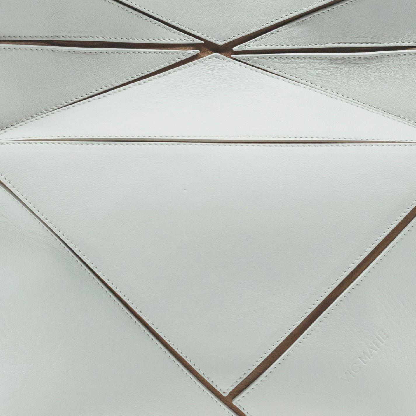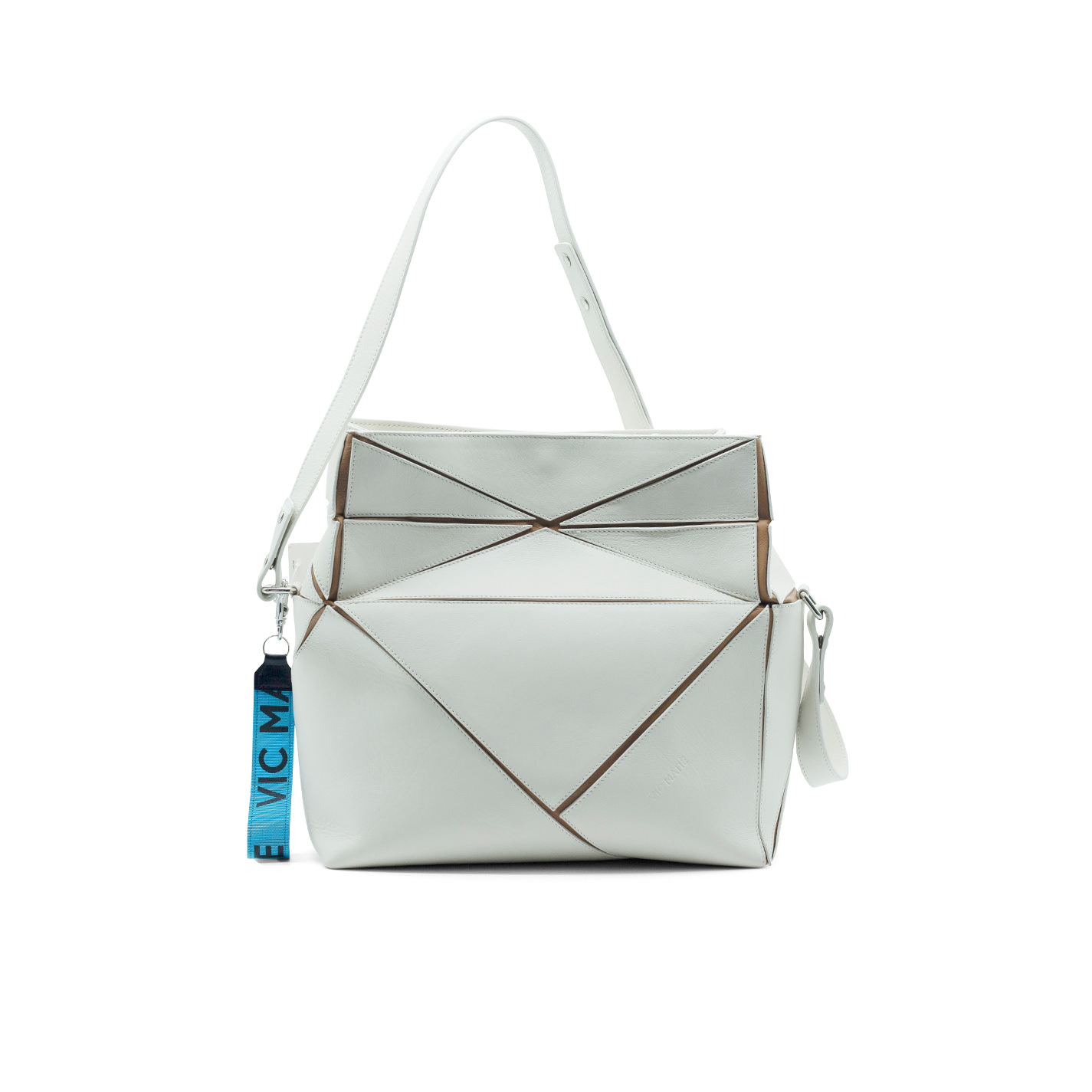 Cremefarbener Beutel-Aufnäheraus glattem Kalbsleder. Mit genähten Lederdreiecken. Schnappverschluss; Abnehmbare Griffe, die zu Schultergurten werden. Schlüsselanhänger mit Logo im Lieferumfang enthalten.