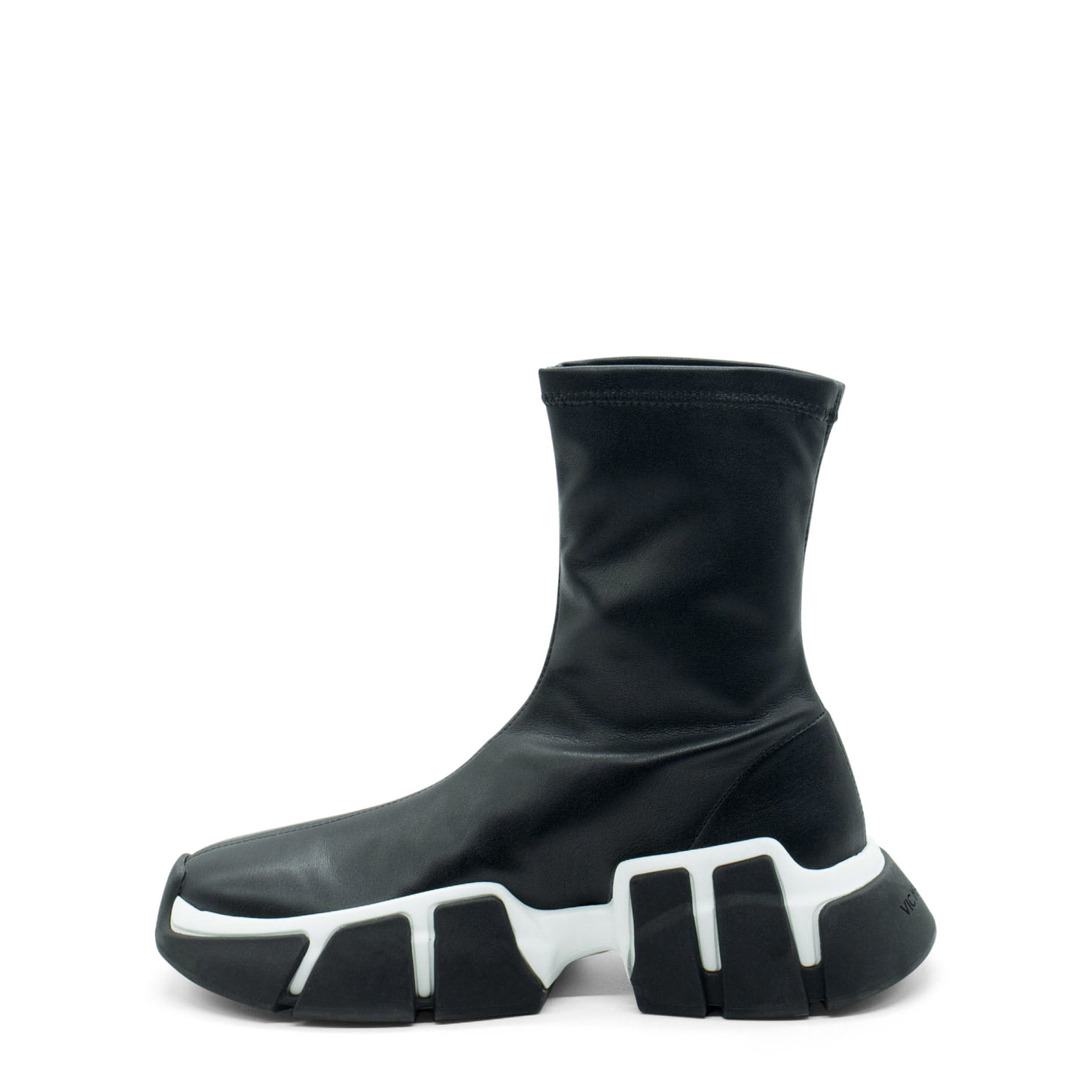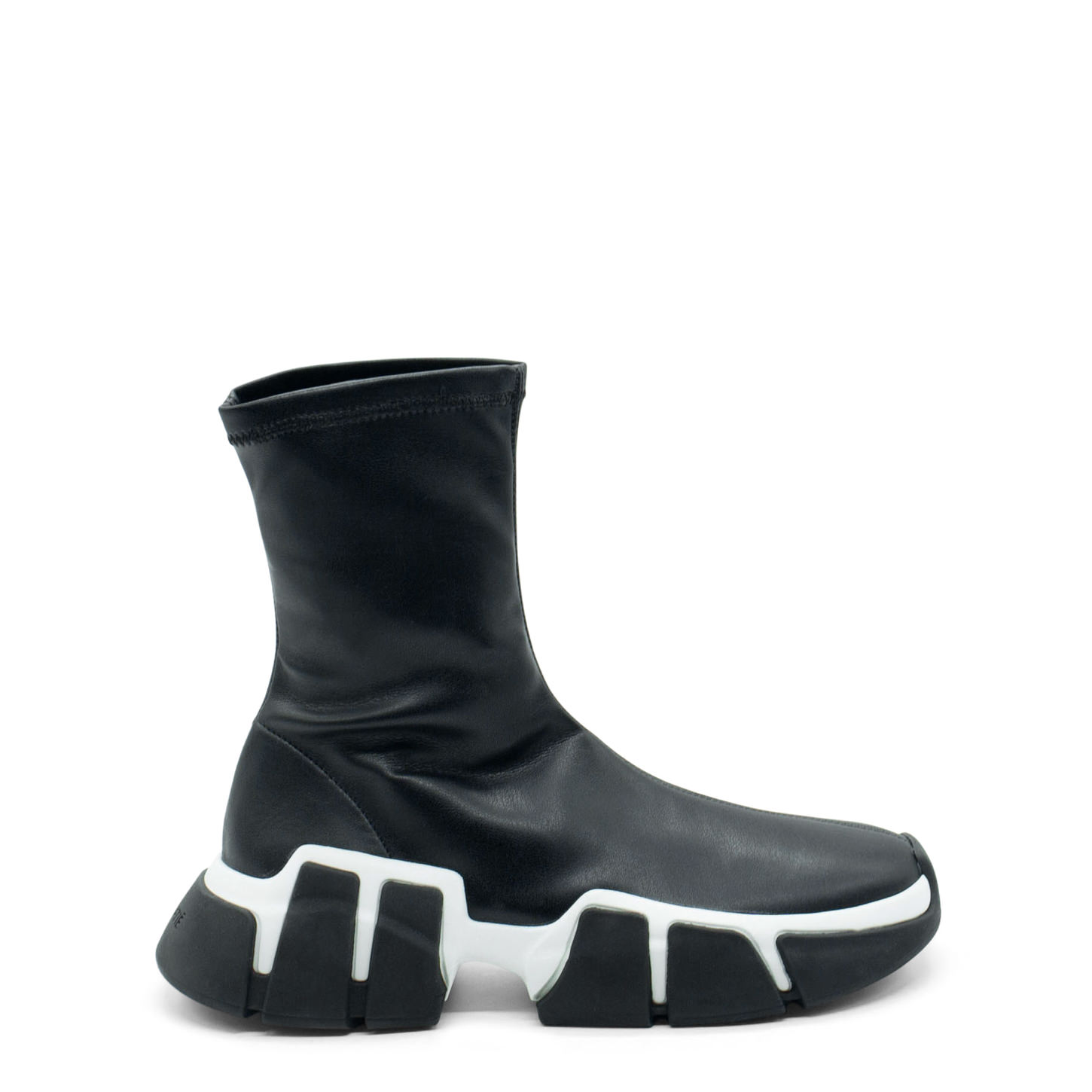Der schlanke und eng anliegende Schlauchboot Mano in Schwarz ist aus ungefüttertem Stretch-Kunstleder gefertigt. Die Monoblock-Gummisohle mit Stollen ist inspiriert von einer „Hand“, die einen Schuh hält. Das weiche Fußbett ist mit Leder bezogen. Made in Italy.