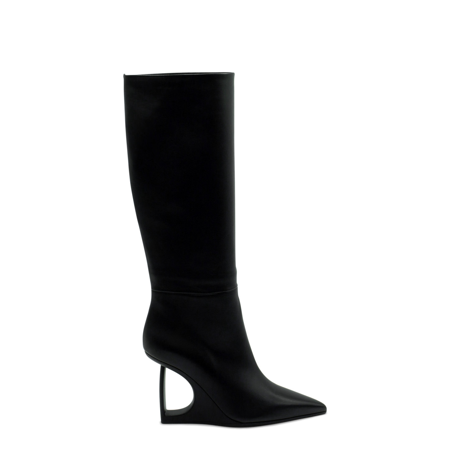 Der Schlauchstiefel „D“ in Schwarz ist aus glattem Kalbsleder gefertigt. Der Keilabsatz ist aus lackiertem ABS gefertigt und zeichnet sich durch ein Design aus, das das „D“ als Symbol für „Donna“ (Frau) kreativ interpretiert. Die Gummisohle ist rutschfest. Made in Italy.