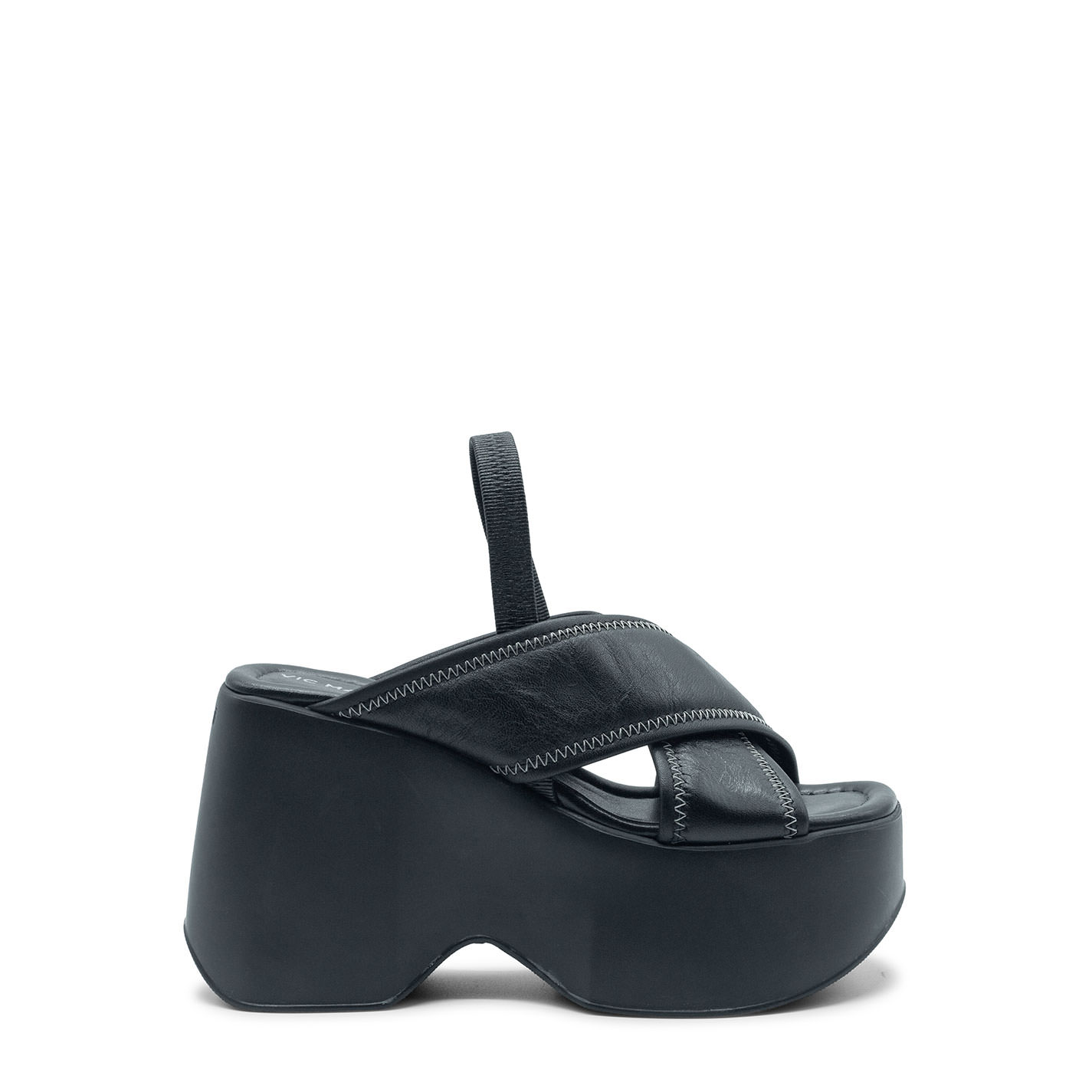 Schwarzes Yoko slipperaus Kalbsnappa, bestehend aus zwei leicht gepolsterten Bändern, die mit Leder eingefasst sind und Ton-in-Ton-Zickzack-Nähte haben; Elastischer Lederbezug für mehr Stabilität. Keil aus superleichtem, bequemem und farblich abgestimmtem gummiartigem Material mit rutschfestem Profil. Gepolsterte Innensohle aus Leder, angereichert mit Nähten. Hergestellt in Italien.