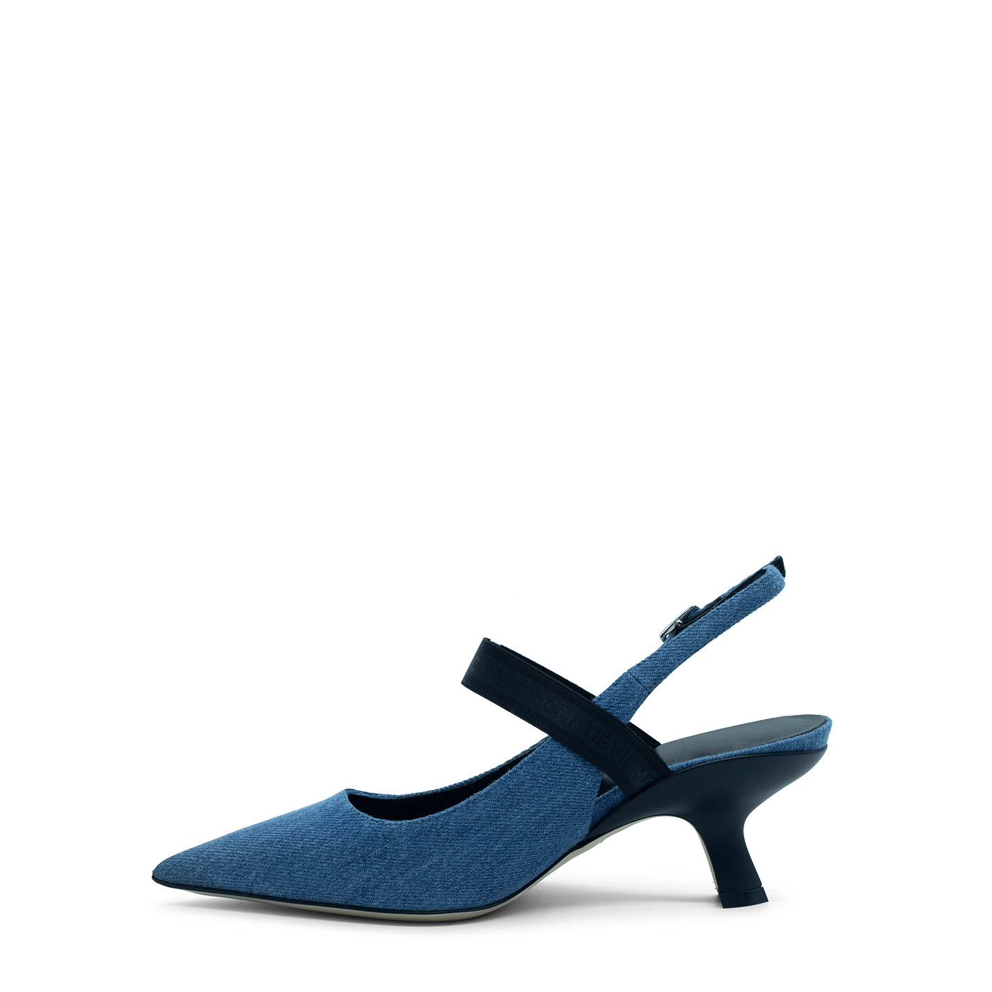 Slash chanel aus hellblauem, gewaschenem Stone-Denim, verstellbarer Schnalle und Ton-in-Ton-Gummizug mit Logo. Sehr feminine spitze Zehenstruktur, mit einem matten Lackabsatz, der an den Slash erinnert. Ledersohle. Innensohle aus Leder. Hergestellt in Italien.