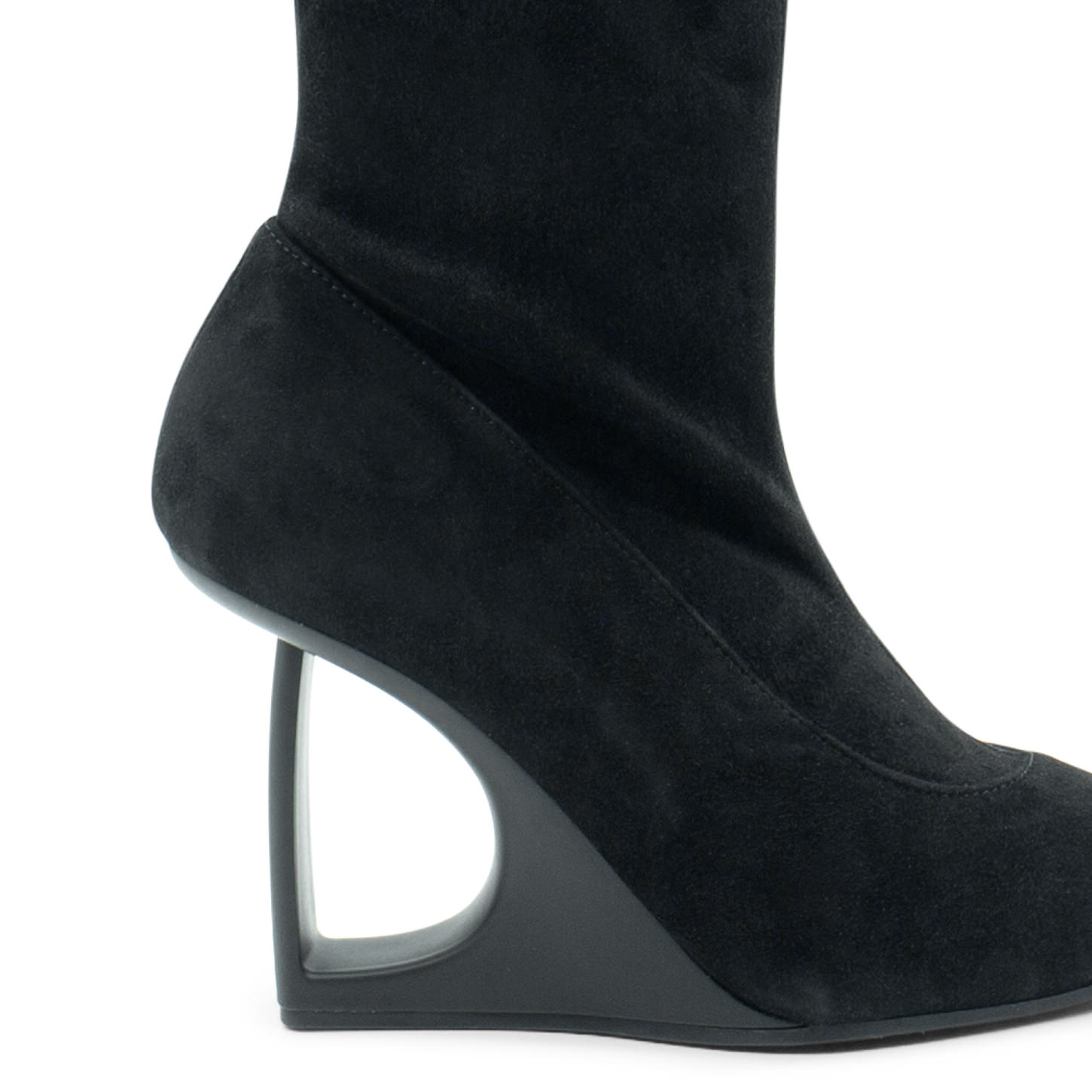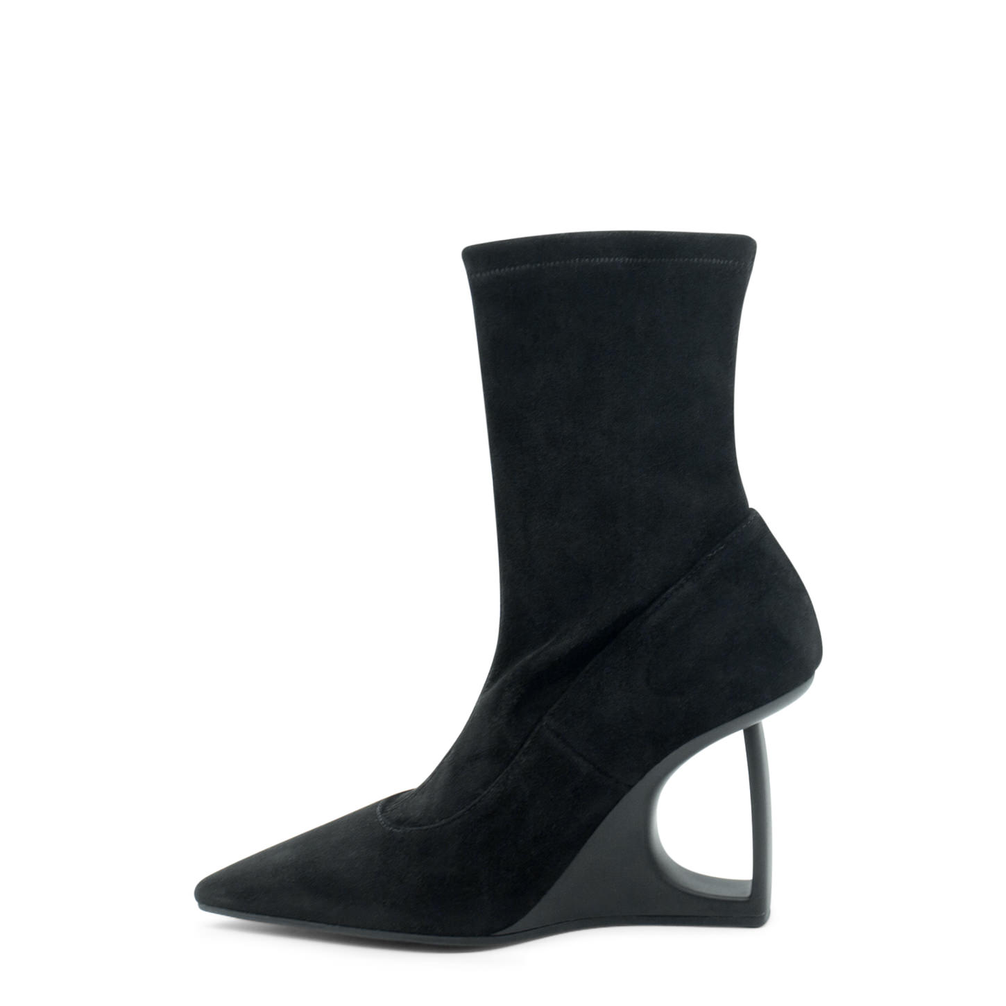 Die Stiefelette „D“ in Schwarz aus weichem Stretch-Wildleder ist schlank und eng anliegend. Der Keilabsatz ist aus lackiertem ABS gefertigt und zeichnet sich durch ein Design aus, das das „D“ als Symbol für „Donna“ (Frau) kreativ interpretiert. Die Gummisohle ist rutschfest. Made in Italy.