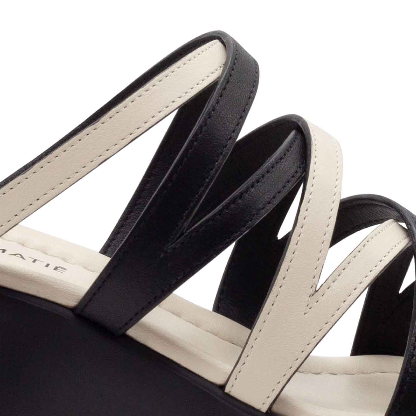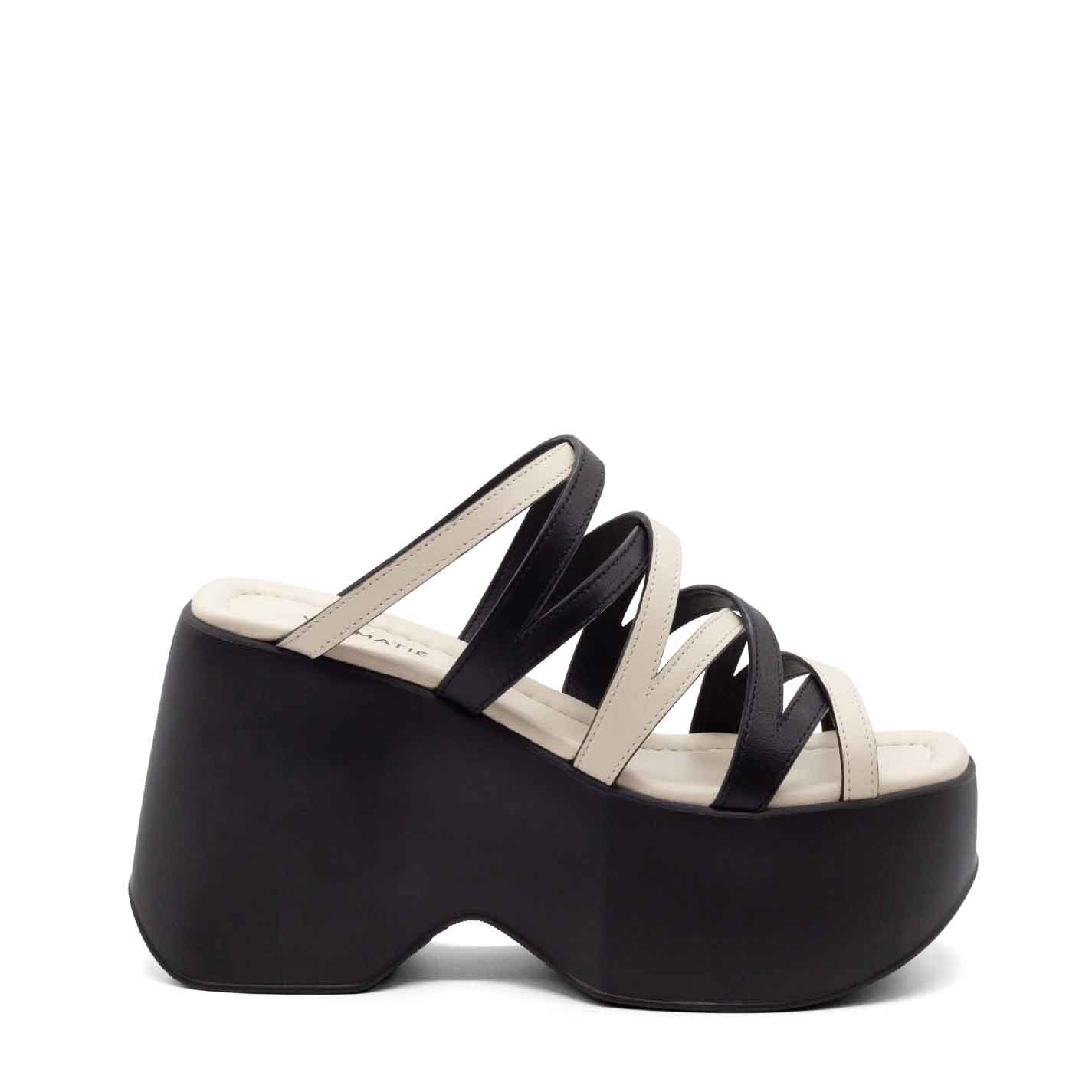 Yoko Crossover-Slipper aus weichem schwarzem/elfenbeinfarbenem Nappaleder mit überkreuzten Kalbslederriemen, die ein Spiel mit Öffnungen erzeugen. Keilabsatz aus superleichtem und bequemem Schaumstoff. Gepolsterte Innensohle aus Leder mit Nähten. Lauffläche mit rutschfester Textur. Hergestellt in Italien.