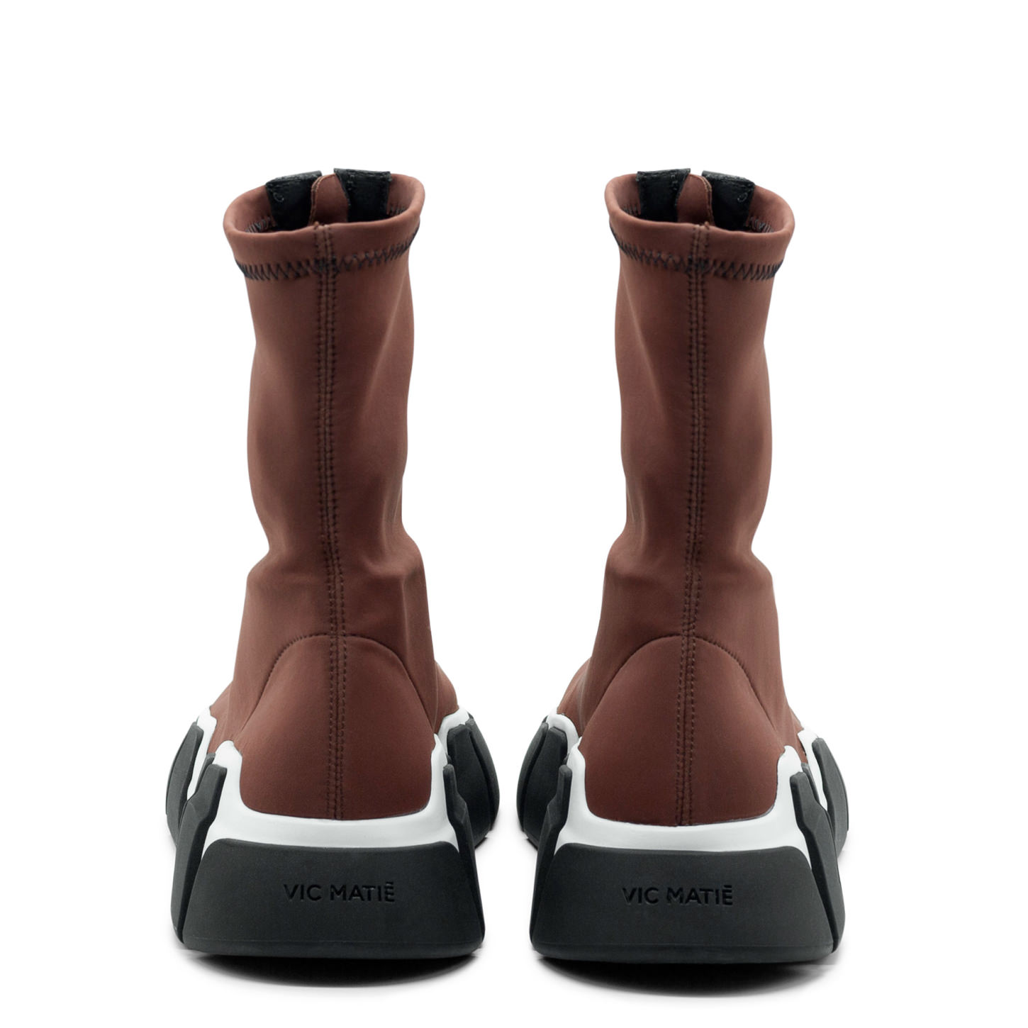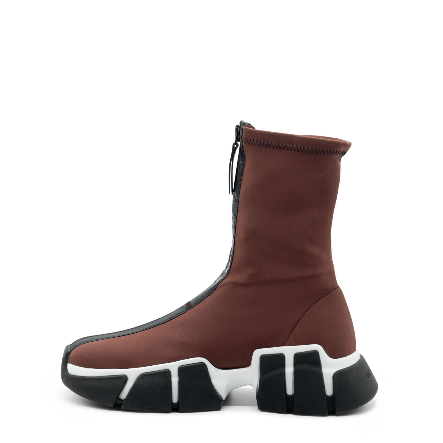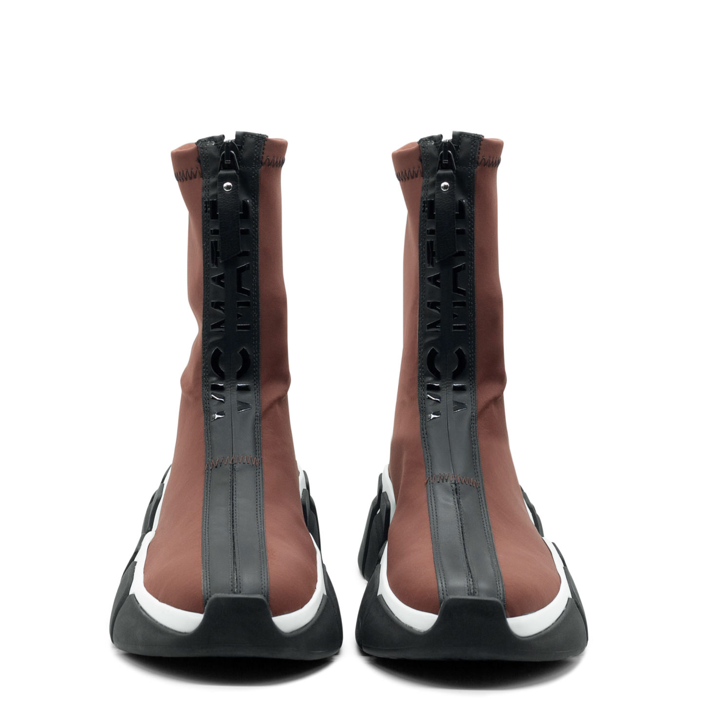 Die goldbraune Zipper-Stiefelette Mano mit logoverziertem Gummi-Reißverschluss auf der Vorderseite ist aus doppeltem Stretch-Lycra gefertigt. Die Monoblock-Gummisohle mit Stollen ist inspiriert von einer „Hand“, die einen Schuh hält. Das weiche Fußbett ist mit Leder bezogen. Made in Italy.