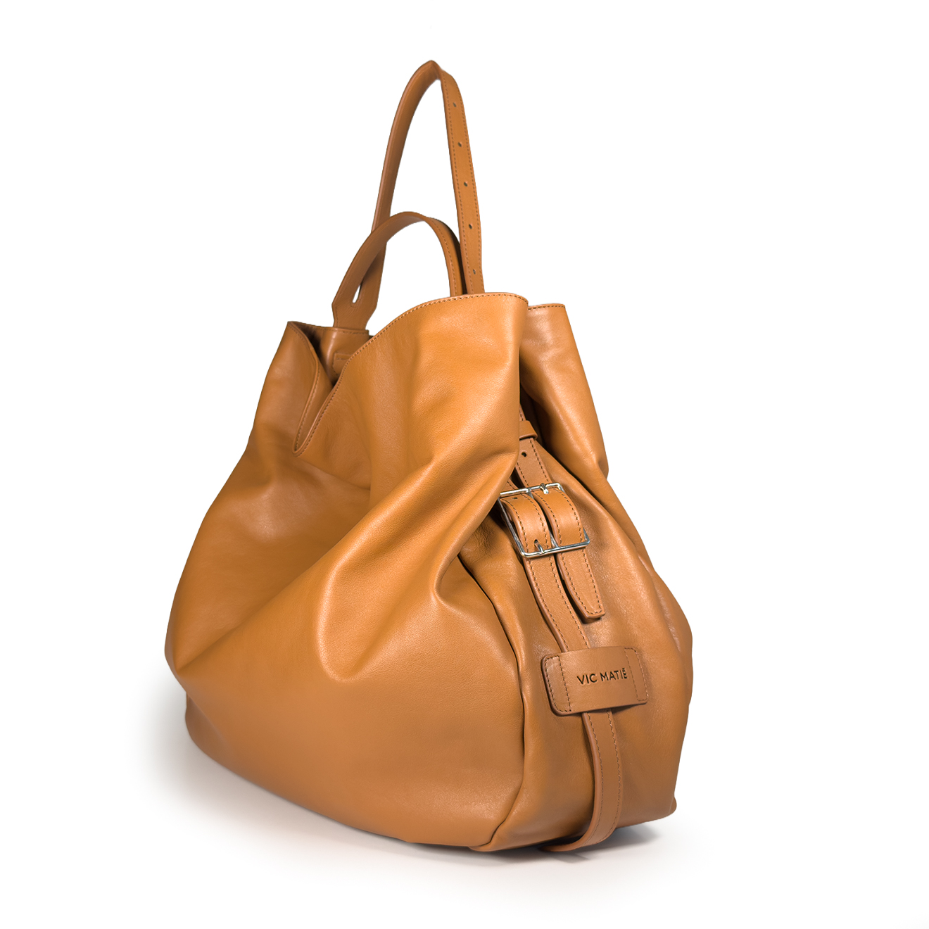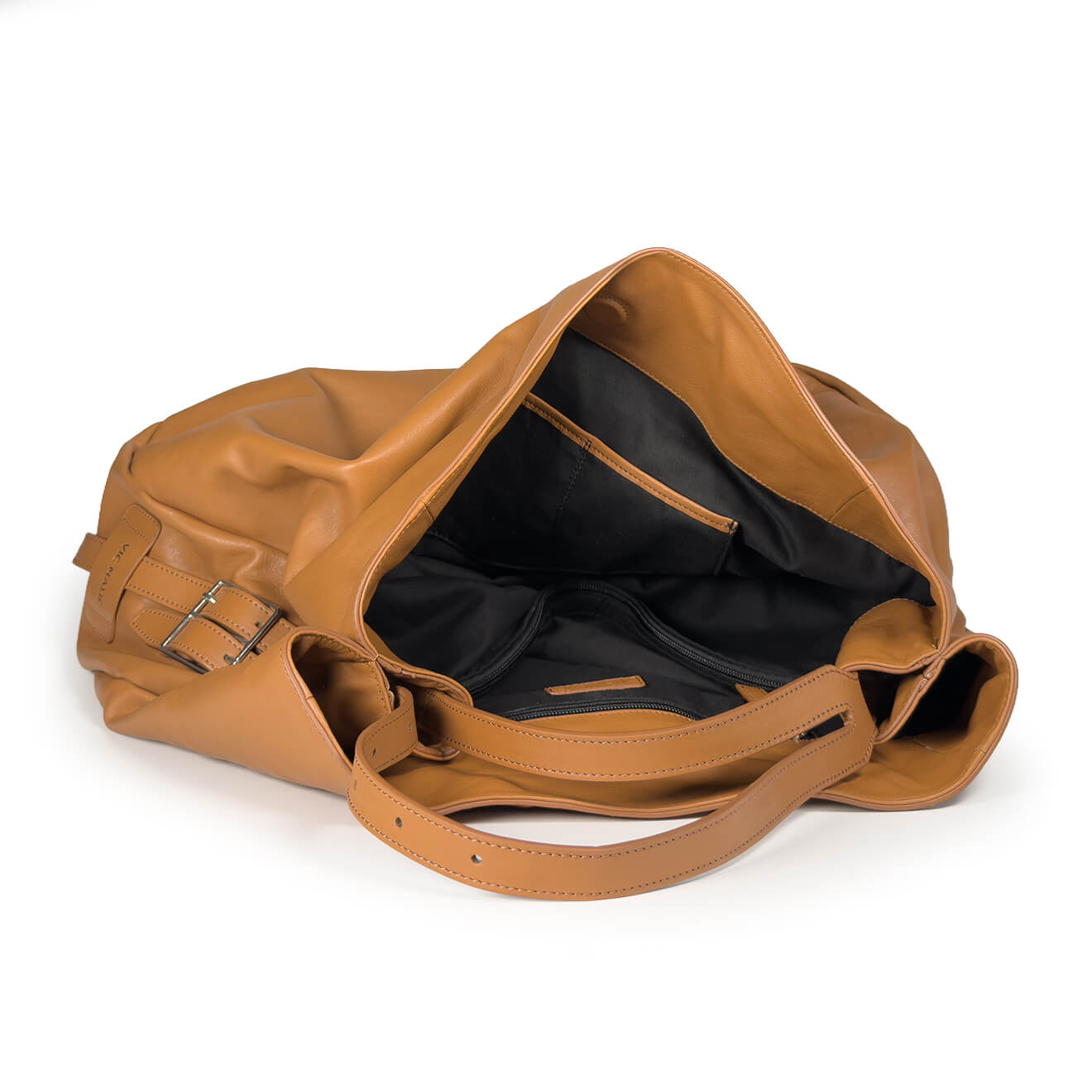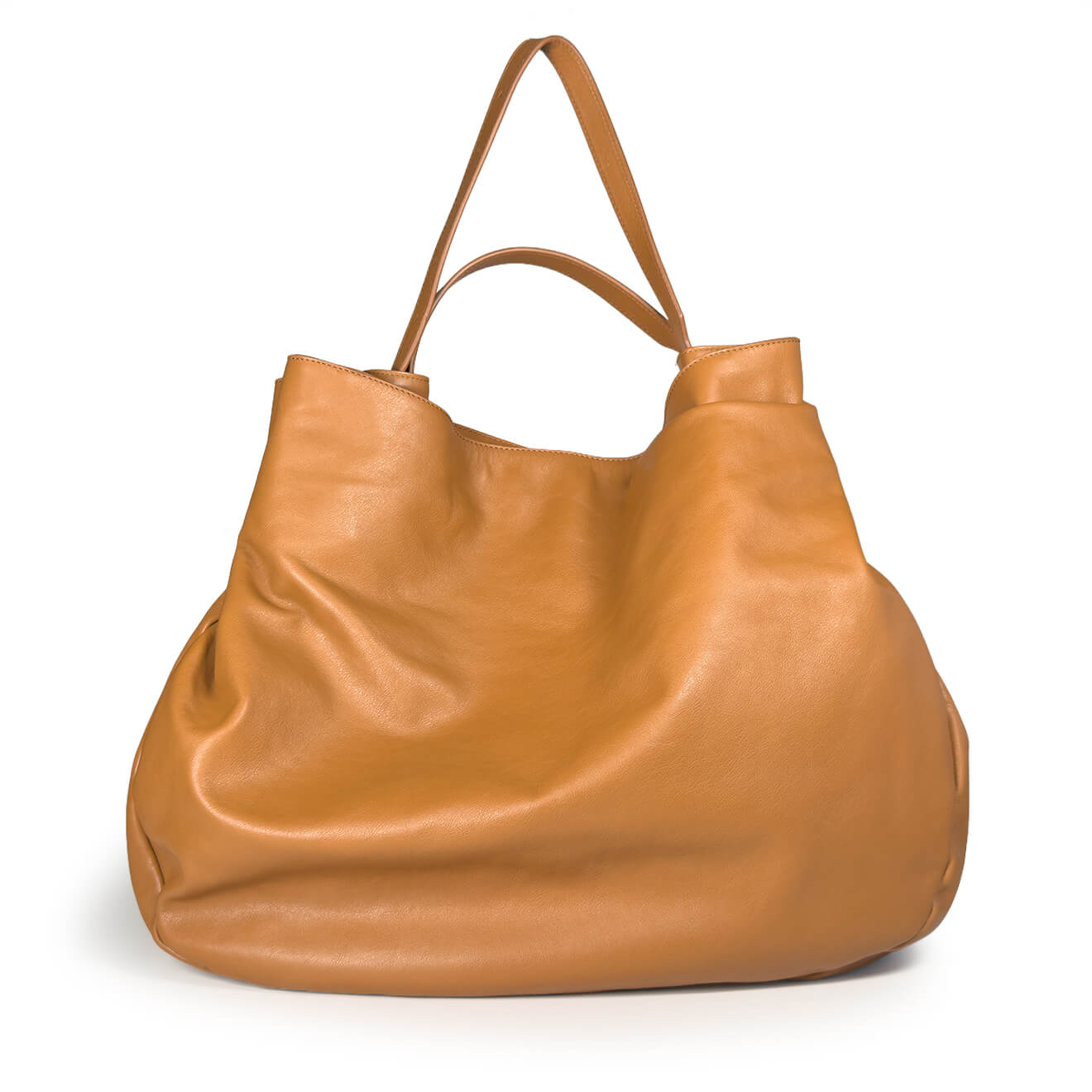 Leather-colored pouch bag, made of soft leather with a large volume and deconstructed line, designed for a spacious and versatile everyday use; the lightweight construction maintains comfort and practicality even when fully loaded. The essential design highlights the natural softness of the material, making it a modern and functional accessory, ideal for work, travel or city lifestyle.
