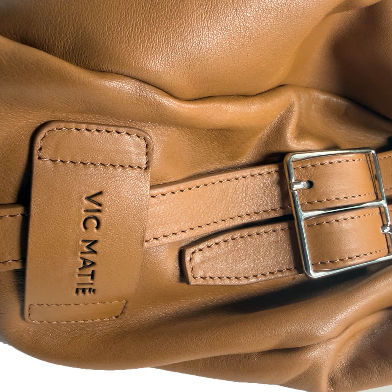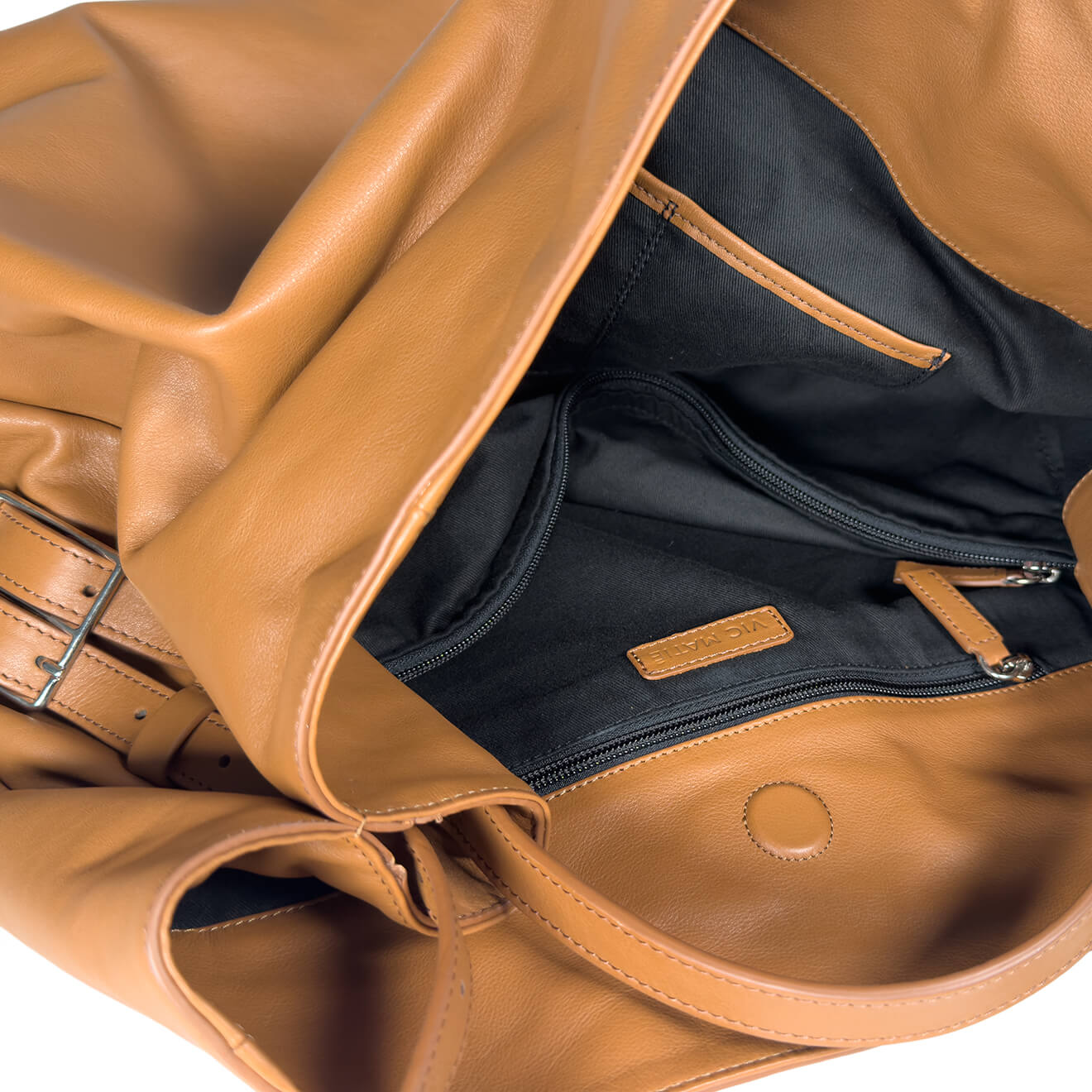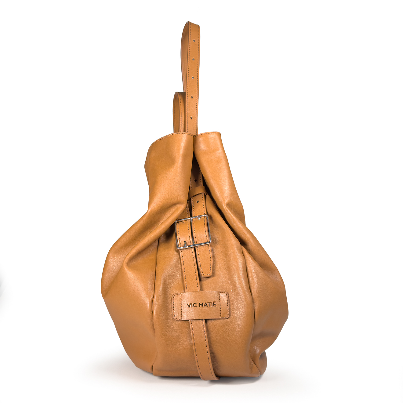 Leather-colored pouch bag, made of soft leather with a large volume and deconstructed line, designed for a spacious and versatile everyday use; the lightweight construction maintains comfort and practicality even when fully loaded. The essential design highlights the natural softness of the material, making it a modern and functional accessory, ideal for work, travel or city lifestyle.