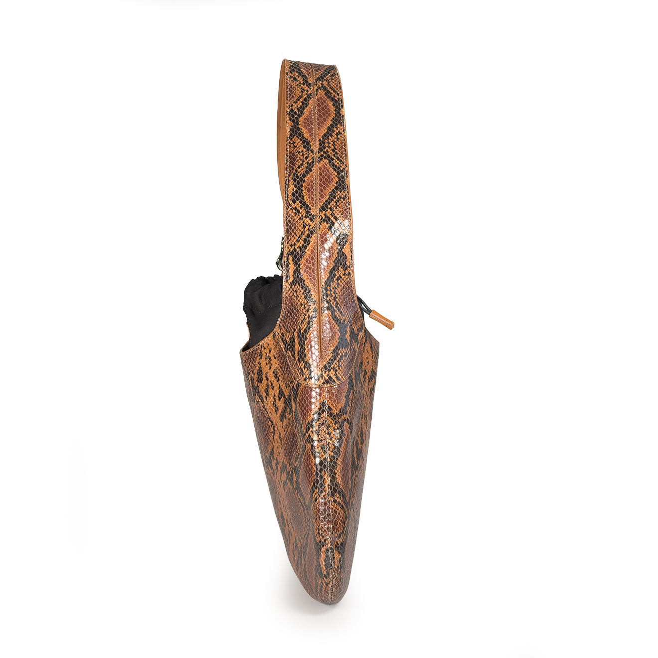 Brown bucket bag, made of leather with a python-effect print with an essential design and pouch-like shape, enhanced by an inner drawstring closure that ensures practicality and protection. The single handle allows it to be carried comfortably on the shoulder, while the lightweight and spacious structure makes it ideal for everyday use. A model with a natural and contemporary aesthetic, perfect for those seeking a refined yet informal style.