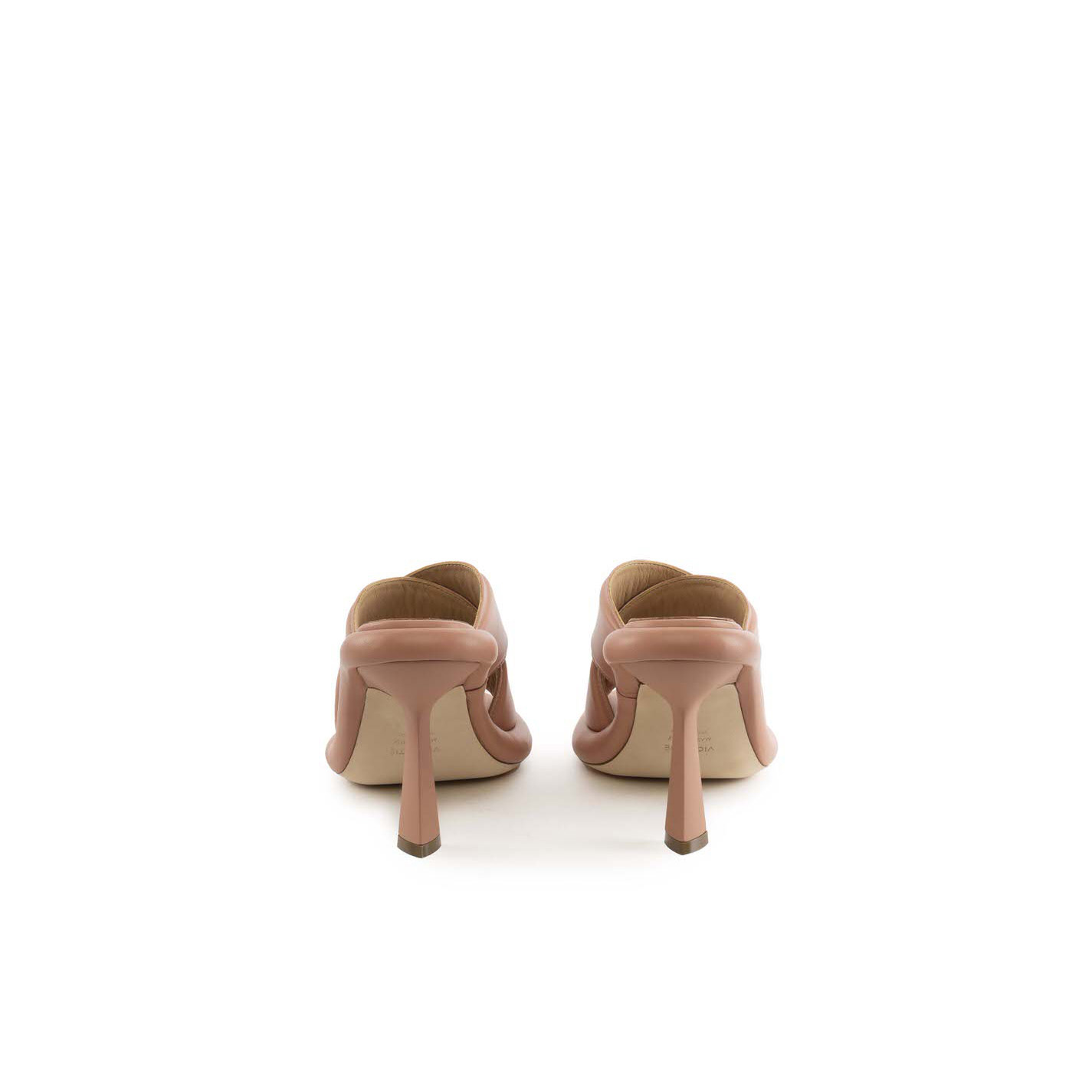 Antique pink Dosh crossover slip-ons made from raised, overlapping bands of soft nappa leather. Leather sole, leather-covered curved platform, and matt coated "slash" heel. Comfortable leather-covered insole. Made in Italy.
