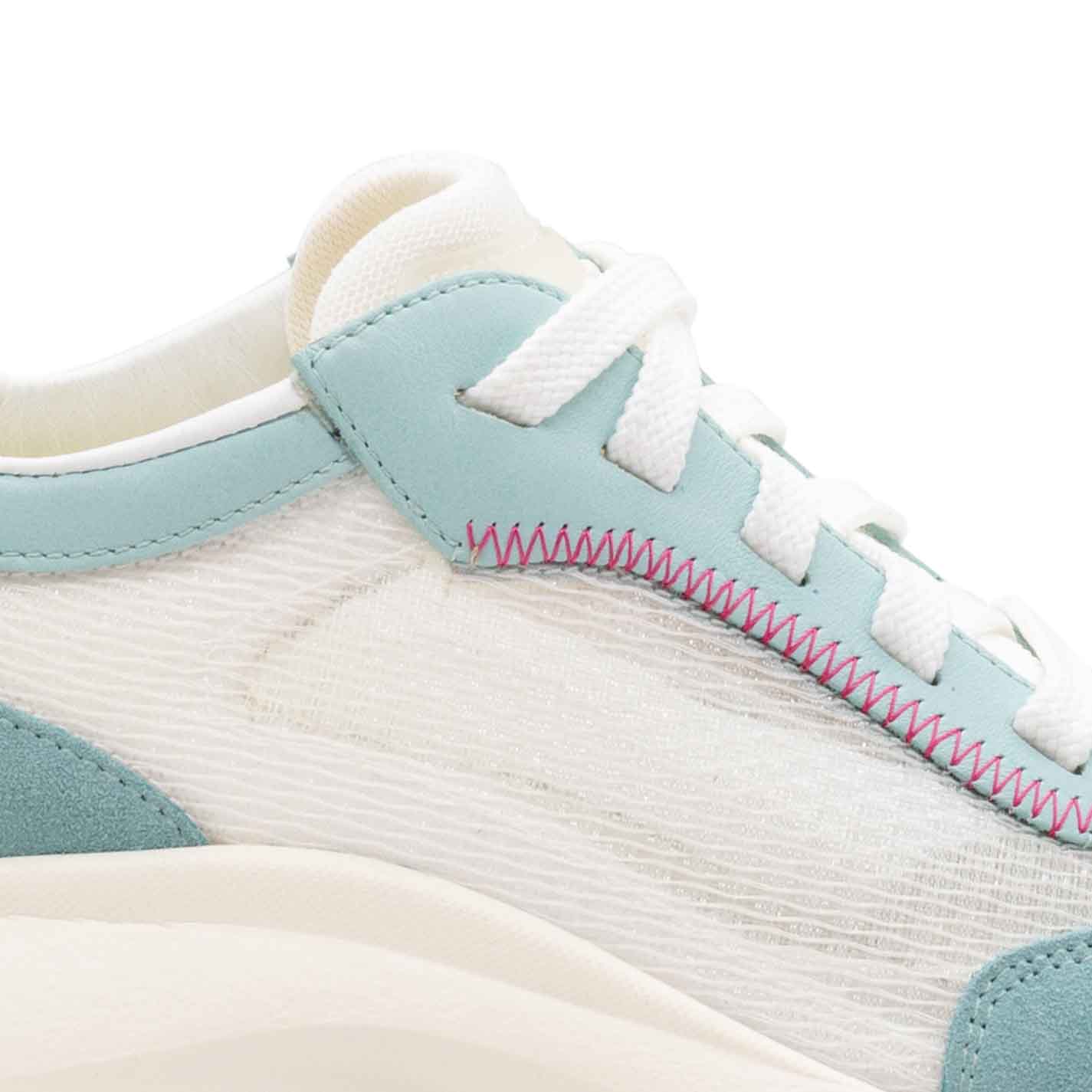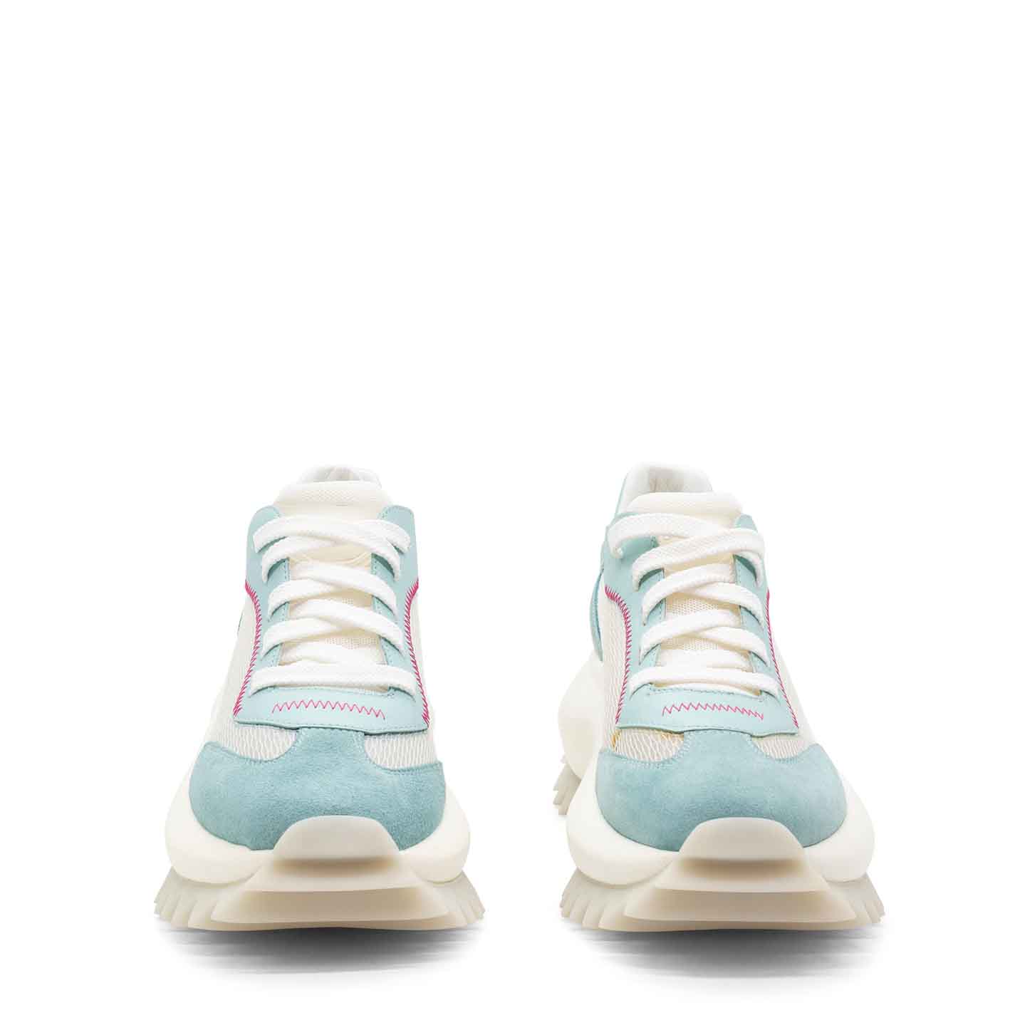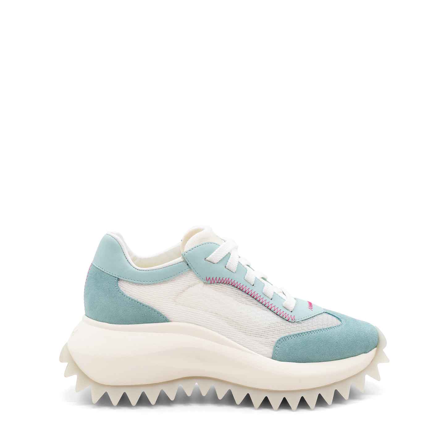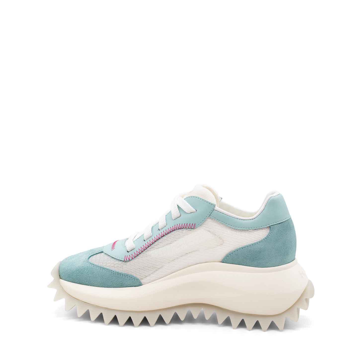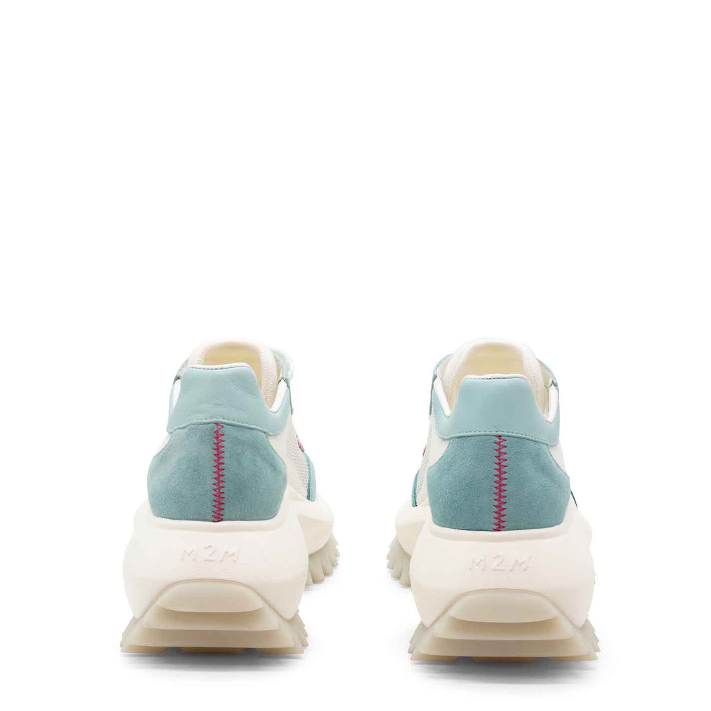 Aquamarine/white m2m lace-ups in split calfskin and transparent mesh, with contrasting stitching. Logo-branded xl extralight one-piece sole with rubber insert and tread with maxi spikes. Pure cotton-covered anatomic insole. Made in Italy.