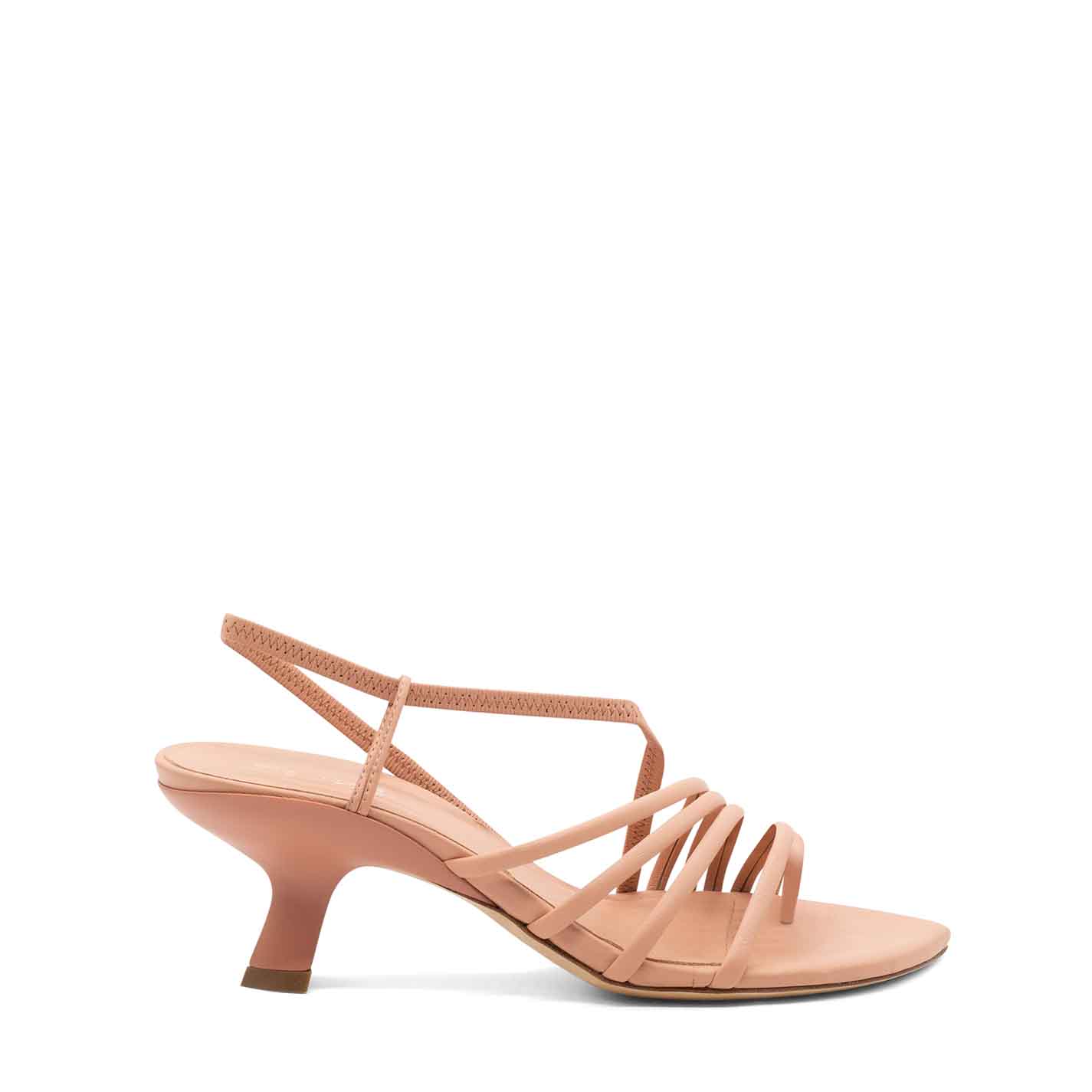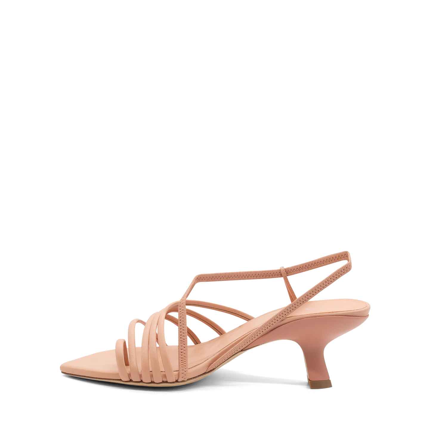 Asymmetric slash sandals in soft pink nappa, with radial-patterned strips and elastic strap around the back of the ankle. Leather sole with square toe, leather-covered insole, and matt coated heel. Made in Italy.