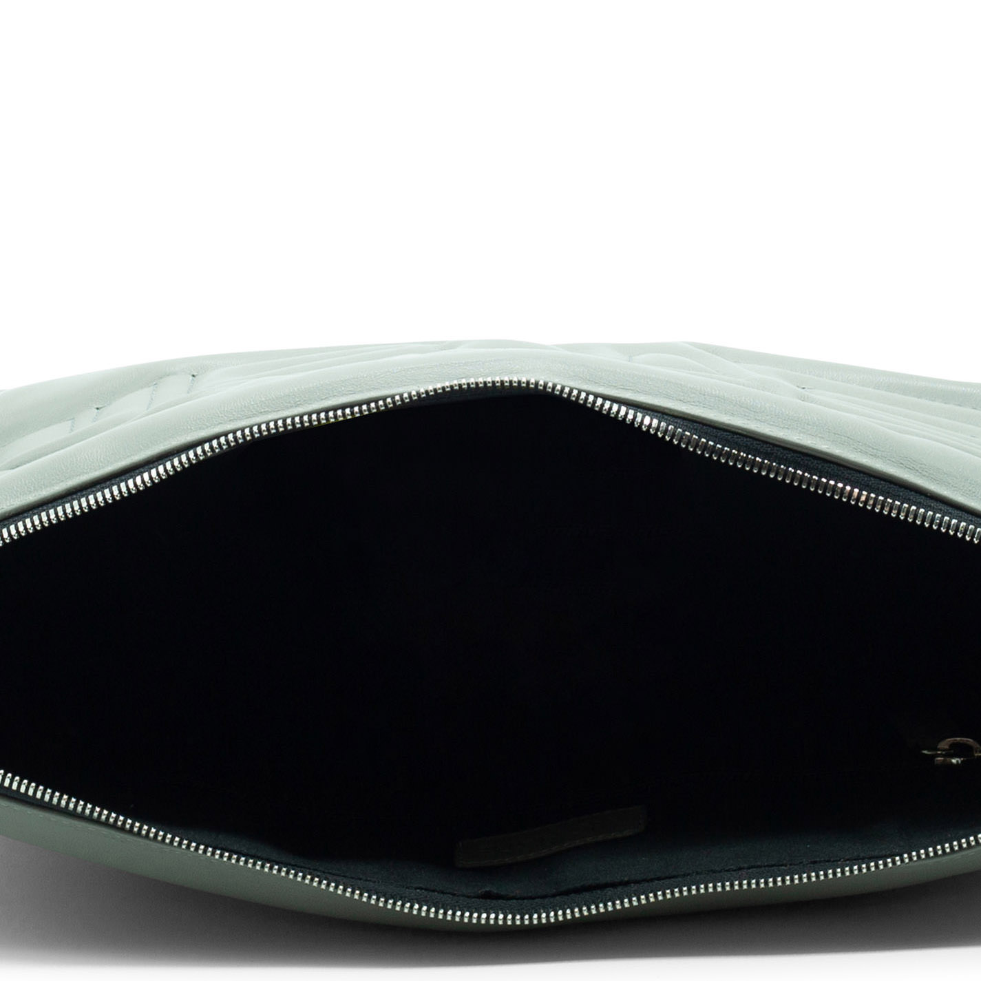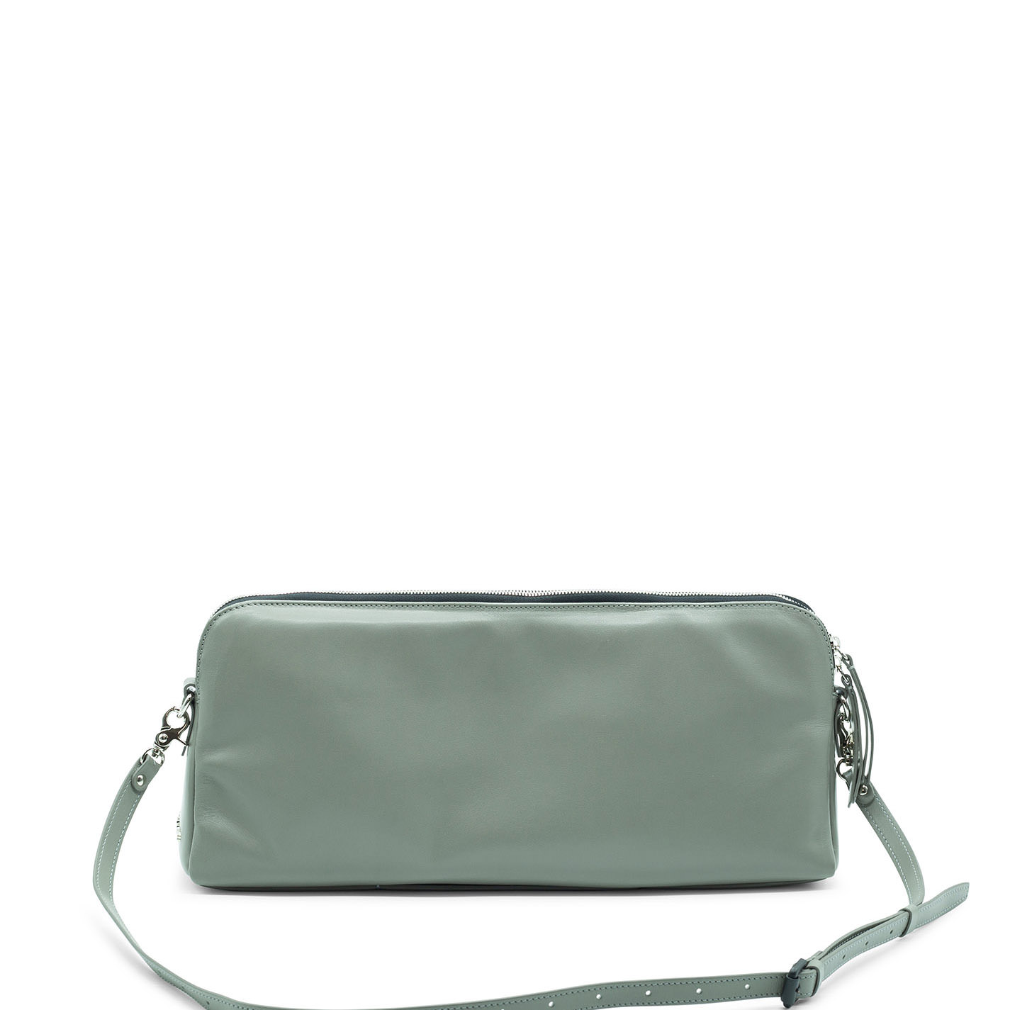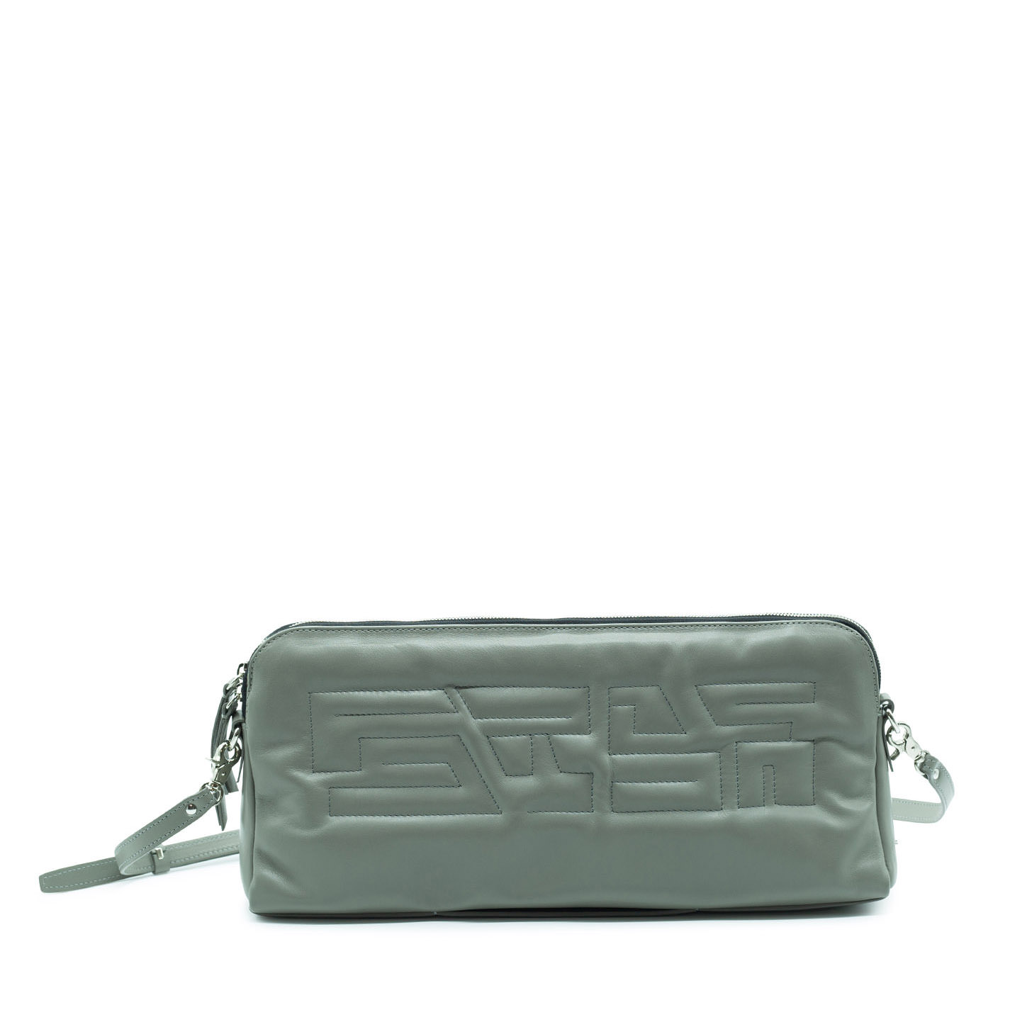 Grey baguette bag, crafted from structured smooth calfskin, with front embroidery, metal zip fastening, and adjustable and removable shoulder strap.