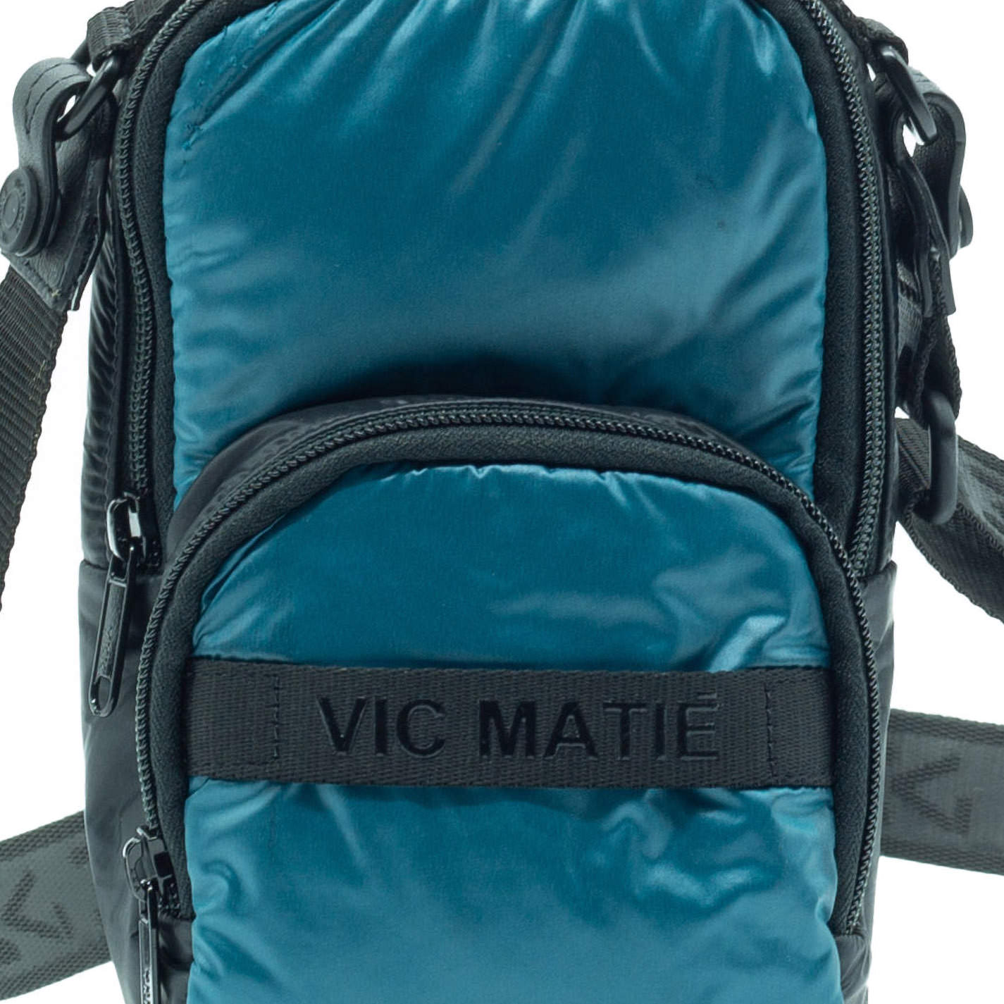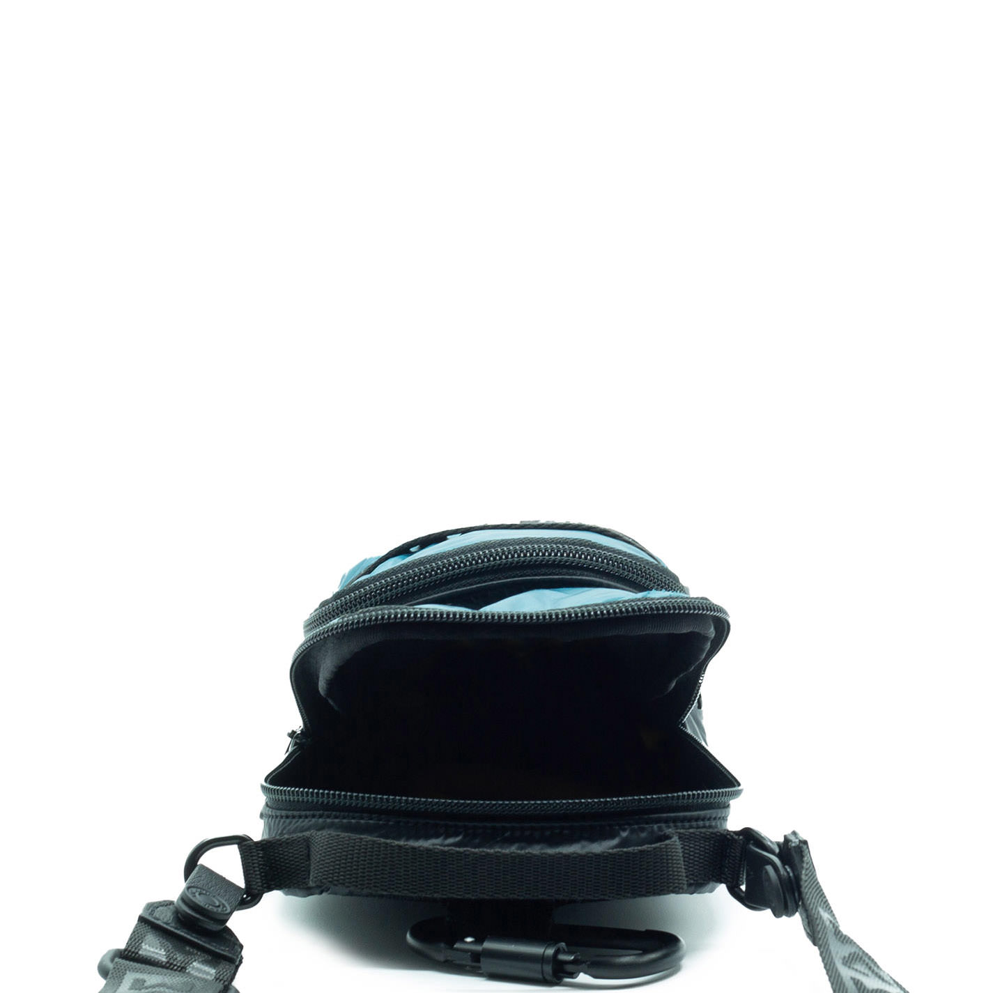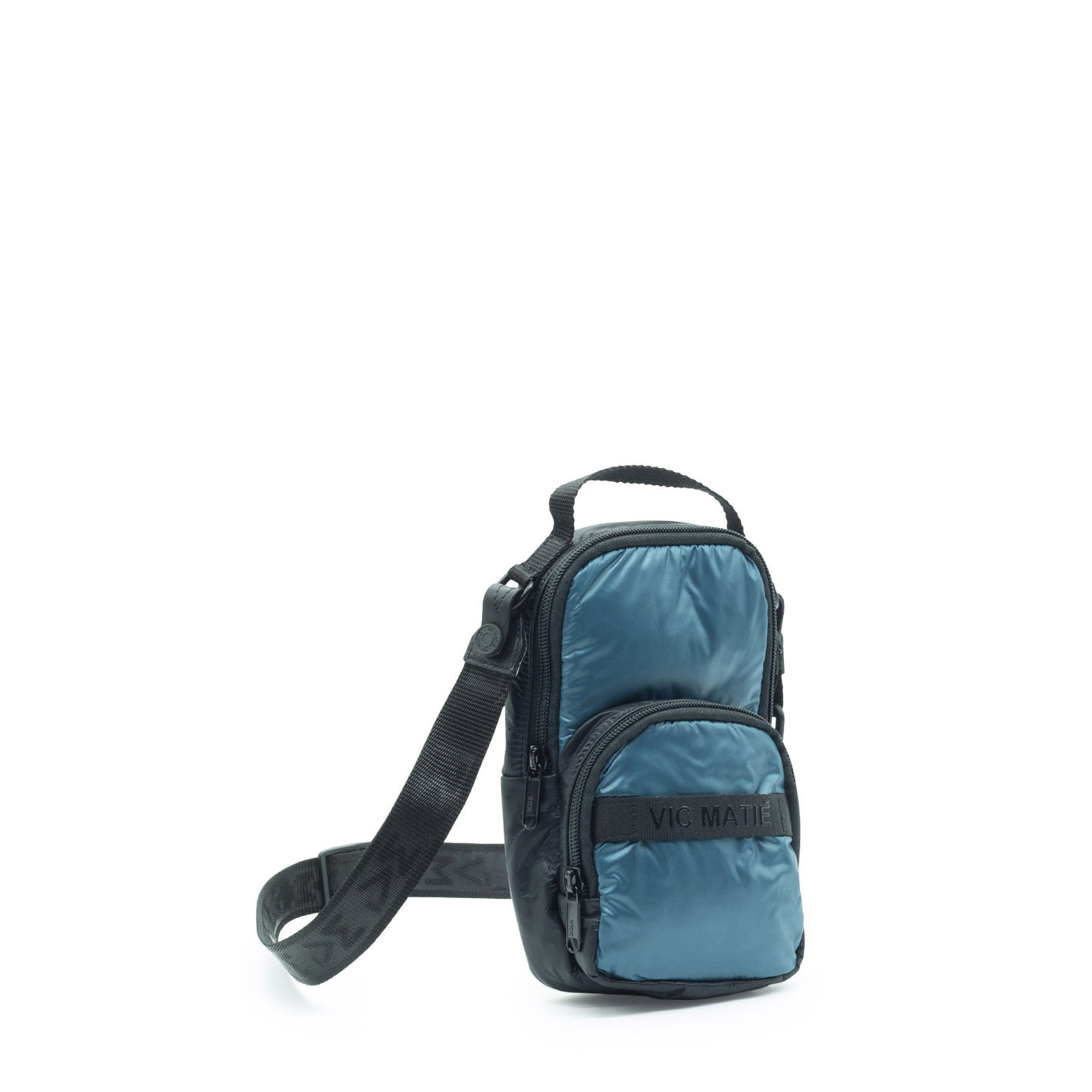 Petrol blue/black padded nylon man bag, with zip fastening, even in the pocket, removable shoulder strap and back loop, to wear it as a waist bag.