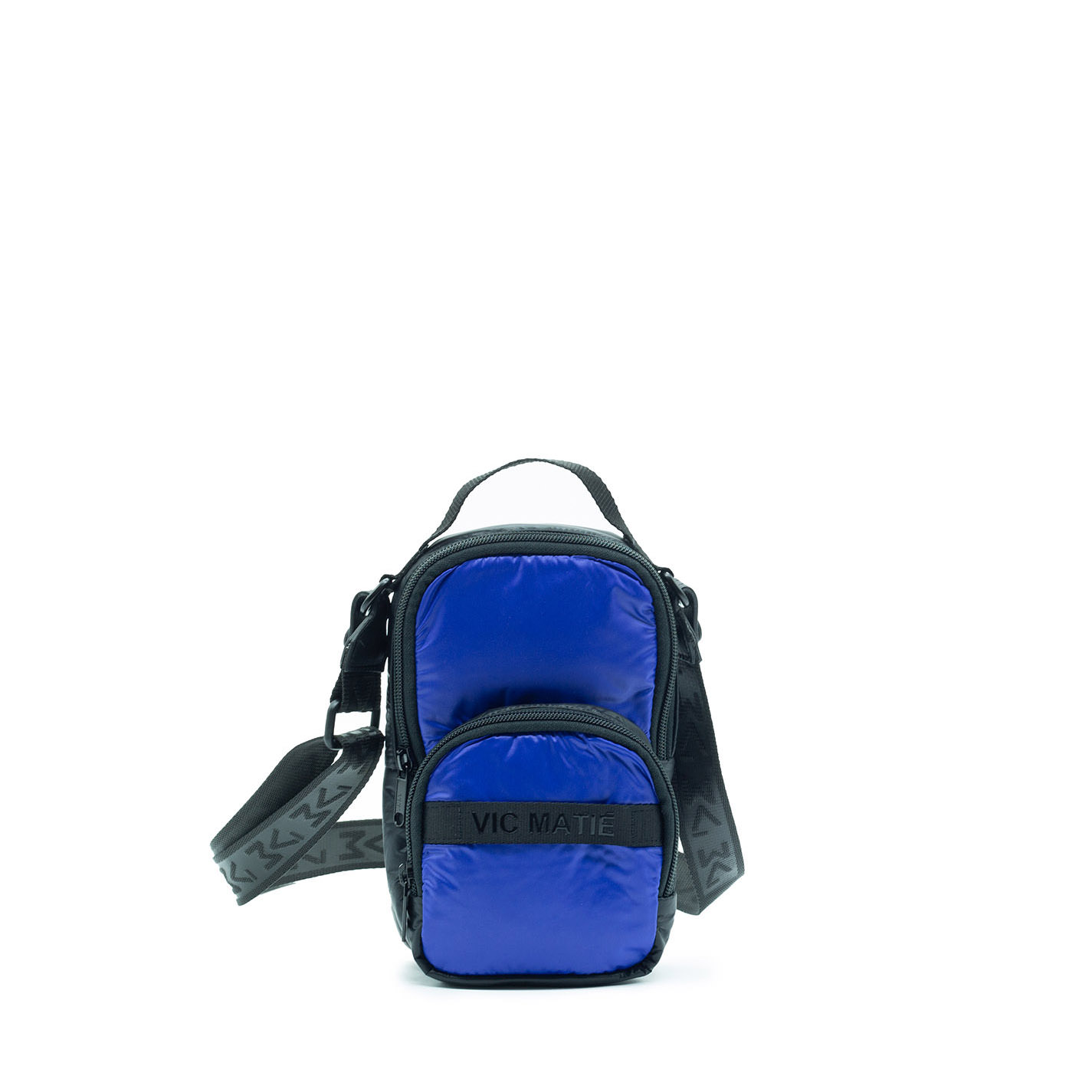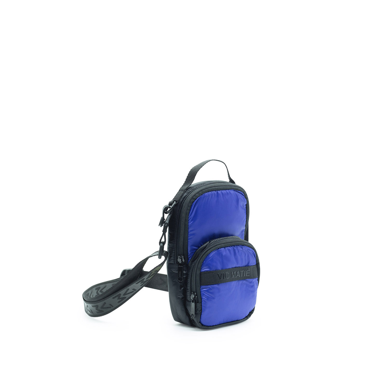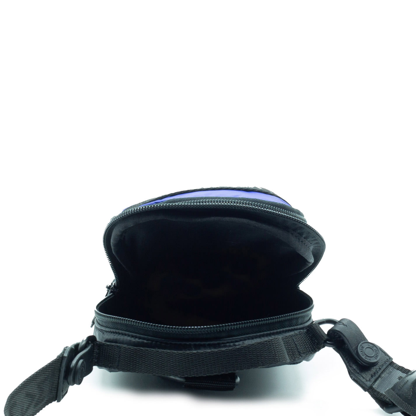 Purple/black padded nylon man bag, with zip fastening, even in the pocket, removable shoulder strap and back loop, to wear it as a waist bag.