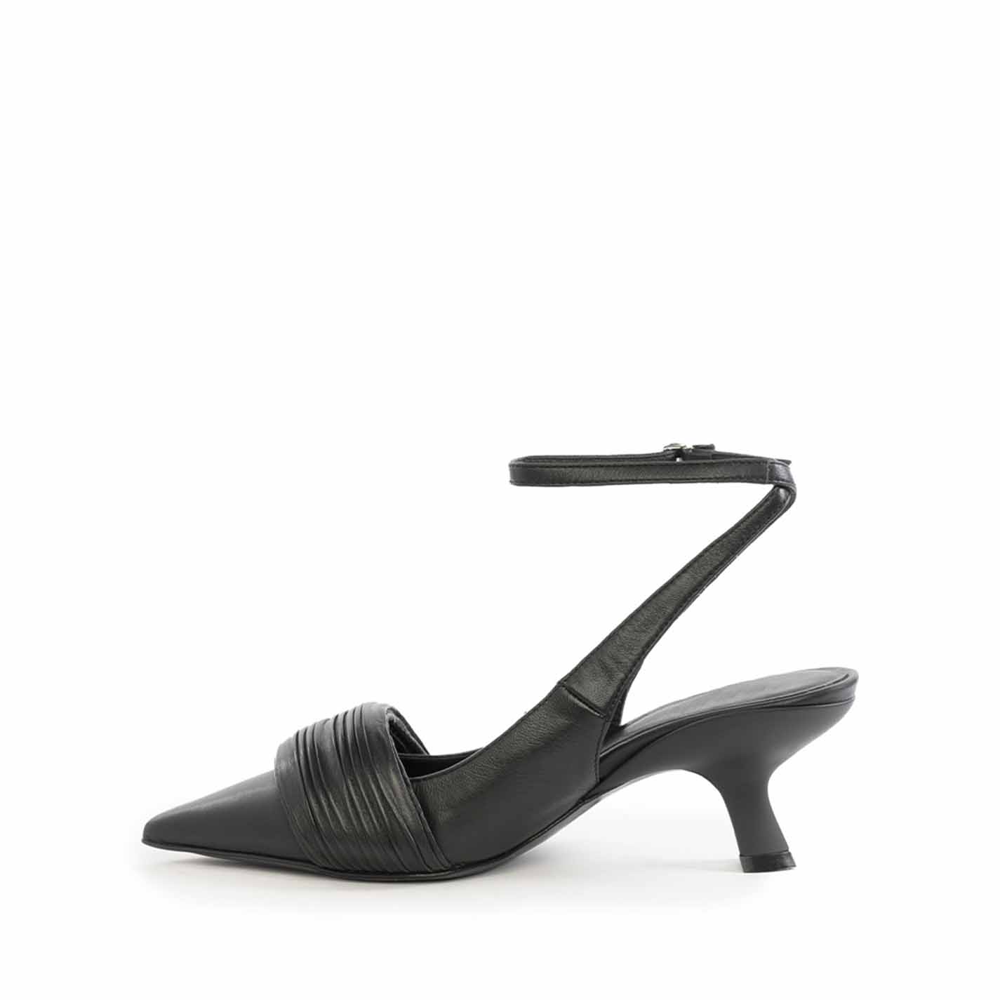 Black chanel slash pumps in nappa leather, with curved band and adjustable strap that wraps around the ankle. Very feminine pointed-toe shape and "slash" heel with matt finish. Leather sole. Made in Italy.