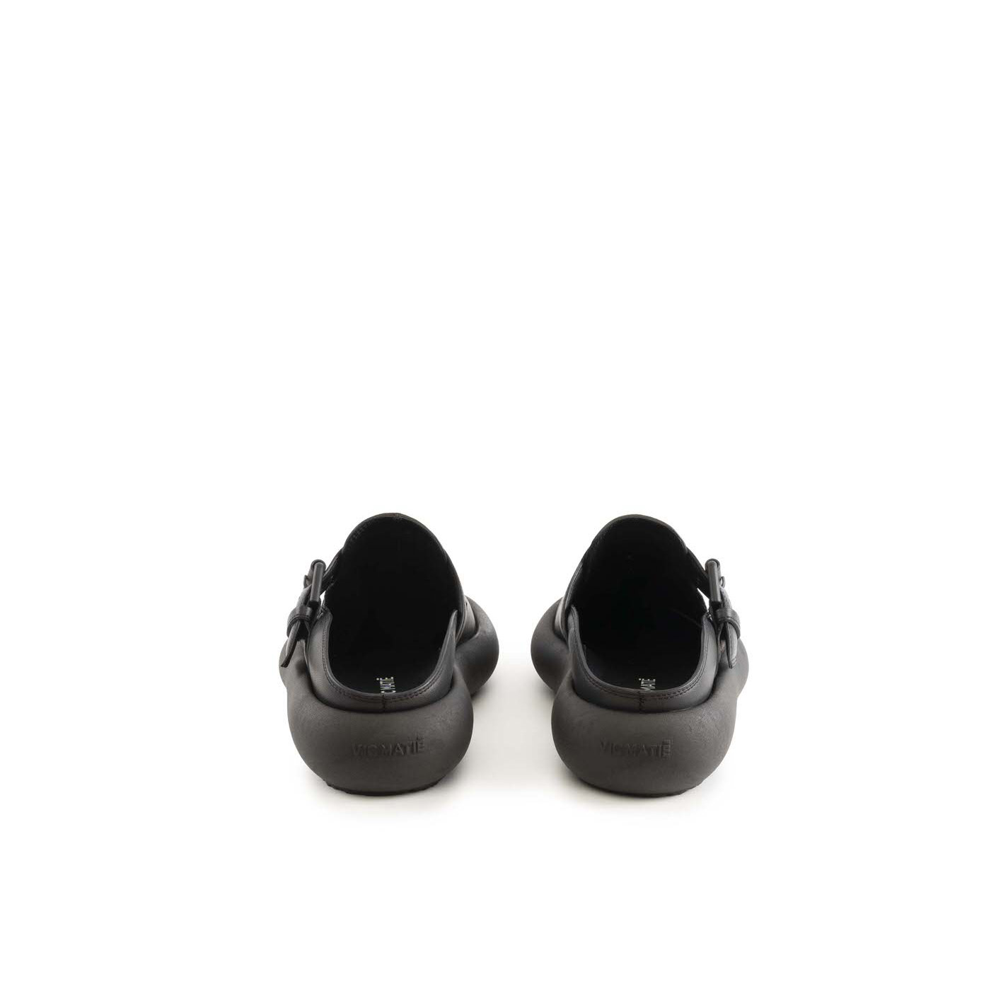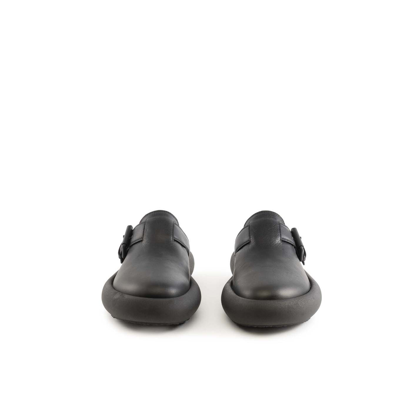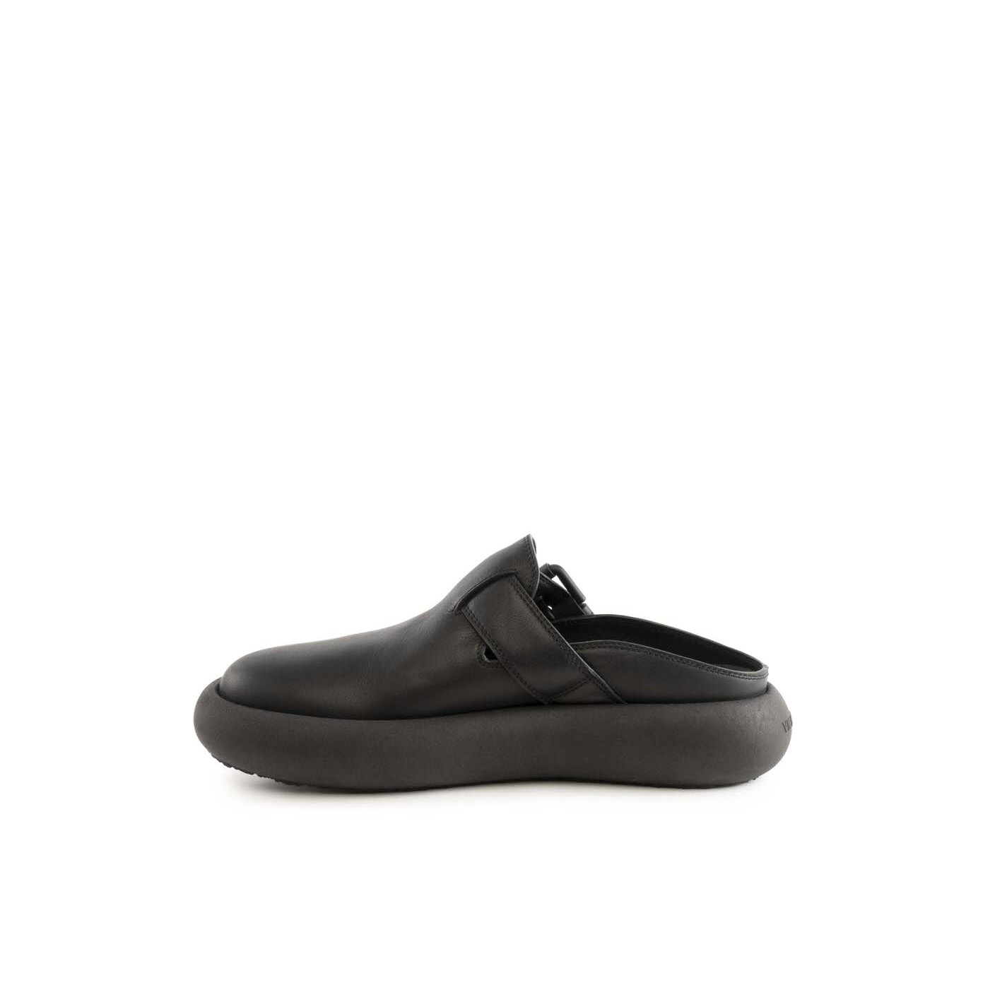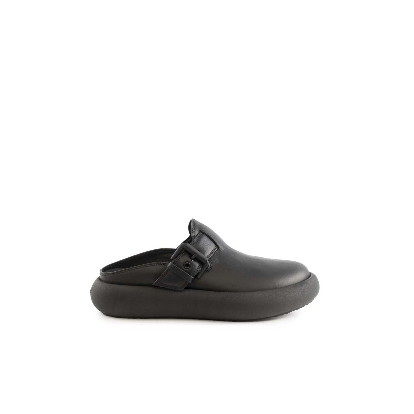 Black leather Donut mules in soft nappa calfskin, with front strap and side buckle. Light, curved rubber sole and leather-covered insole. Made in Italy.