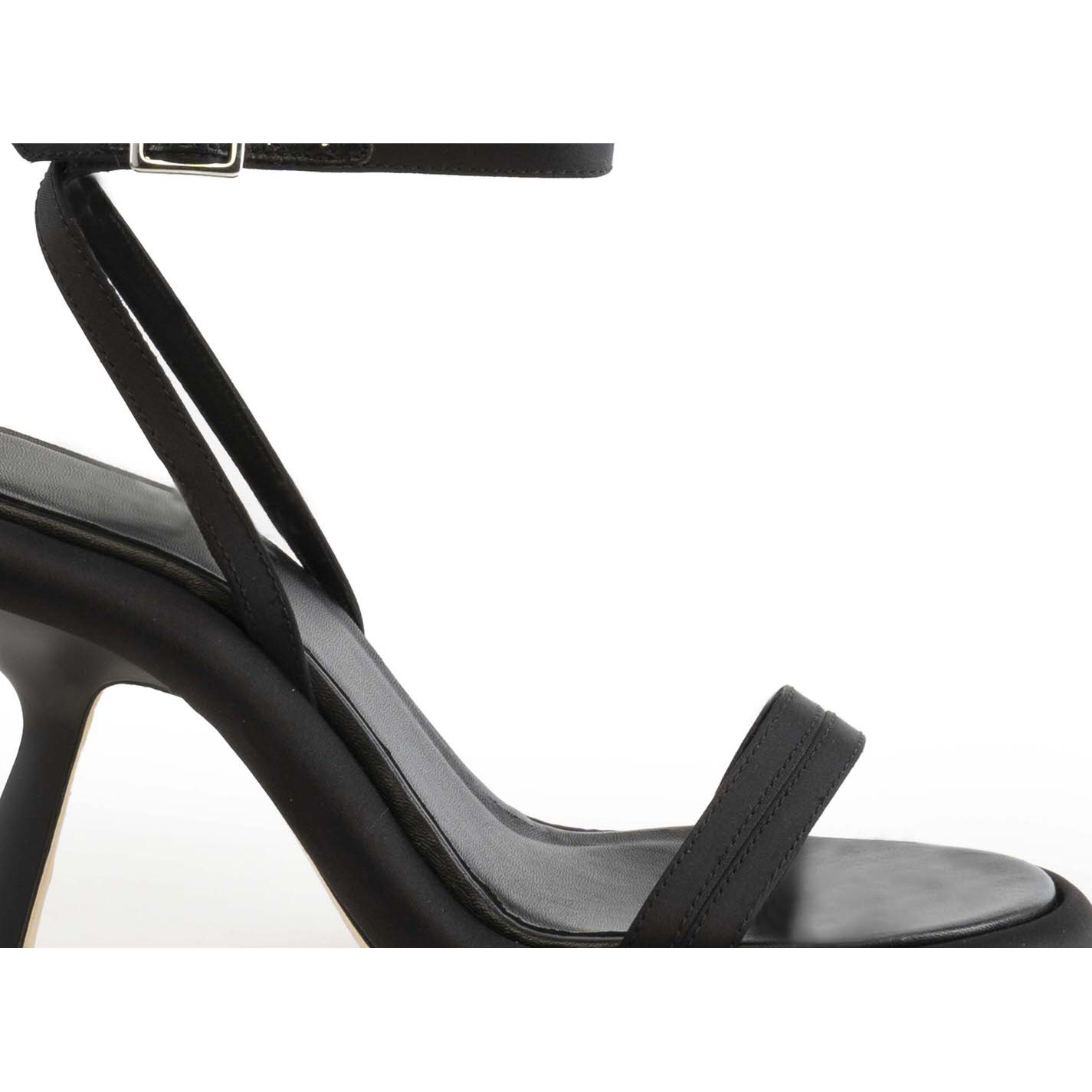 Black satin Dosh sandals with strips at the front, strips that criss-cross at the ankle and adjustable strap. Leather sole, leather-covered curved platform, and matt coated "slash" heel. Comfortable leather-covered insole. Made in Italy.
