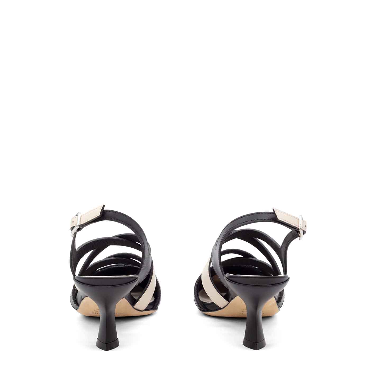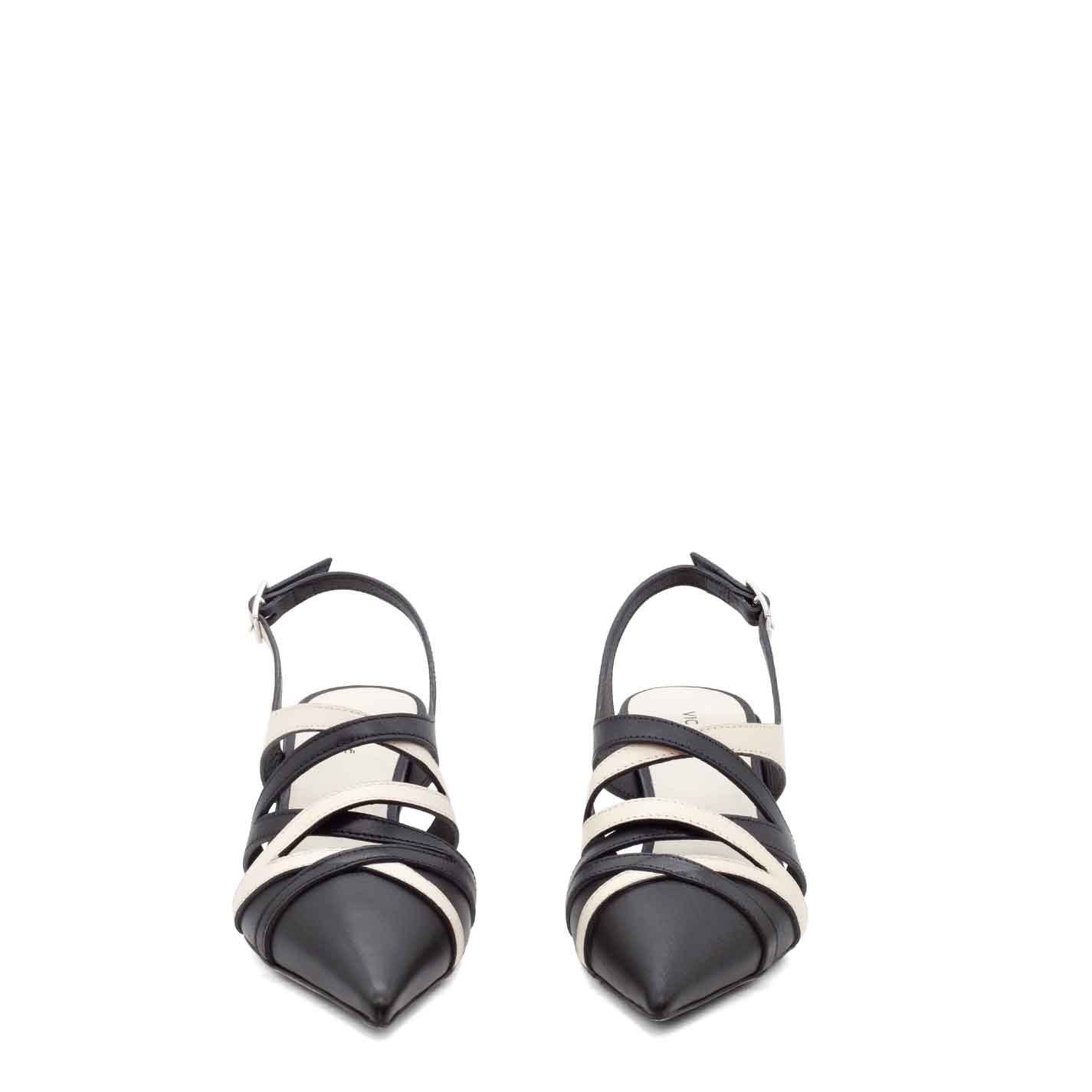 Black/white leather chanel slash pumps, with strips of calfskin that criss-cross at the front, creating openings. Very feminine pointed-toe shape and "slash" heel with matt finish. Leather sole. Made in Italy.
