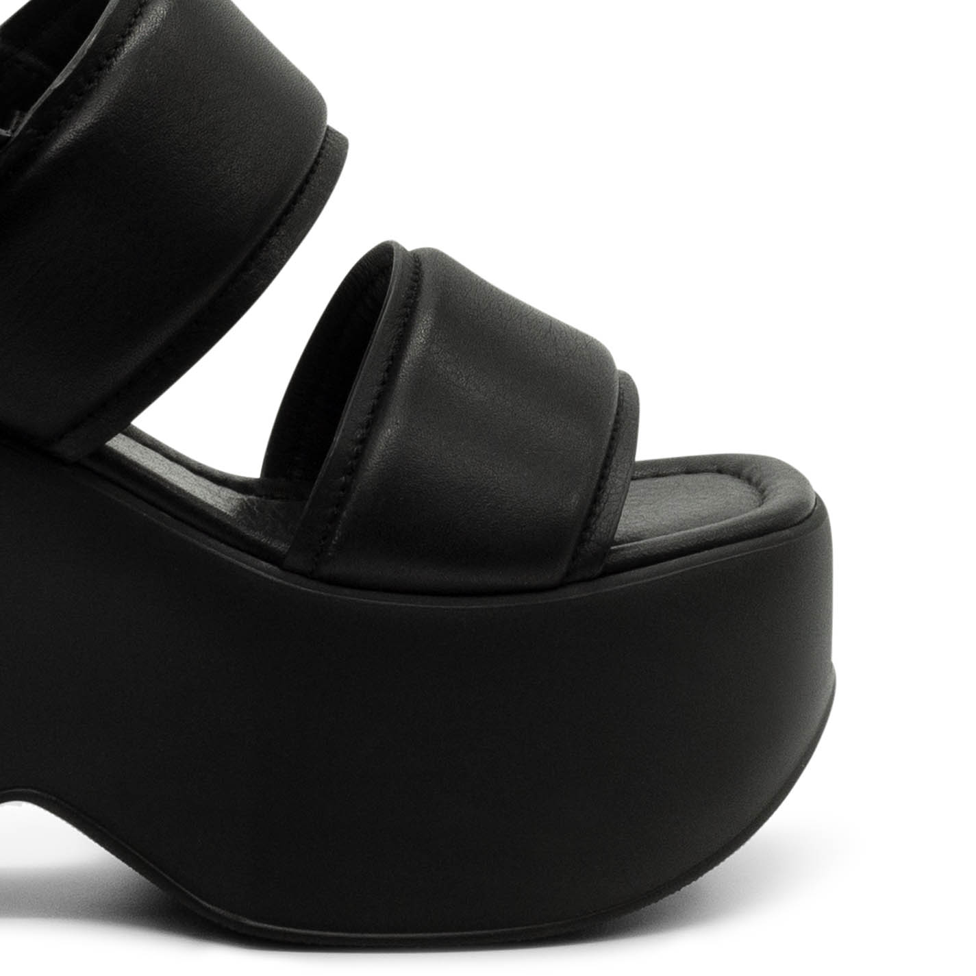 Black Yoko sandals in soft nappa calfskin, with bands, raised motif, adjustable velcro strap at the back, and metal logo. Super-light and comfortable foam wedge. Padded and stitched leather insole. Non-slip outsole. Made in Italy.