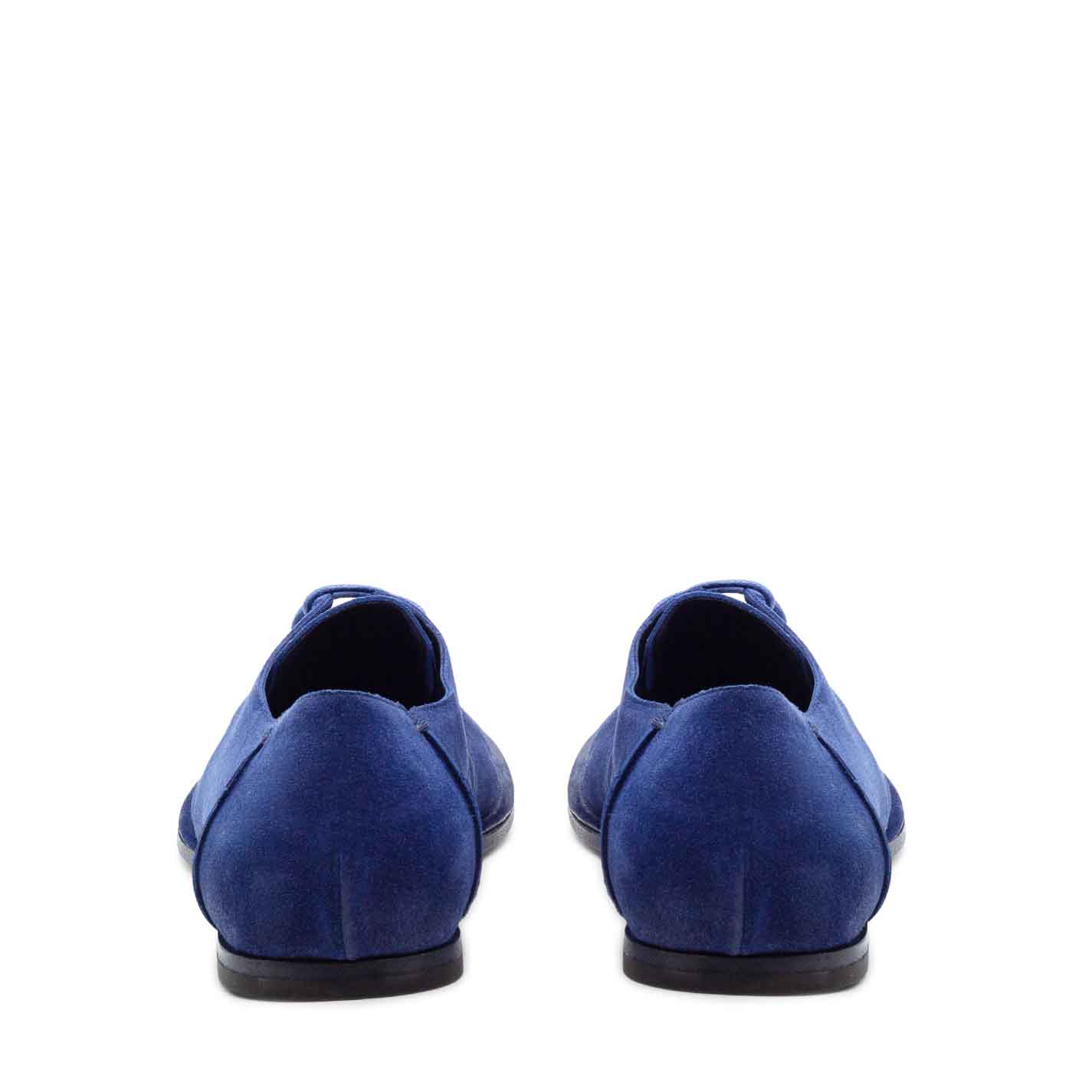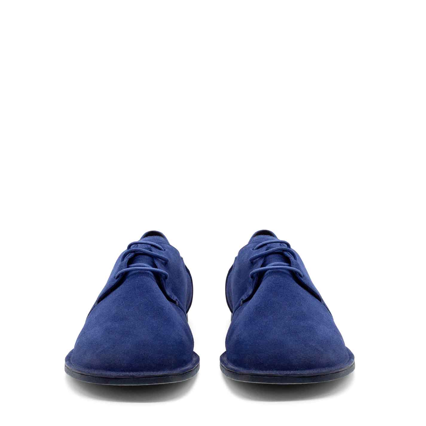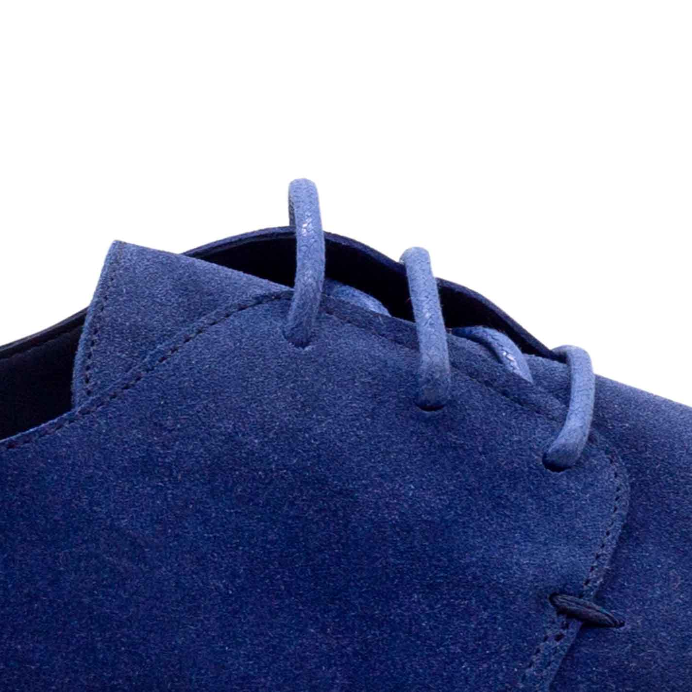 Blue Crispy Derbies in split calfskin with outer pinches secured by hand-worked thread. Tone-on-tone waxed laces. San Crispino-constructed leather sole. Leather-covered insole. Made in Italy