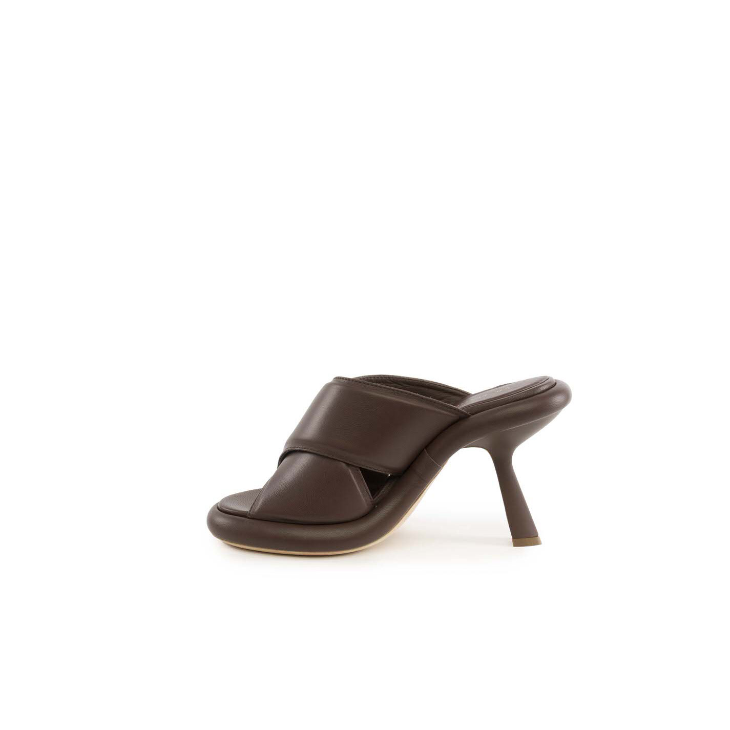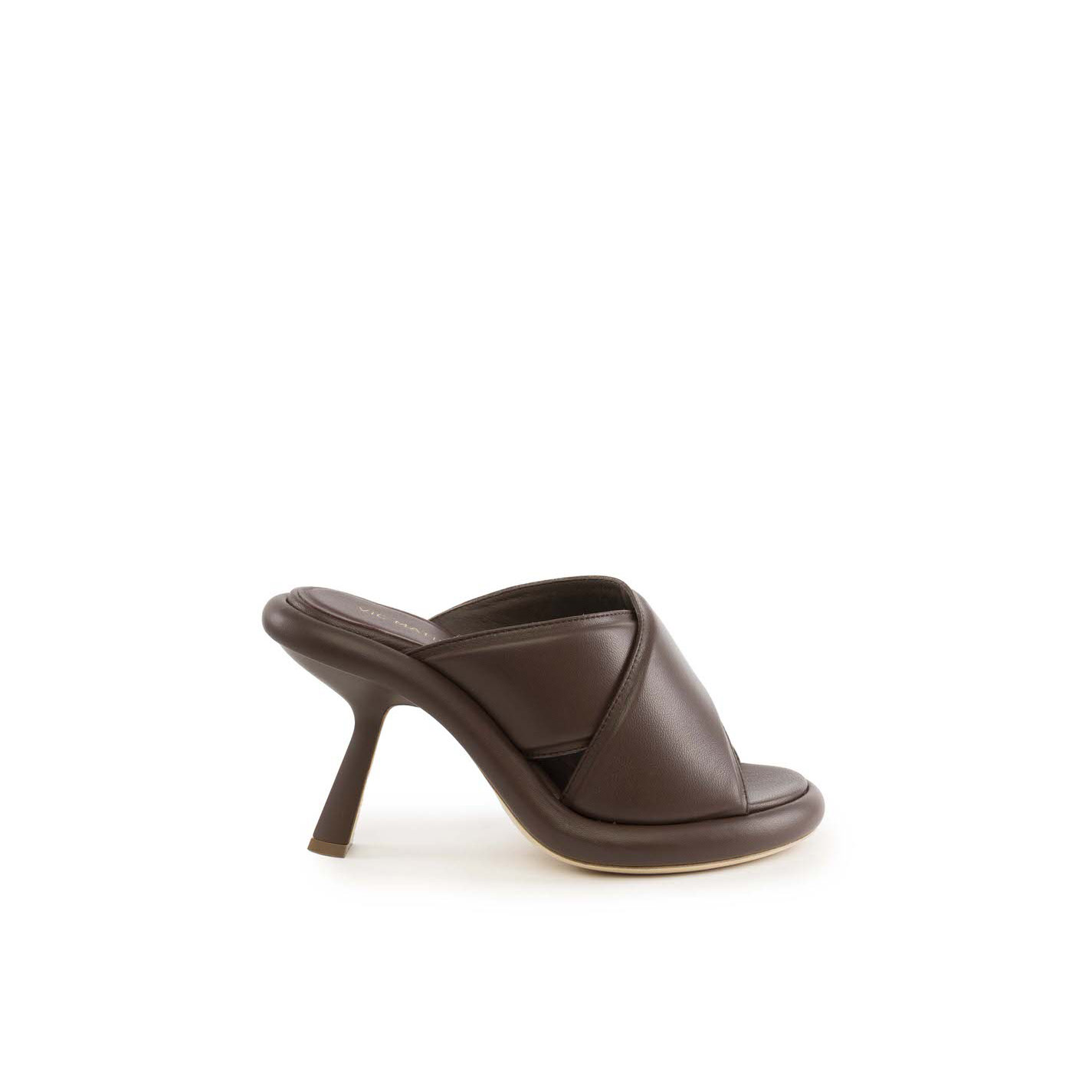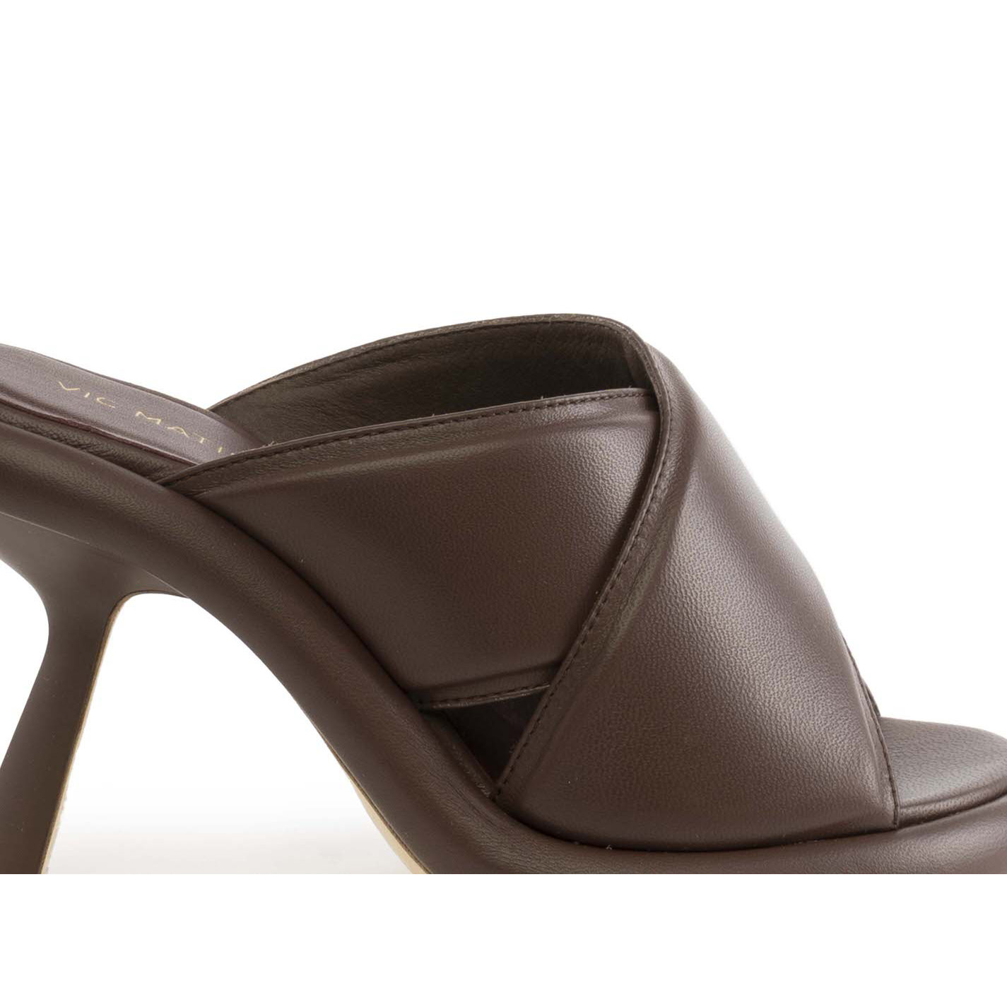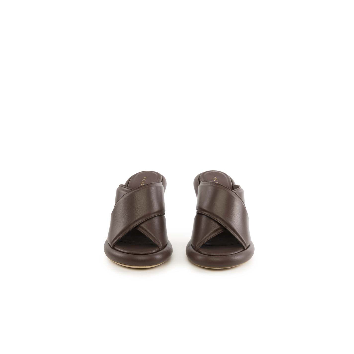 Brown Dosh crossover slip-ons made from raised, overlapping bands of soft nappa leather. Leather sole, leather-covered curved platform, and matt coated "slash" heel. Comfortable leather-covered insole. Made in Italy.