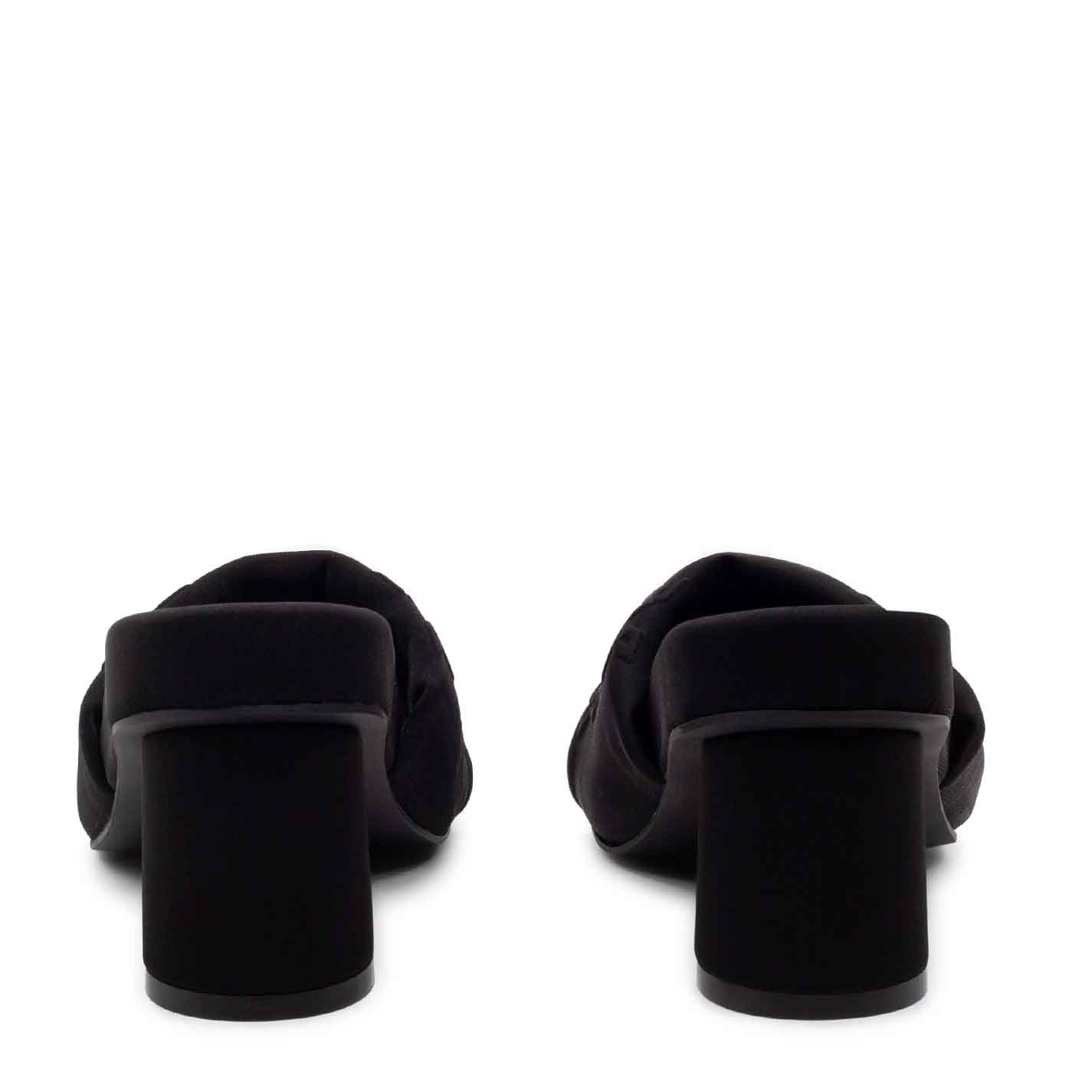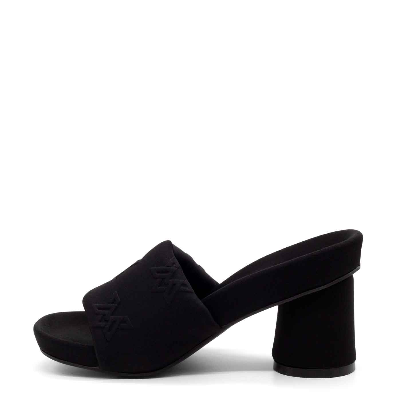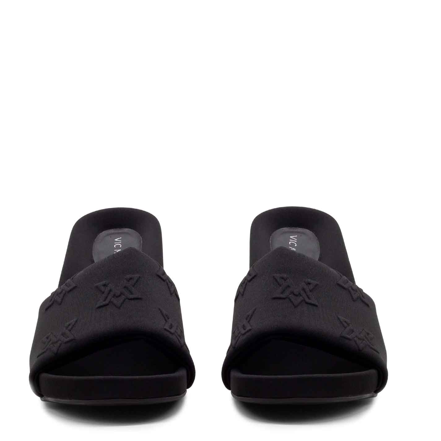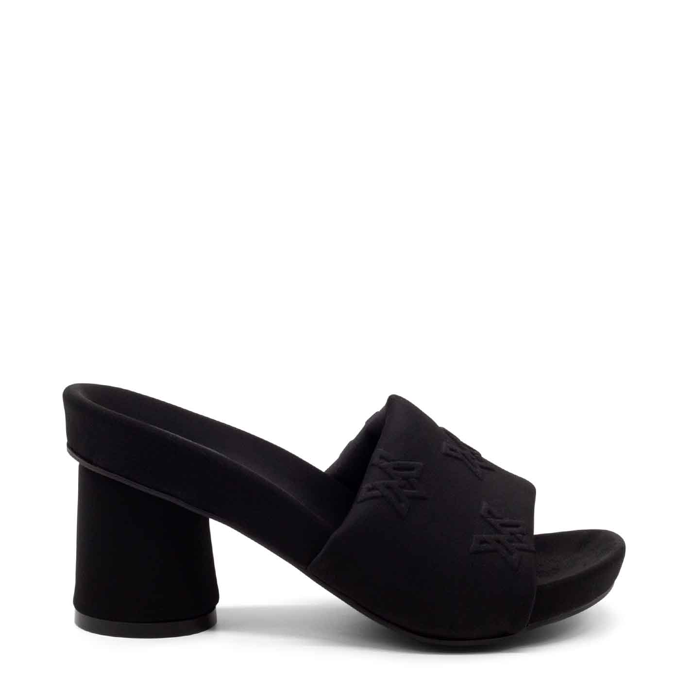 Bubble Heel slip-ons in black lycra with padding and raised monogram detailing. Insole covered in lycra that is tone on tone with the upper and the under heel. Cylindrical heel covered in black lycra. Rubber sole. Made in Italy.