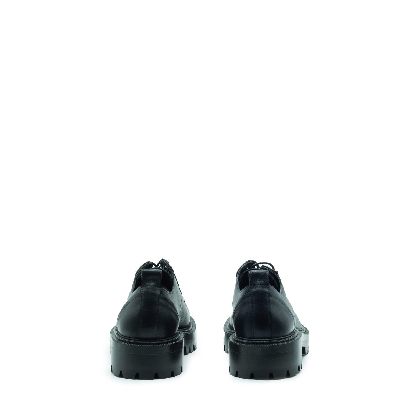 Car minimal black Derby shoes, crafted from semi-shiny calfskin. This model features a cleated rubber sole with fake welted construction, and footbed covered in calfskin. Made in Italy.