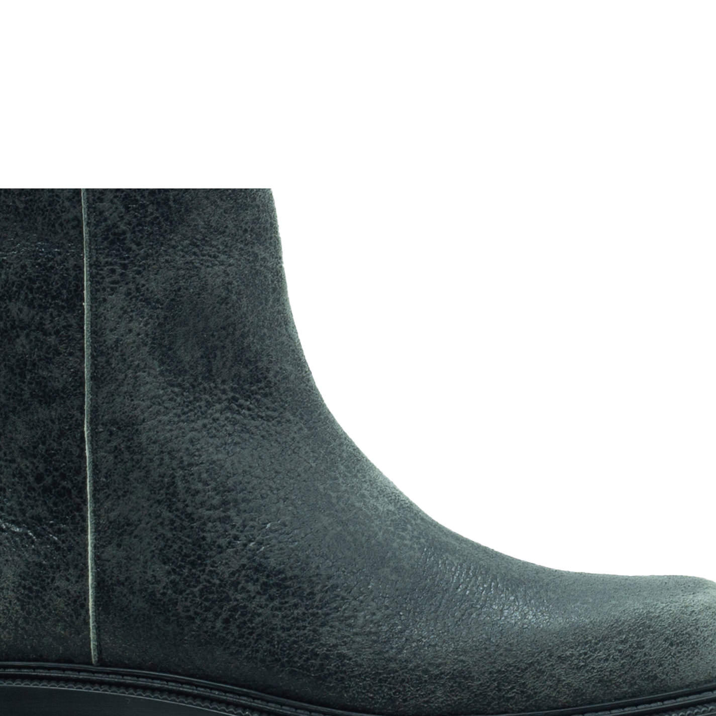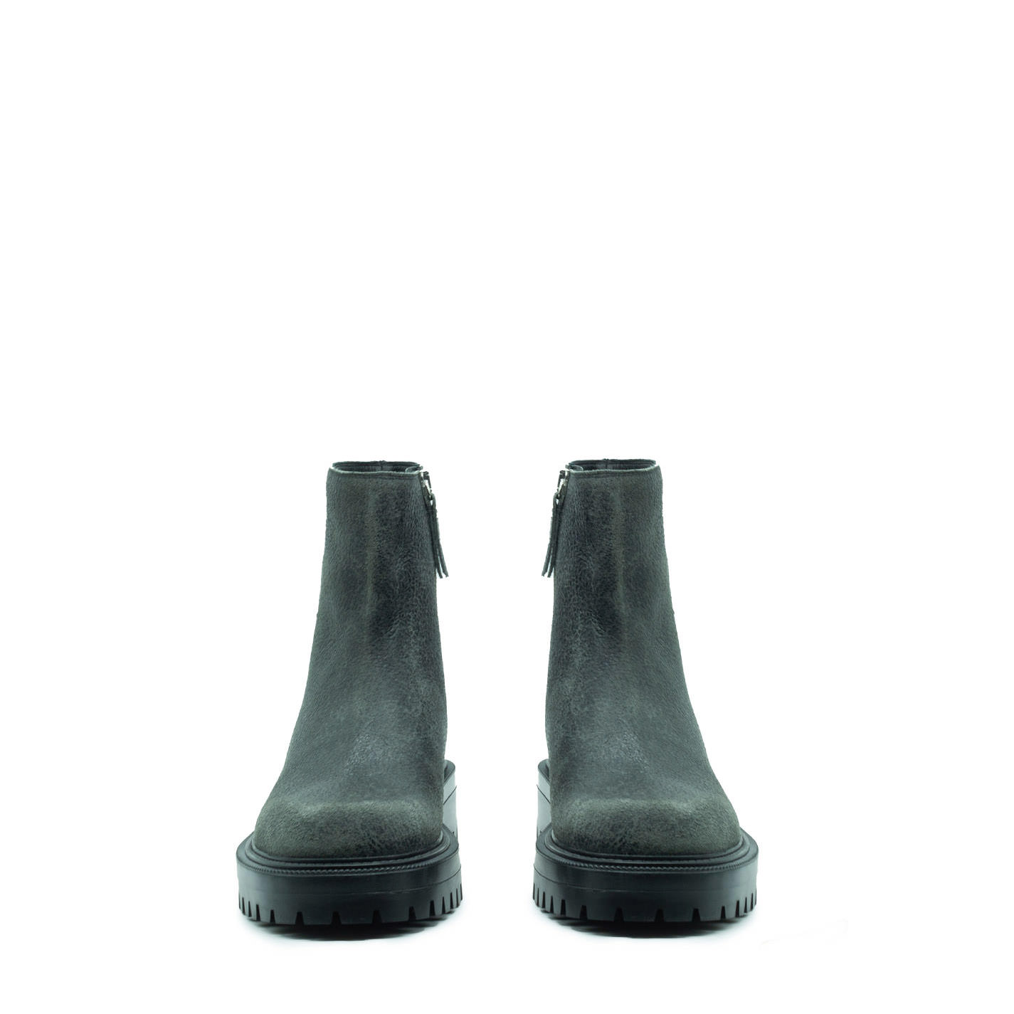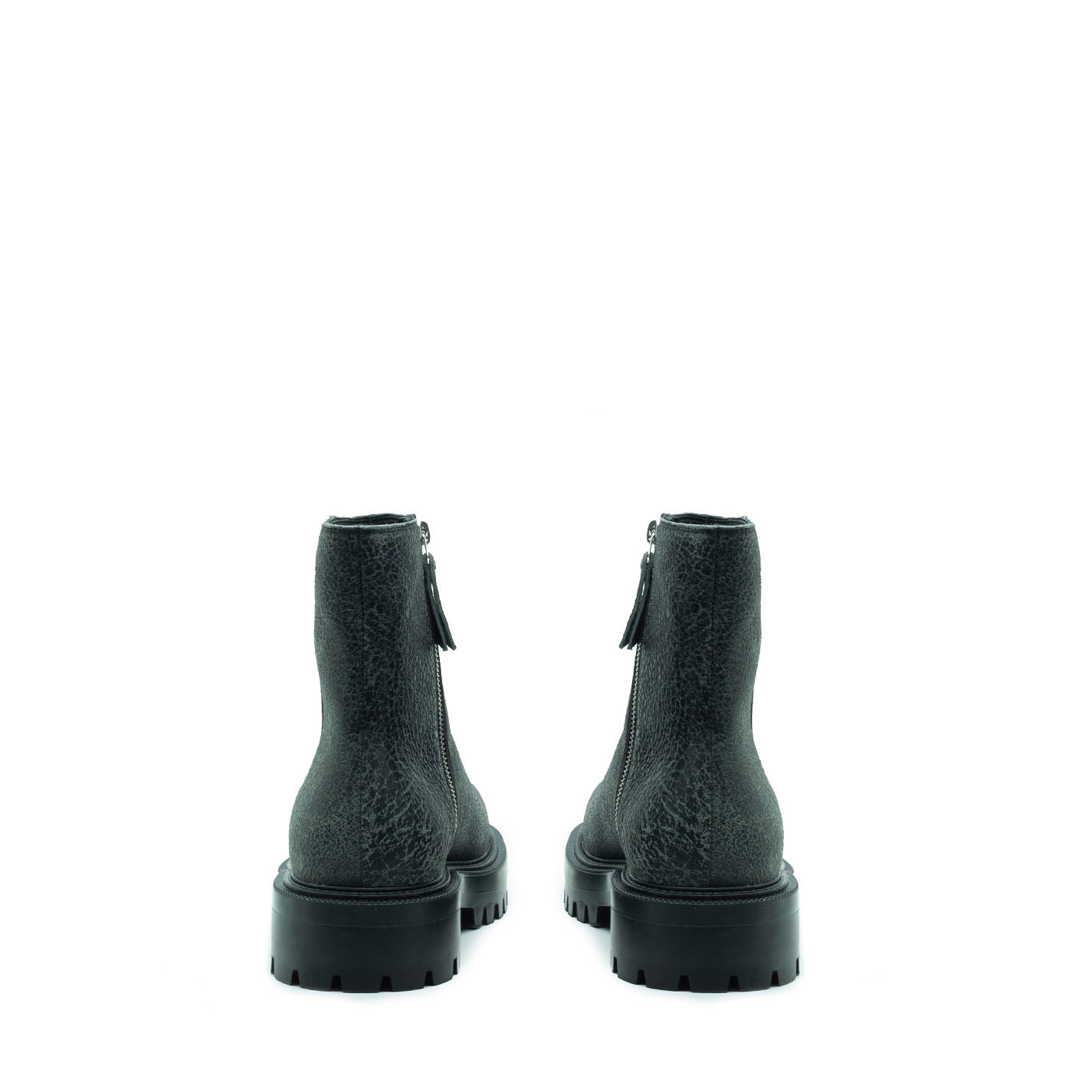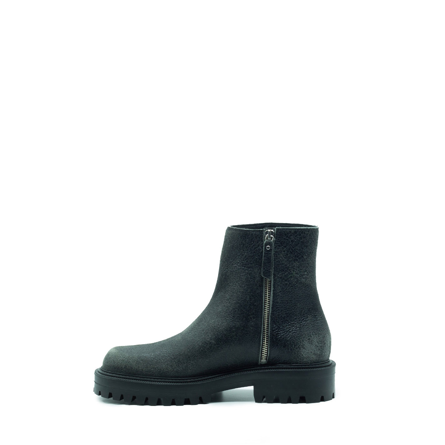 Car grey biker boots, crafted from 1990s "punk-style" cracked-effect leather, with internal metal zip for an easier fit. This model features a cleated rubber sole with fake welted construction, and footbed covered in calfskin. Made in Italy.