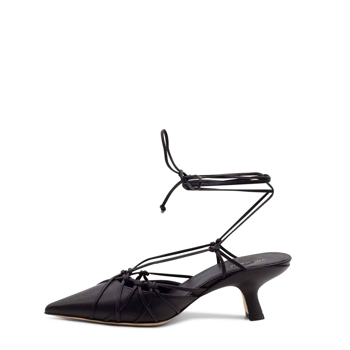 Chanel woven slash mules in soft black nappa, with a cage of interwoven and knotted leather laces fastened at the ankle. Very feminine pointed-toe shape and "slash" heel with matt finish. Leather sole. Made in Italy.