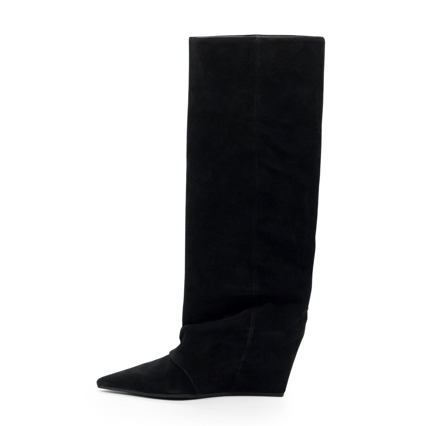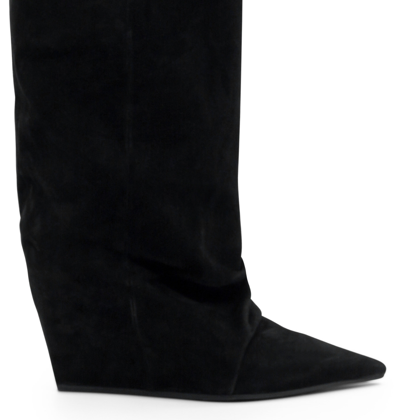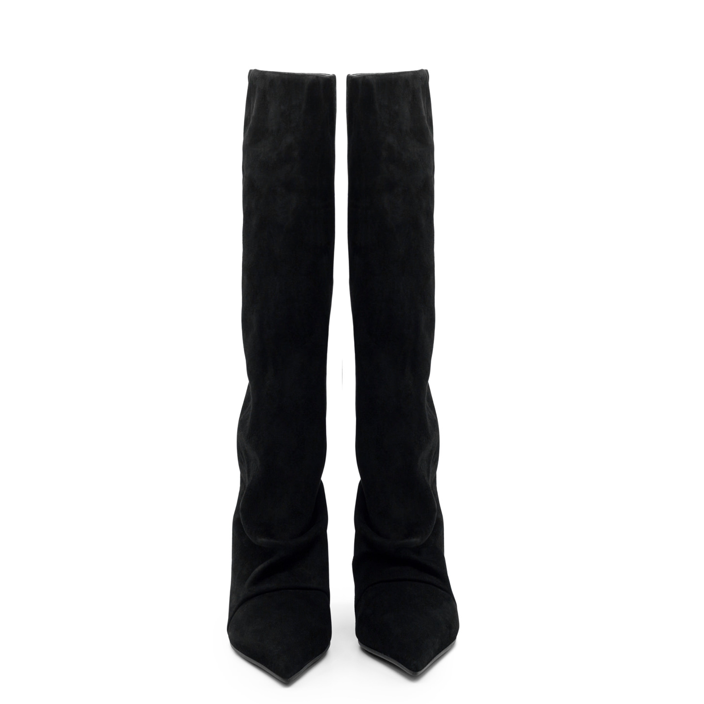 Cocoon minimal black tubular boots, crafted from soft suede, with front pleats. This model features a leather-covered platform, tapered tip, and non-slip rubber sole. Made in Italy.