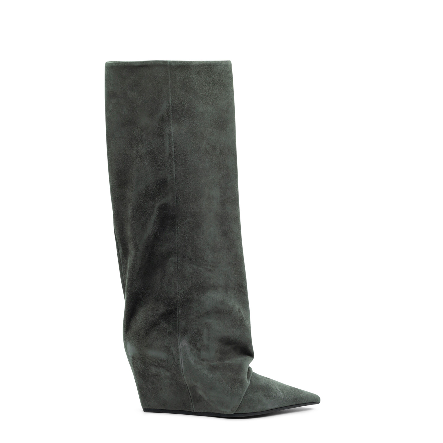 Cocoon minimal mud tubular boots, crafted from soft suede, with front pleats. This model features a leather-covered platform, tapered tip, and non-slip rubber sole. Made in Italy.