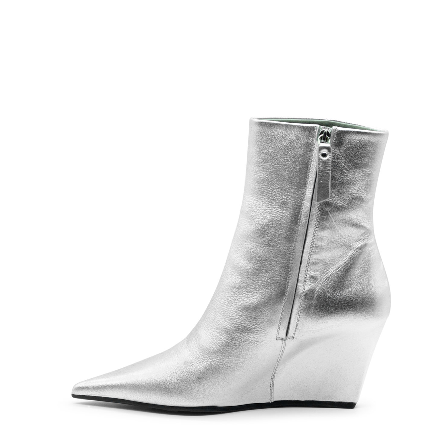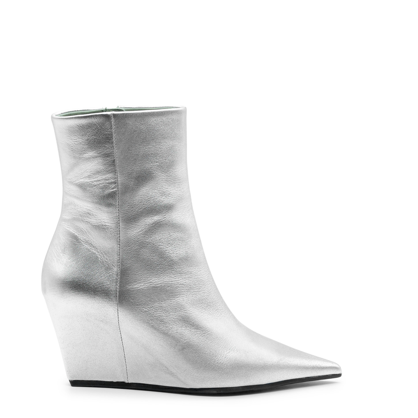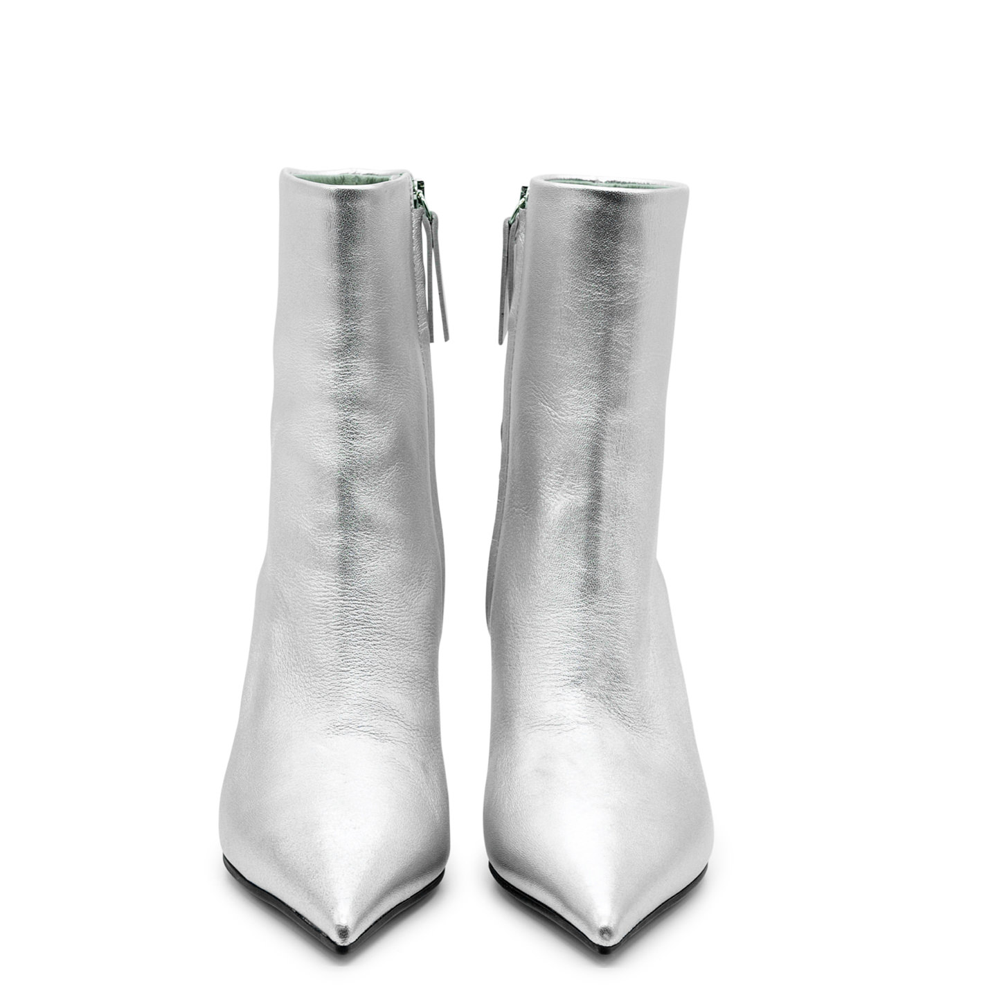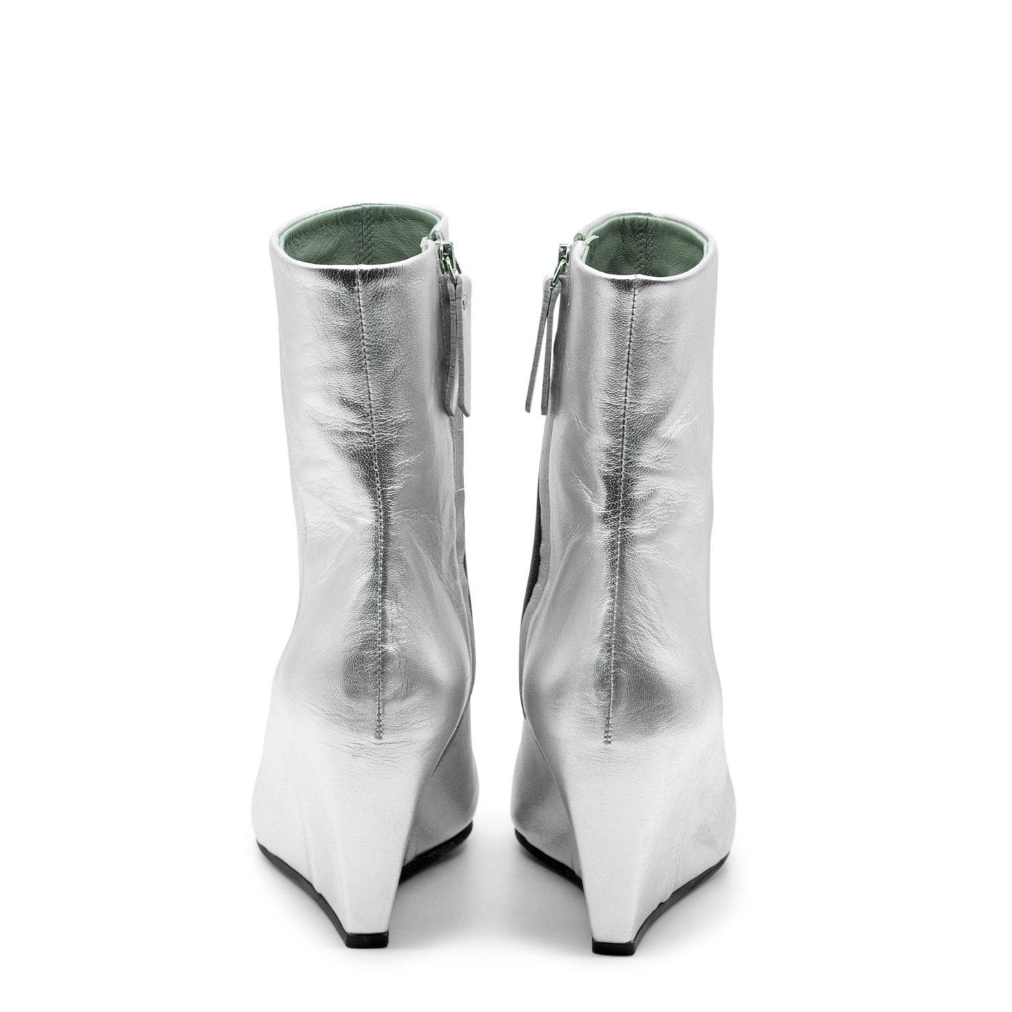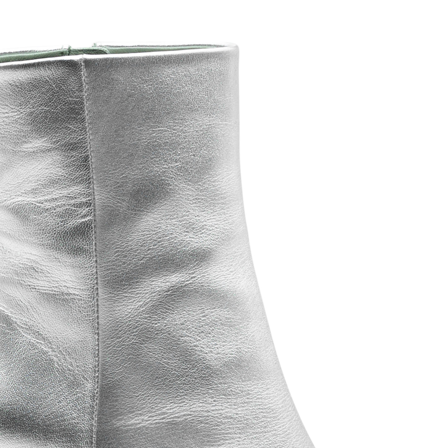 Cocoon minimal silver shiny Nappa leather half boots, with hidden zip for an easier fit. This model features a leather-covered platform, tapered tip, and non-slip rubber sole. Made in Italy.