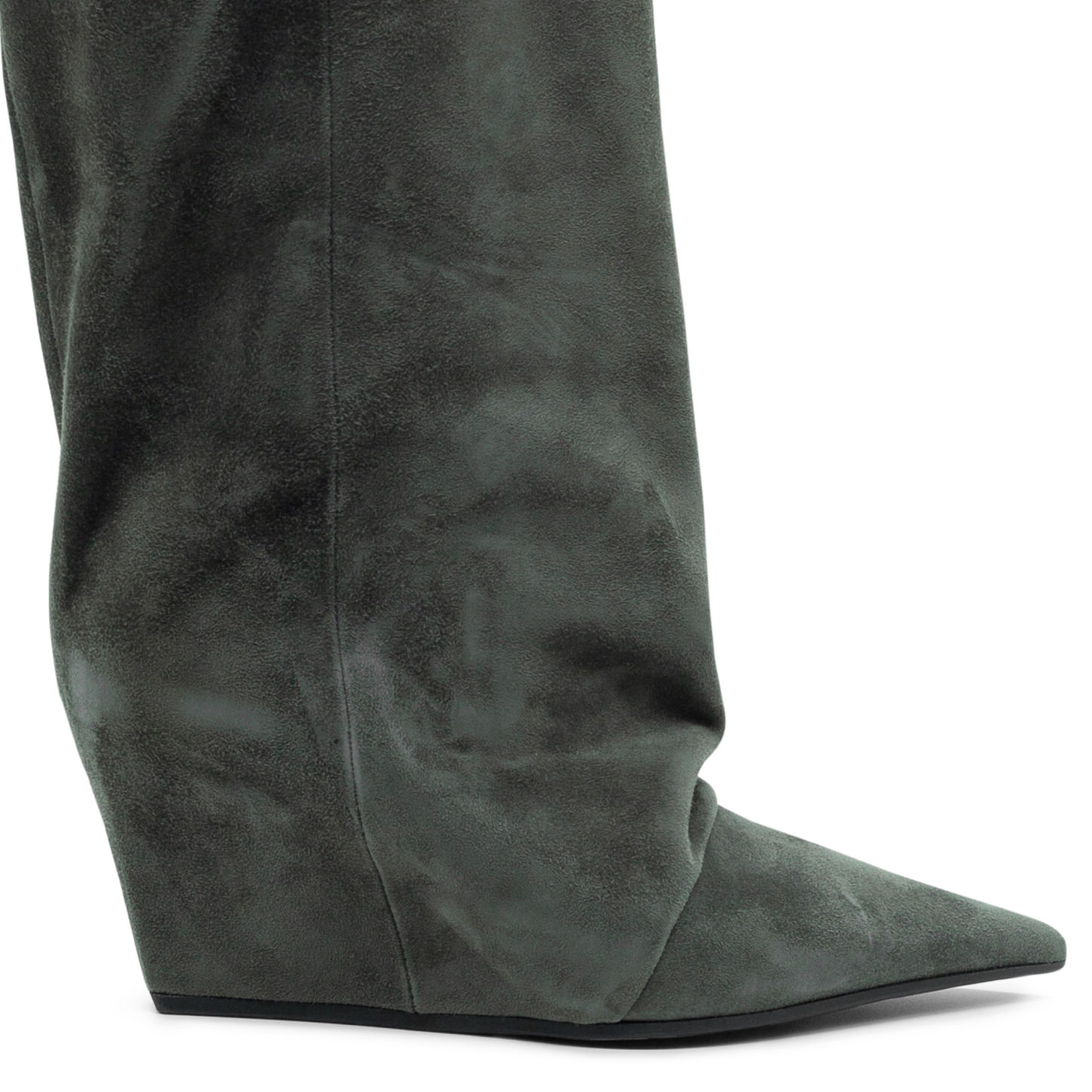 Cocoon minimal mud tubular boots, crafted from soft suede, with front pleats. This model features a leather-covered platform, tapered tip, and non-slip rubber sole. Made in Italy.