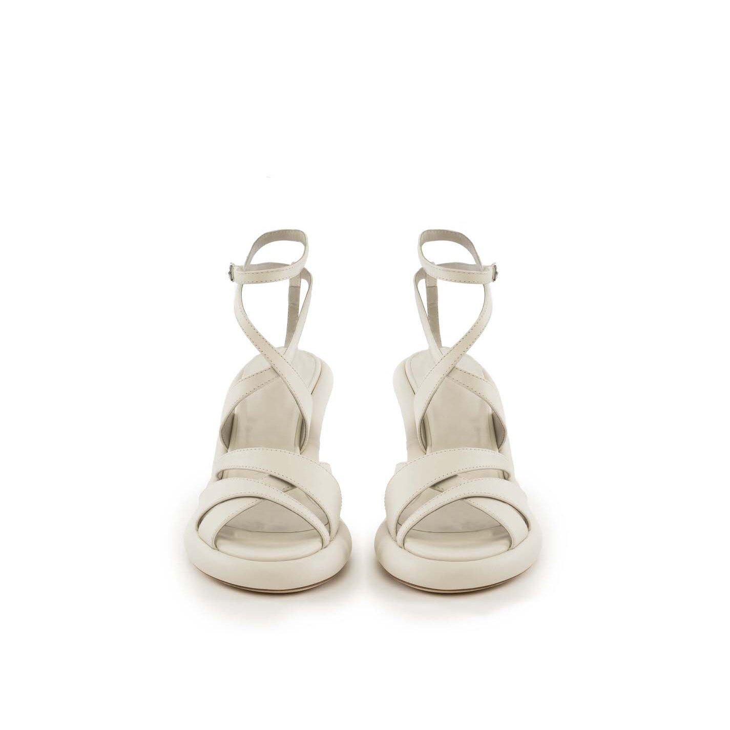 Cream Dosh sandals in matte calfskin, with moulded criss-crossing bands at the front and adjustable ankle strap. Leather sole, leather-covered curved platform, and matt coated "slash" heel. Comfortable leather-covered insole. Made in Italy.