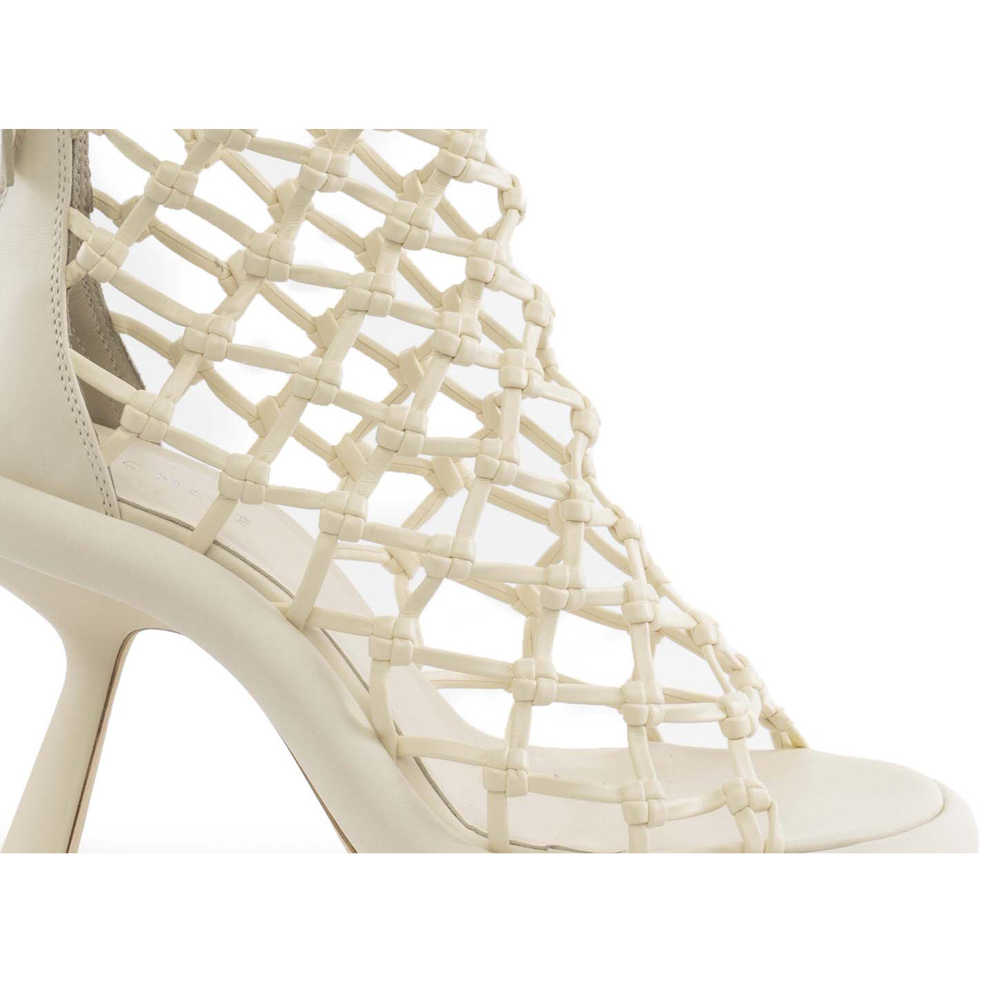 Cream Dosh woven ankle boots made entirely from faux leather strips knotted to one another, with leather heel counter and rear zip to help put them on. Leather sole, leather-covered curved platform, and matt coated "slash" heel. Comfortable leather-covered insole. Made in Italy.