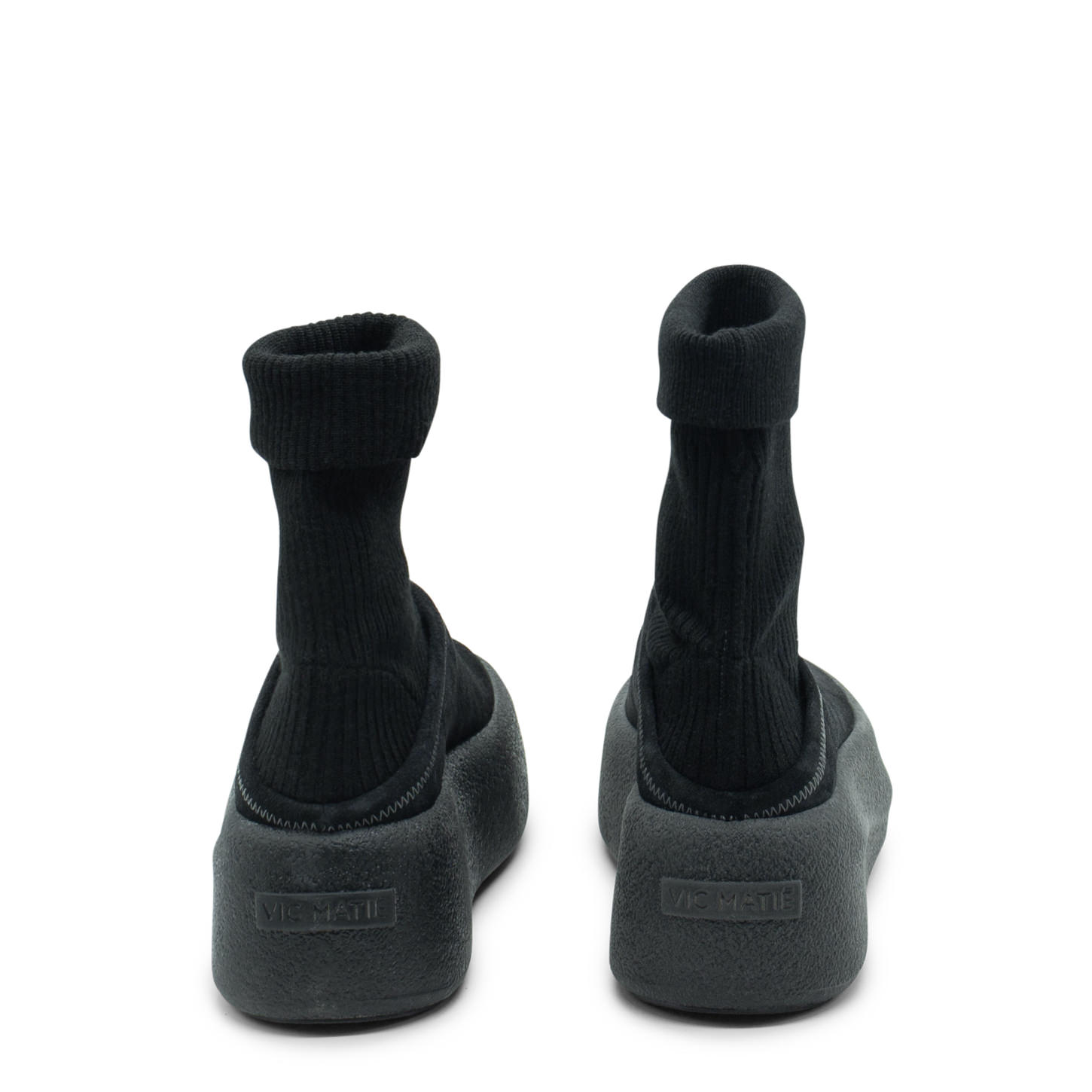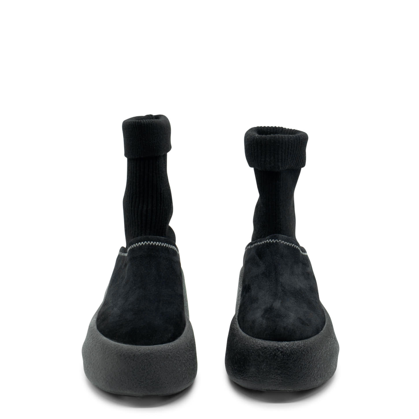 Creepy black half boots, crafted from split calfskin, with ribbed wool blend boot leg attached to the slide and contrasting zigzag seams on the front. This model is fitted with a slightly protruding crepe platform and a soft footbed covered in leather. Made in Italy.
